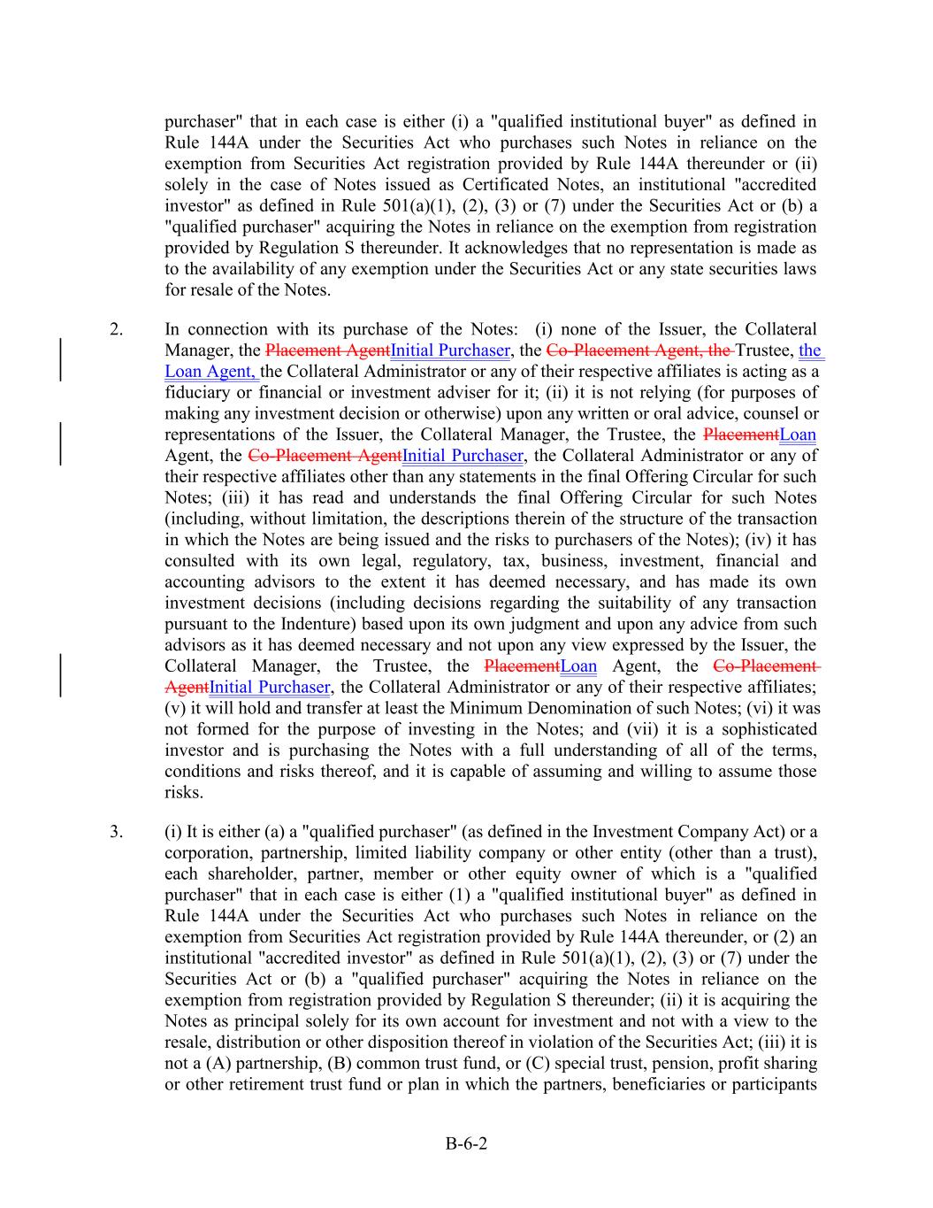 purchaser" that in each case is either (i) a "qualified institutional buyer" as defined in Rule 144A under the Securities Act who purchases such Notes in reliance on the exemption from Securities Act registration provided by Rule 144A thereunder or (ii) solely in the case of Notes issued as Certificated Notes, an institutional "accredited investor" as defined in Rule 501(a)(1), (2), (3) or (7) under the Securities Act or (b) a "qualified purchaser" acquiring the Notes in reliance on the exemption from registration provided by Regulation S thereunder. It acknowledges that no representation is made as to the availability of any exemption under the Securities Act or any state securities laws for resale of the Notes. 2. In connection with its purchase of the Notes: (i) none of the Issuer, the Collateral Manager, the Placement AgentInitial Purchaser, the Co-Placement Agent, the Trustee, the Loan Agent, the Collateral Administrator or any of their respective affiliates is acting as a fiduciary or financial or investment adviser for it; (ii) it is not relying (for purposes of making any investment decision or otherwise) upon any written or oral advice, counsel or representations of the Issuer, the Collateral Manager, the Trustee, the PlacementLoan Agent, the Co-Placement AgentInitial Purchaser, the Collateral Administrator or any of their respective affiliates other than any statements in the final Offering Circular for such Notes; (iii) it has read and understands the final Offering Circular for such Notes (including, without limitation, the descriptions therein of the structure of the transaction in which the Notes are being issued and the risks to purchasers of the Notes); (iv) it has consulted with its own legal, regulatory, tax, business, investment, financial and accounting advisors to the extent it has deemed necessary, and has made its own investment decisions (including decisions regarding the suitability of any transaction pursuant to the Indenture) based upon its own judgment and upon any advice from such advisors as it has deemed necessary and not upon any view expressed by the Issuer, the Collateral Manager, the Trustee, the PlacementLoan Agent, the Co-Placement AgentInitial Purchaser, the Collateral Administrator or any of their respective affiliates; (v) it will hold and transfer at least the Minimum Denomination of such Notes; (vi) it was not formed for the purpose of investing in the Notes; and (vii) it is a sophisticated investor and is purchasing the Notes with a full understanding of all of the terms, conditions and risks thereof, and it is capable of assuming and willing to assume those risks. 3. (i) It is either (a) a "qualified purchaser" (as defined in the Investment Company Act) or a corporation, partnership, limited liability company or other entity (other than a trust), each shareholder, partner, member or other equity owner of which is a "qualified purchaser" that in each case is either (1) a "qualified institutional buyer" as defined in Rule 144A under the Securities Act who purchases such Notes in reliance on the exemption from Securities Act registration provided by Rule 144A thereunder, or (2) an institutional "accredited investor" as defined in Rule 501(a)(1), (2), (3) or (7) under the Securities Act or (b) a "qualified purchaser" acquiring the Notes in reliance on the exemption from registration provided by Regulation S thereunder; (ii) it is acquiring the Notes as principal solely for its own account for investment and not with a view to the resale, distribution or other disposition thereof in violation of the Securities Act; (iii) it is not a (A) partnership, (B) common trust fund, or (C) special trust, pension, profit sharing or other retirement trust fund or plan in which the partners, beneficiaries or participants B-6-2