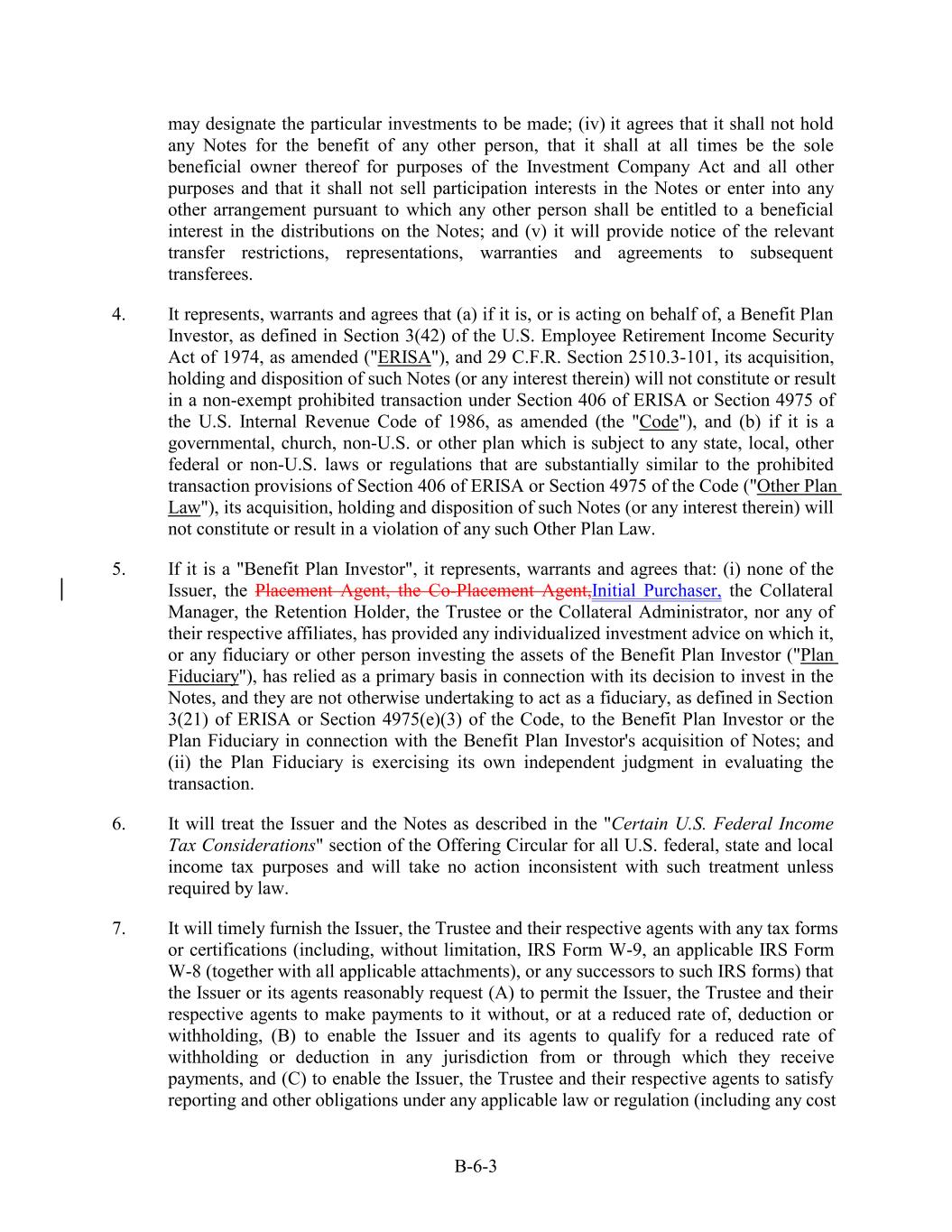 may designate the particular investments to be made; (iv) it agrees that it shall not hold any Notes for the benefit of any other person, that it shall at all times be the sole beneficial owner thereof for purposes of the Investment Company Act and all other purposes and that it shall not sell participation interests in the Notes or enter into any other arrangement pursuant to which any other person shall be entitled to a beneficial interest in the distributions on the Notes; and (v) it will provide notice of the relevant transfer restrictions, representations, warranties and agreements to subsequent transferees. 4. It represents, warrants and agrees that (a) if it is, or is acting on behalf of, a Benefit Plan Investor, as defined in Section 3(42) of the U.S. Employee Retirement Income Security Act of 1974, as amended ("ERISA"), and 29 C.F.R. Section 2510.3-101, its acquisition, holding and disposition of such Notes (or any interest therein) will not constitute or result in a non-exempt prohibited transaction under Section 406 of ERISA or Section 4975 of the U.S. Internal Revenue Code of 1986, as amended (the "Code"), and (b) if it is a governmental, church, non-U.S. or other plan which is subject to any state, local, other federal or non-U.S. laws or regulations that are substantially similar to the prohibited transaction provisions of Section 406 of ERISA or Section 4975 of the Code ("Other Plan Law"), its acquisition, holding and disposition of such Notes (or any interest therein) will not constitute or result in a violation of any such Other Plan Law. 5. If it is a "Benefit Plan Investor", it represents, warrants and agrees that: (i) none of the Issuer, the Placement Agent, the Co-Placement Agent,Initial Purchaser, the Collateral Manager, the Retention Holder, the Trustee or the Collateral Administrator, nor any of their respective affiliates, has provided any individualized investment advice on which it, or any fiduciary or other person investing the assets of the Benefit Plan Investor ("Plan Fiduciary"), has relied as a primary basis in connection with its decision to invest in the Notes, and they are not otherwise undertaking to act as a fiduciary, as defined in Section 3(21) of ERISA or Section 4975(e)(3) of the Code, to the Benefit Plan Investor or the Plan Fiduciary in connection with the Benefit Plan Investor's acquisition of Notes; and (ii) the Plan Fiduciary is exercising its own independent judgment in evaluating the transaction. 6. It will treat the Issuer and the Notes as described in the "Certain U.S. Federal Income Tax Considerations" section of the Offering Circular for all U.S. federal, state and local income tax purposes and will take no action inconsistent with such treatment unless required by law. 7. It will timely furnish the Issuer, the Trustee and their respective agents with any tax forms or certifications (including, without limitation, IRS Form W-9, an applicable IRS Form W-8 (together with all applicable attachments), or any successors to such IRS forms) that the Issuer or its agents reasonably request (A) to permit the Issuer, the Trustee and their respective agents to make payments to it without, or at a reduced rate of, deduction or withholding, (B) to enable the Issuer and its agents to qualify for a reduced rate of withholding or deduction in any jurisdiction from or through which they receive payments, and (C) to enable the Issuer, the Trustee and their respective agents to satisfy reporting and other obligations under any applicable law or regulation (including any cost B-6-3