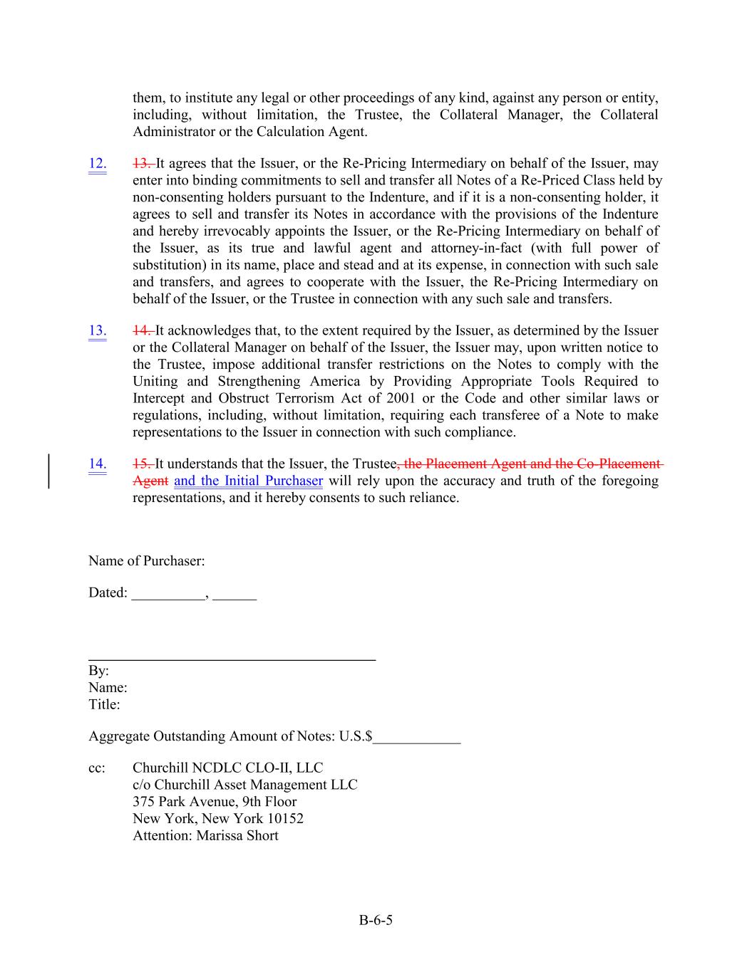 them, to institute any legal or other proceedings of any kind, against any person or entity, including, without limitation, the Trustee, the Collateral Manager, the Collateral Administrator or the Calculation Agent. 12. 13. It agrees that the Issuer, or the Re-Pricing Intermediary on behalf of the Issuer, may enter into binding commitments to sell and transfer all Notes of a Re-Priced Class held by non-consenting holders pursuant to the Indenture, and if it is a non-consenting holder, it agrees to sell and transfer its Notes in accordance with the provisions of the Indenture and hereby irrevocably appoints the Issuer, or the Re-Pricing Intermediary on behalf of the Issuer, as its true and lawful agent and attorney-in-fact (with full power of substitution) in its name, place and stead and at its expense, in connection with such sale and transfers, and agrees to cooperate with the Issuer, the Re-Pricing Intermediary on behalf of the Issuer, or the Trustee in connection with any such sale and transfers. 13. 14. It acknowledges that, to the extent required by the Issuer, as determined by the Issuer or the Collateral Manager on behalf of the Issuer, the Issuer may, upon written notice to the Trustee, impose additional transfer restrictions on the Notes to comply with the Uniting and Strengthening America by Providing Appropriate Tools Required to Intercept and Obstruct Terrorism Act of 2001 or the Code and other similar laws or regulations, including, without limitation, requiring each transferee of a Note to make representations to the Issuer in connection with such compliance. 14. 15. It understands that the Issuer, the Trustee, the Placement Agent and the Co-Placement Agent and the Initial Purchaser will rely upon the accuracy and truth of the foregoing representations, and it hereby consents to such reliance. Name of Purchaser: Dated: __________, ______ By: Name: Title: Aggregate Outstanding Amount of Notes: U.S.$____________ cc: Churchill NCDLC CLO-II, LLC c/o Churchill Asset Management LLC 375 Park Avenue, 9th Floor New York, New York 10152 Attention: Marissa Short B-6-5