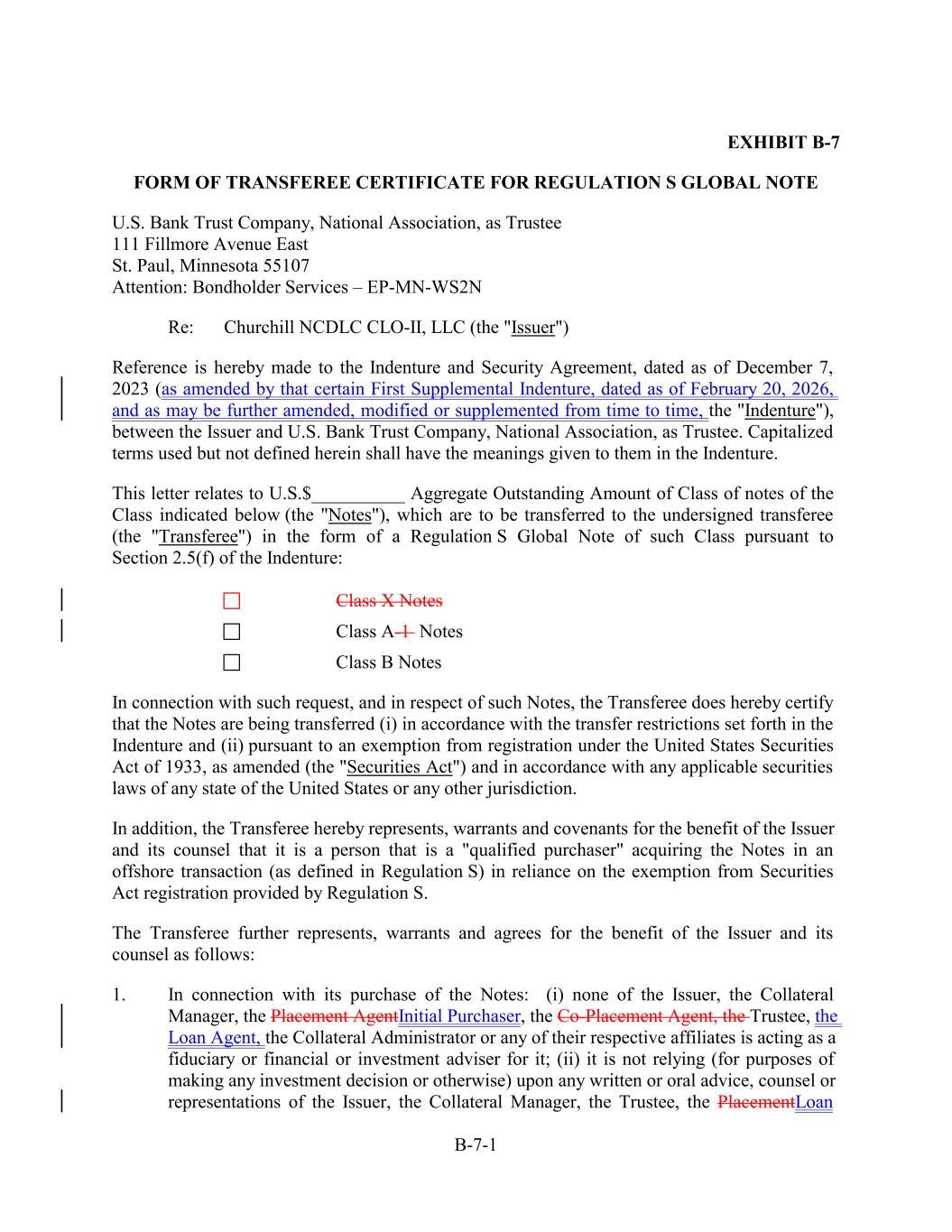 EXHIBIT B-7 FORM OF TRANSFEREE CERTIFICATE FOR REGULATION S GLOBAL NOTE U.S. Bank Trust Company, National Association, as Trustee 111 Fillmore Avenue East St. Paul, Minnesota 55107 Attention: Bondholder Services – EP-MN-WS2N Re: Churchill NCDLC CLO-II, LLC (the "Issuer") Reference is hereby made to the Indenture and Security Agreement, dated as of December 7, 2023 (as amended by that certain First Supplemental Indenture, dated as of February 20, 2026, and as may be further amended, modified or supplemented from time to time, the "Indenture"), between the Issuer and U.S. Bank Trust Company, National Association, as Trustee. Capitalized terms used but not defined herein shall have the meanings given to them in the Indenture. This letter relates to U.S.$__________ Aggregate Outstanding Amount of Class of notes of the Class indicated below (the "Notes"), which are to be transferred to the undersigned transferee (the "Transferee") in the form of a Regulation S Global Note of such Class pursuant to Section 2.5(f) of the Indenture: Class X Notes Class A-1 Notes Class B Notes In connection with such request, and in respect of such Notes, the Transferee does hereby certify that the Notes are being transferred (i) in accordance with the transfer restrictions set forth in the Indenture and (ii) pursuant to an exemption from registration under the United States Securities Act of 1933, as amended (the "Securities Act") and in accordance with any applicable securities laws of any state of the United States or any other jurisdiction. In addition, the Transferee hereby represents, warrants and covenants for the benefit of the Issuer and its counsel that it is a person that is a "qualified purchaser" acquiring the Notes in an offshore transaction (as defined in Regulation S) in reliance on the exemption from Securities Act registration provided by Regulation S. The Transferee further represents, warrants and agrees for the benefit of the Issuer and its counsel as follows: 1. In connection with its purchase of the Notes: (i) none of the Issuer, the Collateral Manager, the Placement AgentInitial Purchaser, the Co-Placement Agent, the Trustee, the Loan Agent, the Collateral Administrator or any of their respective affiliates is acting as a fiduciary or financial or investment adviser for it; (ii) it is not relying (for purposes of making any investment decision or otherwise) upon any written or oral advice, counsel or representations of the Issuer, the Collateral Manager, the Trustee, the PlacementLoan B-7-1