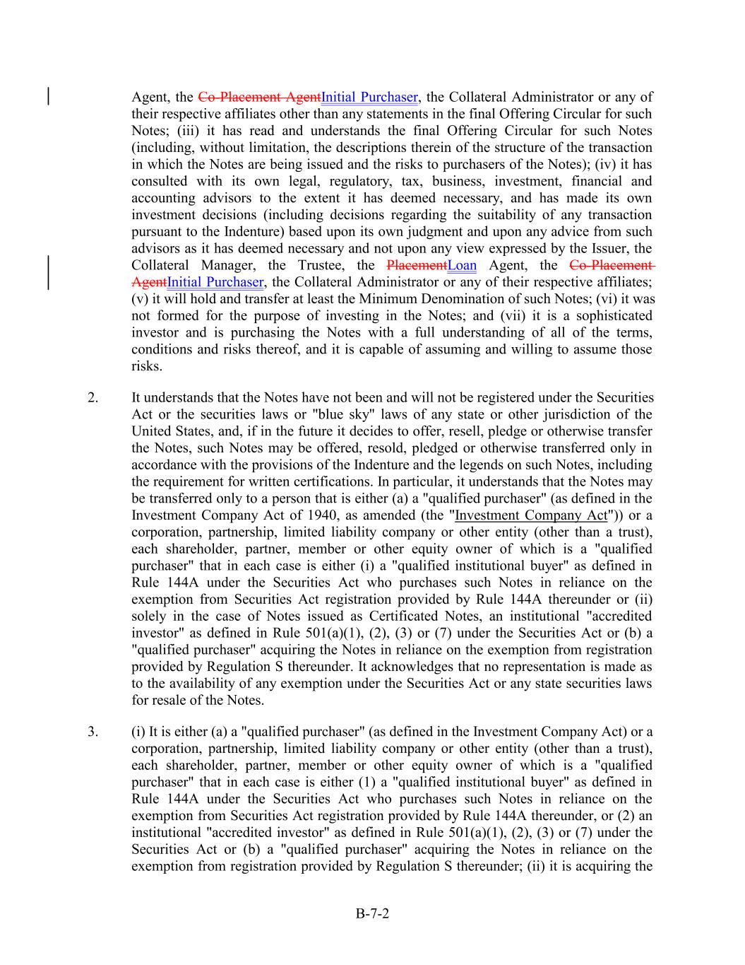 Agent, the Co-Placement AgentInitial Purchaser, the Collateral Administrator or any of their respective affiliates other than any statements in the final Offering Circular for such Notes; (iii) it has read and understands the final Offering Circular for such Notes (including, without limitation, the descriptions therein of the structure of the transaction in which the Notes are being issued and the risks to purchasers of the Notes); (iv) it has consulted with its own legal, regulatory, tax, business, investment, financial and accounting advisors to the extent it has deemed necessary, and has made its own investment decisions (including decisions regarding the suitability of any transaction pursuant to the Indenture) based upon its own judgment and upon any advice from such advisors as it has deemed necessary and not upon any view expressed by the Issuer, the Collateral Manager, the Trustee, the PlacementLoan Agent, the Co-Placement AgentInitial Purchaser, the Collateral Administrator or any of their respective affiliates; (v) it will hold and transfer at least the Minimum Denomination of such Notes; (vi) it was not formed for the purpose of investing in the Notes; and (vii) it is a sophisticated investor and is purchasing the Notes with a full understanding of all of the terms, conditions and risks thereof, and it is capable of assuming and willing to assume those risks. 2. It understands that the Notes have not been and will not be registered under the Securities Act or the securities laws or "blue sky" laws of any state or other jurisdiction of the United States, and, if in the future it decides to offer, resell, pledge or otherwise transfer the Notes, such Notes may be offered, resold, pledged or otherwise transferred only in accordance with the provisions of the Indenture and the legends on such Notes, including the requirement for written certifications. In particular, it understands that the Notes may be transferred only to a person that is either (a) a "qualified purchaser" (as defined in the Investment Company Act of 1940, as amended (the "Investment Company Act")) or a corporation, partnership, limited liability company or other entity (other than a trust), each shareholder, partner, member or other equity owner of which is a "qualified purchaser" that in each case is either (i) a "qualified institutional buyer" as defined in Rule 144A under the Securities Act who purchases such Notes in reliance on the exemption from Securities Act registration provided by Rule 144A thereunder or (ii) solely in the case of Notes issued as Certificated Notes, an institutional "accredited investor" as defined in Rule 501(a)(1), (2), (3) or (7) under the Securities Act or (b) a "qualified purchaser" acquiring the Notes in reliance on the exemption from registration provided by Regulation S thereunder. It acknowledges that no representation is made as to the availability of any exemption under the Securities Act or any state securities laws for resale of the Notes. 3. (i) It is either (a) a "qualified purchaser" (as defined in the Investment Company Act) or a corporation, partnership, limited liability company or other entity (other than a trust), each shareholder, partner, member or other equity owner of which is a "qualified purchaser" that in each case is either (1) a "qualified institutional buyer" as defined in Rule 144A under the Securities Act who purchases such Notes in reliance on the exemption from Securities Act registration provided by Rule 144A thereunder, or (2) an institutional "accredited investor" as defined in Rule 501(a)(1), (2), (3) or (7) under the Securities Act or (b) a "qualified purchaser" acquiring the Notes in reliance on the exemption from registration provided by Regulation S thereunder; (ii) it is acquiring the B-7-2