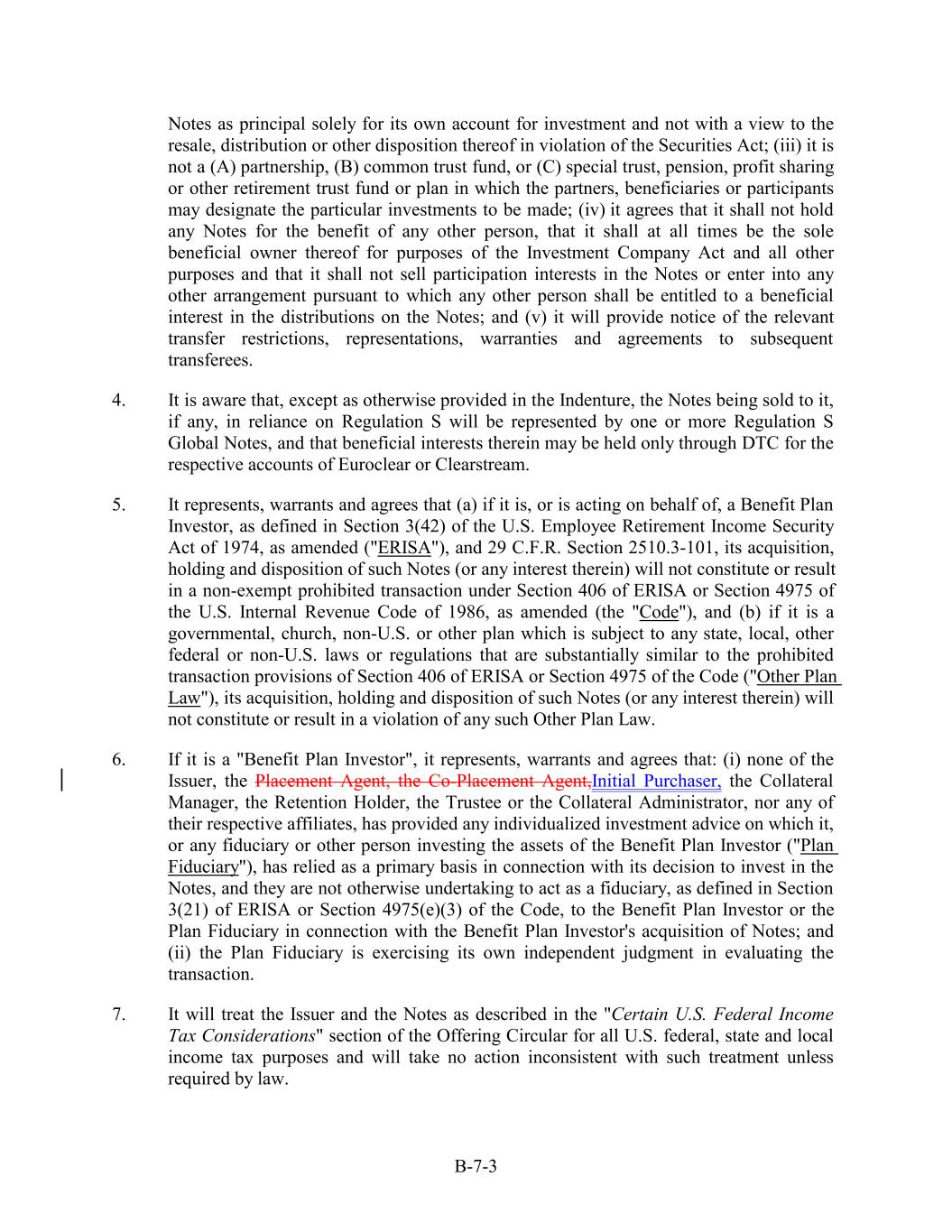 Notes as principal solely for its own account for investment and not with a view to the resale, distribution or other disposition thereof in violation of the Securities Act; (iii) it is not a (A) partnership, (B) common trust fund, or (C) special trust, pension, profit sharing or other retirement trust fund or plan in which the partners, beneficiaries or participants may designate the particular investments to be made; (iv) it agrees that it shall not hold any Notes for the benefit of any other person, that it shall at all times be the sole beneficial owner thereof for purposes of the Investment Company Act and all other purposes and that it shall not sell participation interests in the Notes or enter into any other arrangement pursuant to which any other person shall be entitled to a beneficial interest in the distributions on the Notes; and (v) it will provide notice of the relevant transfer restrictions, representations, warranties and agreements to subsequent transferees. 4. It is aware that, except as otherwise provided in the Indenture, the Notes being sold to it, if any, in reliance on Regulation S will be represented by one or more Regulation S Global Notes, and that beneficial interests therein may be held only through DTC for the respective accounts of Euroclear or Clearstream. 5. It represents, warrants and agrees that (a) if it is, or is acting on behalf of, a Benefit Plan Investor, as defined in Section 3(42) of the U.S. Employee Retirement Income Security Act of 1974, as amended ("ERISA"), and 29 C.F.R. Section 2510.3-101, its acquisition, holding and disposition of such Notes (or any interest therein) will not constitute or result in a non-exempt prohibited transaction under Section 406 of ERISA or Section 4975 of the U.S. Internal Revenue Code of 1986, as amended (the "Code"), and (b) if it is a governmental, church, non-U.S. or other plan which is subject to any state, local, other federal or non-U.S. laws or regulations that are substantially similar to the prohibited transaction provisions of Section 406 of ERISA or Section 4975 of the Code ("Other Plan Law"), its acquisition, holding and disposition of such Notes (or any interest therein) will not constitute or result in a violation of any such Other Plan Law. 6. If it is a "Benefit Plan Investor", it represents, warrants and agrees that: (i) none of the Issuer, the Placement Agent, the Co-Placement Agent,Initial Purchaser, the Collateral Manager, the Retention Holder, the Trustee or the Collateral Administrator, nor any of their respective affiliates, has provided any individualized investment advice on which it, or any fiduciary or other person investing the assets of the Benefit Plan Investor ("Plan Fiduciary"), has relied as a primary basis in connection with its decision to invest in the Notes, and they are not otherwise undertaking to act as a fiduciary, as defined in Section 3(21) of ERISA or Section 4975(e)(3) of the Code, to the Benefit Plan Investor or the Plan Fiduciary in connection with the Benefit Plan Investor's acquisition of Notes; and (ii) the Plan Fiduciary is exercising its own independent judgment in evaluating the transaction. 7. It will treat the Issuer and the Notes as described in the "Certain U.S. Federal Income Tax Considerations" section of the Offering Circular for all U.S. federal, state and local income tax purposes and will take no action inconsistent with such treatment unless required by law. B-7-3