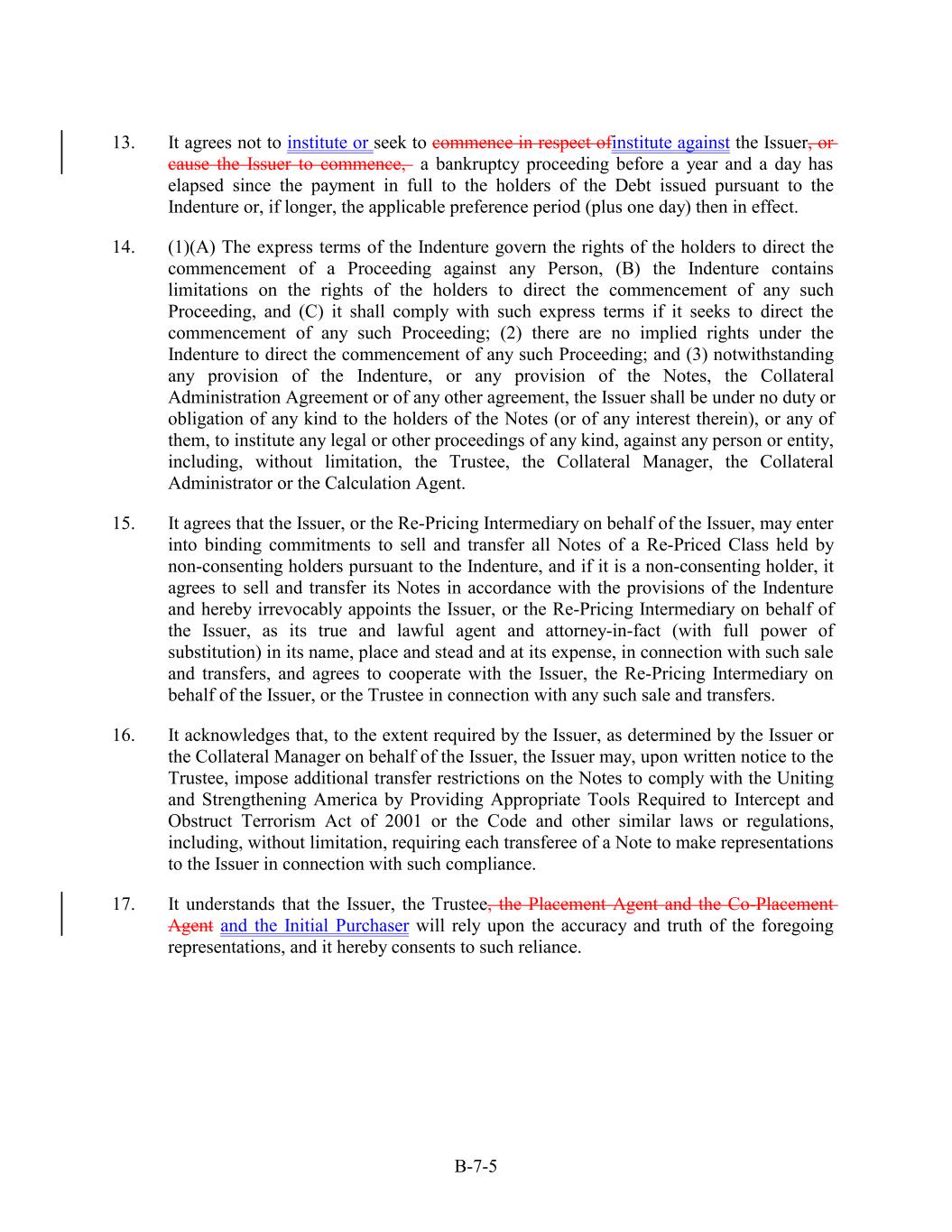 13. It agrees not to institute or seek to commence in respect ofinstitute against the Issuer, or cause the Issuer to commence, a bankruptcy proceeding before a year and a day has elapsed since the payment in full to the holders of the Debt issued pursuant to the Indenture or, if longer, the applicable preference period (plus one day) then in effect. 14. (1)(A) The express terms of the Indenture govern the rights of the holders to direct the commencement of a Proceeding against any Person, (B) the Indenture contains limitations on the rights of the holders to direct the commencement of any such Proceeding, and (C) it shall comply with such express terms if it seeks to direct the commencement of any such Proceeding; (2) there are no implied rights under the Indenture to direct the commencement of any such Proceeding; and (3) notwithstanding any provision of the Indenture, or any provision of the Notes, the Collateral Administration Agreement or of any other agreement, the Issuer shall be under no duty or obligation of any kind to the holders of the Notes (or of any interest therein), or any of them, to institute any legal or other proceedings of any kind, against any person or entity, including, without limitation, the Trustee, the Collateral Manager, the Collateral Administrator or the Calculation Agent. 15. It agrees that the Issuer, or the Re-Pricing Intermediary on behalf of the Issuer, may enter into binding commitments to sell and transfer all Notes of a Re-Priced Class held by non-consenting holders pursuant to the Indenture, and if it is a non-consenting holder, it agrees to sell and transfer its Notes in accordance with the provisions of the Indenture and hereby irrevocably appoints the Issuer, or the Re-Pricing Intermediary on behalf of the Issuer, as its true and lawful agent and attorney-in-fact (with full power of substitution) in its name, place and stead and at its expense, in connection with such sale and transfers, and agrees to cooperate with the Issuer, the Re-Pricing Intermediary on behalf of the Issuer, or the Trustee in connection with any such sale and transfers. 16. It acknowledges that, to the extent required by the Issuer, as determined by the Issuer or the Collateral Manager on behalf of the Issuer, the Issuer may, upon written notice to the Trustee, impose additional transfer restrictions on the Notes to comply with the Uniting and Strengthening America by Providing Appropriate Tools Required to Intercept and Obstruct Terrorism Act of 2001 or the Code and other similar laws or regulations, including, without limitation, requiring each transferee of a Note to make representations to the Issuer in connection with such compliance. 17. It understands that the Issuer, the Trustee, the Placement Agent and the Co-Placement Agent and the Initial Purchaser will rely upon the accuracy and truth of the foregoing representations, and it hereby consents to such reliance. B-7-5