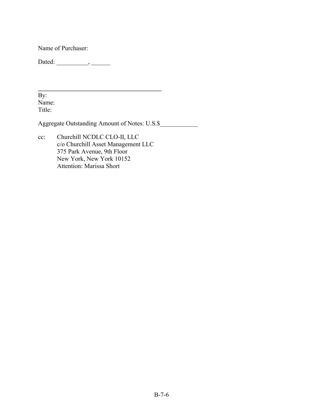 Name of Purchaser: Dated: __________, ______ By: Name: Title: Aggregate Outstanding Amount of Notes: U.S.$____________ cc: Churchill NCDLC CLO-II, LLC c/o Churchill Asset Management LLC 375 Park Avenue, 9th Floor New York, New York 10152 Attention: Marissa Short B-7-6