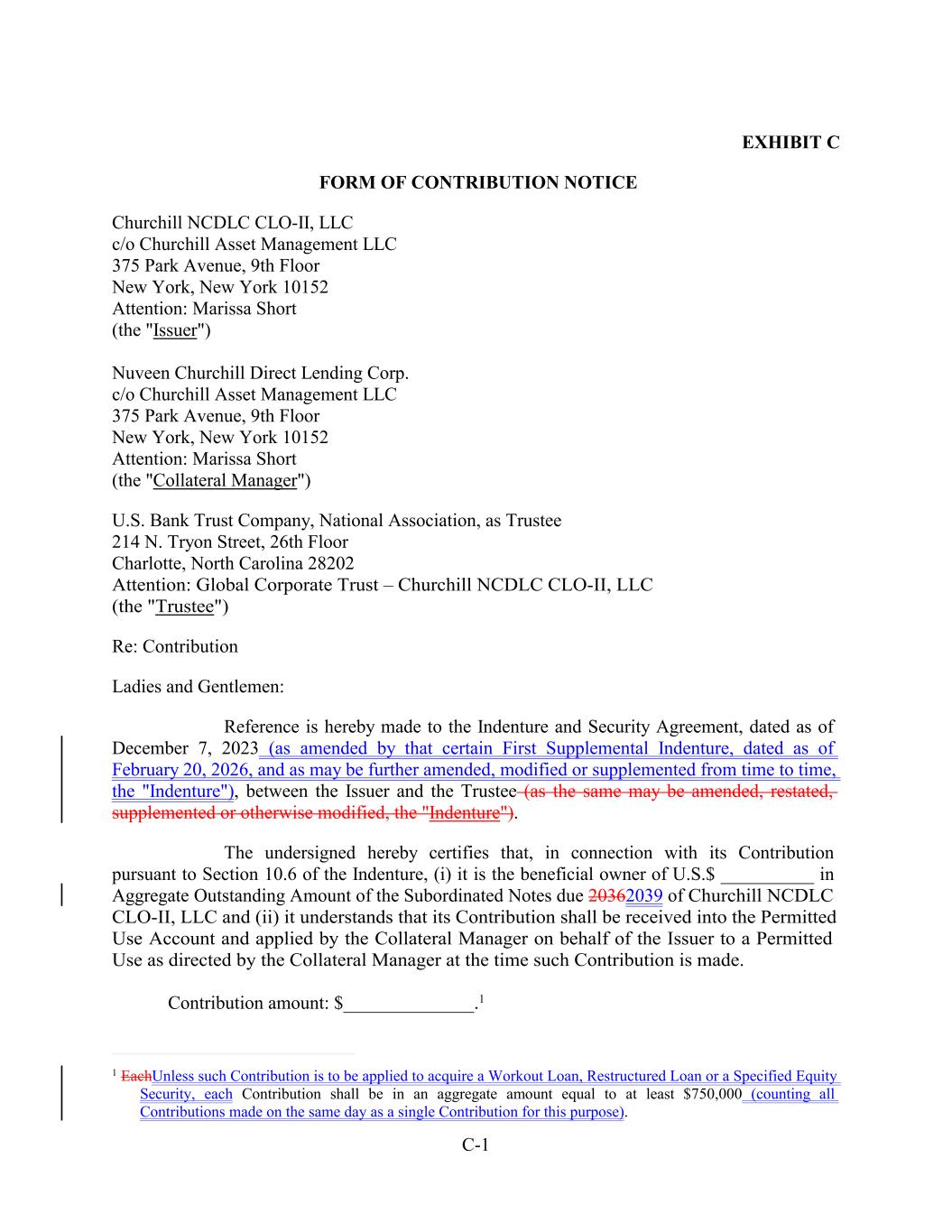 C-1 EXHIBIT C FORM OF CONTRIBUTION NOTICE Churchill NCDLC CLO-II, LLC c/o Churchill Asset Management LLC 375 Park Avenue, 9th Floor New York, New York 10152 Attention: Marissa Short (the "Issuer") Nuveen Churchill Direct Lending Corp. c/o Churchill Asset Management LLC 375 Park Avenue, 9th Floor New York, New York 10152 Attention: Marissa Short (the "Collateral Manager") U.S. Bank Trust Company, National Association, as Trustee 214 N. Tryon Street, 26th Floor Charlotte, North Carolina 28202 Attention: Global Corporate Trust – Churchill NCDLC CLO-II, LLC (the "Trustee") Re: Contribution Ladies and Gentlemen: Reference is hereby made to the Indenture and Security Agreement, dated as of December 7, 2023 (as amended by that certain First Supplemental Indenture, dated as of February 20, 2026, and as may be further amended, modified or supplemented from time to time, the "Indenture"), between the Issuer and the Trustee (as the same may be amended, restated, supplemented or otherwise modified, the "Indenture"). The undersigned hereby certifies that, in connection with its Contribution pursuant to Section 10.6 of the Indenture, (i) it is the beneficial owner of U.S.$ __________ in Aggregate Outstanding Amount of the Subordinated Notes due 20362039 of Churchill NCDLC CLO-II, LLC and (ii) it understands that its Contribution shall be received into the Permitted Use Account and applied by the Collateral Manager on behalf of the Issuer to a Permitted Use as directed by the Collateral Manager at the time such Contribution is made. Contribution amount: $______________.1 1 EachUnless such Contribution is to be applied to acquire a Workout Loan, Restructured Loan or a Specified Equity Security, each Contribution shall be in an aggregate amount equal to at least $750,000 (counting all Contributions made on the same day as a single Contribution for this purpose).