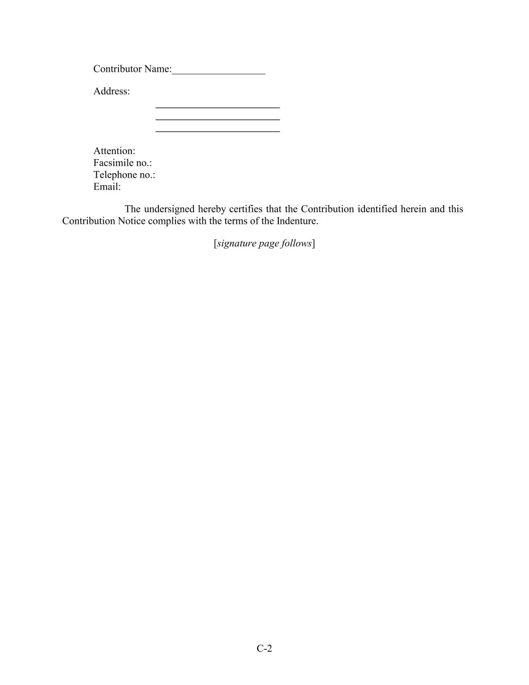 Contributor Name:__________________ Address: Attention: Facsimile no.: Telephone no.: Email: The undersigned hereby certifies that the Contribution identified herein and this Contribution Notice complies with the terms of the Indenture. [signature page follows] C-2