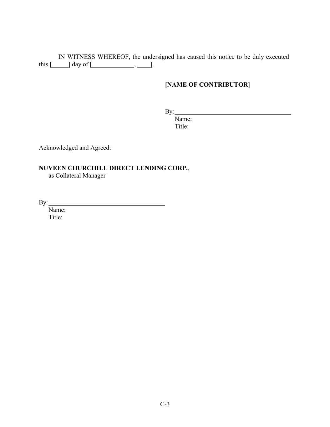 IN WITNESS WHEREOF, the undersigned has caused this notice to be duly executed this [_____] day of [_____________, ____]. [NAME OF CONTRIBUTOR] By: Name: Title: Acknowledged and Agreed: NUVEEN CHURCHILL DIRECT LENDING CORP., as Collateral Manager By: Name: Title: C-3