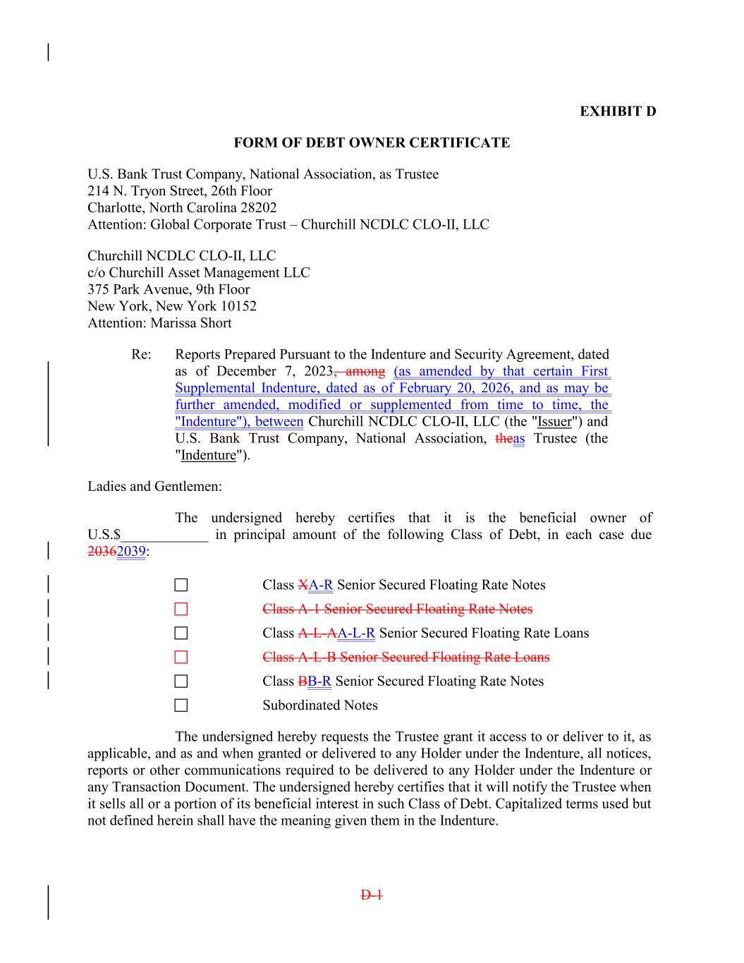 EXHIBIT D FORM OF DEBT OWNER CERTIFICATE U.S. Bank Trust Company, National Association, as Trustee 214 N. Tryon Street, 26th Floor Charlotte, North Carolina 28202 Attention: Global Corporate Trust – Churchill NCDLC CLO-II, LLC Churchill NCDLC CLO-II, LLC c/o Churchill Asset Management LLC 375 Park Avenue, 9th Floor New York, New York 10152 Attention: Marissa Short Re: Reports Prepared Pursuant to the Indenture and Security Agreement, dated as of December 7, 2023, among (as amended by that certain First Supplemental Indenture, dated as of February 20, 2026, and as may be further amended, modified or supplemented from time to time, the "Indenture"), between Churchill NCDLC CLO-II, LLC (the "Issuer") and U.S. Bank Trust Company, National Association, theas Trustee (the "Indenture"). Ladies and Gentlemen: The undersigned hereby certifies that it is the beneficial owner of U.S.$____________ in principal amount of the following Class of Debt, in each case due 20362039: Class XA-R Senior Secured Floating Rate Notes Class A-1 Senior Secured Floating Rate Notes Class A-L-AA-L-R Senior Secured Floating Rate Loans Class A-L-B Senior Secured Floating Rate Loans Class BB-R Senior Secured Floating Rate Notes Subordinated Notes The undersigned hereby requests the Trustee grant it access to or deliver to it, as applicable, and as and when granted or delivered to any Holder under the Indenture, all notices, reports or other communications required to be delivered to any Holder under the Indenture or any Transaction Document. The undersigned hereby certifies that it will notify the Trustee when it sells all or a portion of its beneficial interest in such Class of Debt. Capitalized terms used but not defined herein shall have the meaning given them in the Indenture. D-1