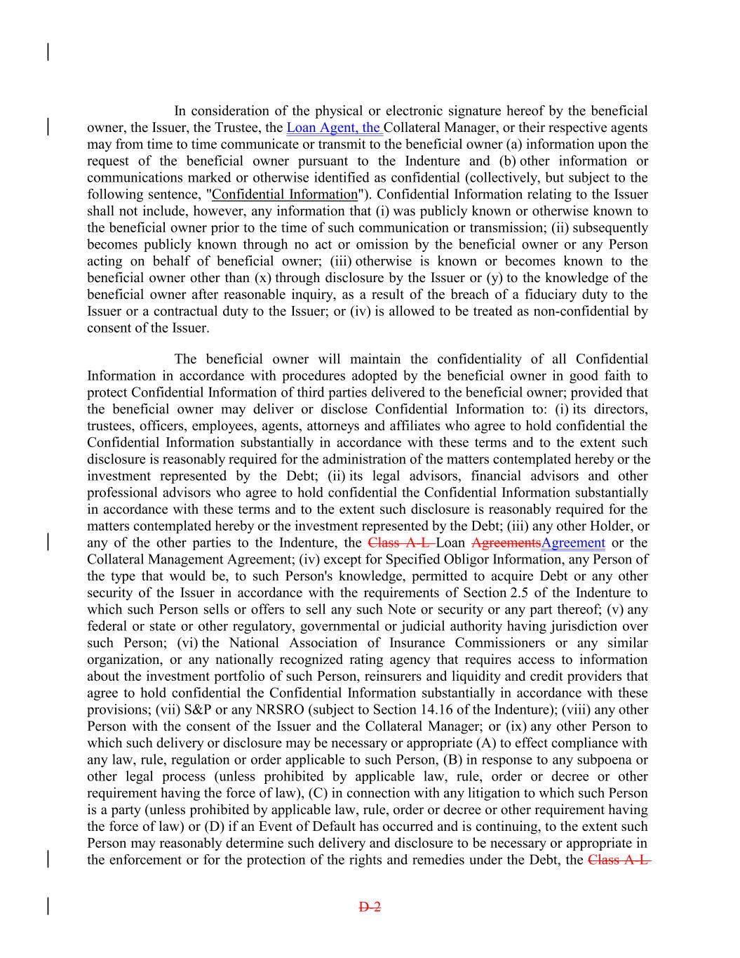 In consideration of the physical or electronic signature hereof by the beneficial owner, the Issuer, the Trustee, the Loan Agent, the Collateral Manager, or their respective agents may from time to time communicate or transmit to the beneficial owner (a) information upon the request of the beneficial owner pursuant to the Indenture and (b) other information or communications marked or otherwise identified as confidential (collectively, but subject to the following sentence, "Confidential Information"). Confidential Information relating to the Issuer shall not include, however, any information that (i) was publicly known or otherwise known to the beneficial owner prior to the time of such communication or transmission; (ii) subsequently becomes publicly known through no act or omission by the beneficial owner or any Person acting on behalf of beneficial owner; (iii) otherwise is known or becomes known to the beneficial owner other than (x) through disclosure by the Issuer or (y) to the knowledge of the beneficial owner after reasonable inquiry, as a result of the breach of a fiduciary duty to the Issuer or a contractual duty to the Issuer; or (iv) is allowed to be treated as non-confidential by consent of the Issuer. The beneficial owner will maintain the confidentiality of all Confidential Information in accordance with procedures adopted by the beneficial owner in good faith to protect Confidential Information of third parties delivered to the beneficial owner; provided that the beneficial owner may deliver or disclose Confidential Information to: (i) its directors, trustees, officers, employees, agents, attorneys and affiliates who agree to hold confidential the Confidential Information substantially in accordance with these terms and to the extent such disclosure is reasonably required for the administration of the matters contemplated hereby or the investment represented by the Debt; (ii) its legal advisors, financial advisors and other professional advisors who agree to hold confidential the Confidential Information substantially in accordance with these terms and to the extent such disclosure is reasonably required for the matters contemplated hereby or the investment represented by the Debt; (iii) any other Holder, or any of the other parties to the Indenture, the Class A-L Loan AgreementsAgreement or the Collateral Management Agreement; (iv) except for Specified Obligor Information, any Person of the type that would be, to such Person's knowledge, permitted to acquire Debt or any other security of the Issuer in accordance with the requirements of Section 2.5 of the Indenture to which such Person sells or offers to sell any such Note or security or any part thereof; (v) any federal or state or other regulatory, governmental or judicial authority having jurisdiction over such Person; (vi) the National Association of Insurance Commissioners or any similar organization, or any nationally recognized rating agency that requires access to information about the investment portfolio of such Person, reinsurers and liquidity and credit providers that agree to hold confidential the Confidential Information substantially in accordance with these provisions; (vii) S&P or any NRSRO (subject to Section 14.16 of the Indenture); (viii) any other Person with the consent of the Issuer and the Collateral Manager; or (ix) any other Person to which such delivery or disclosure may be necessary or appropriate (A) to effect compliance with any law, rule, regulation or order applicable to such Person, (B) in response to any subpoena or other legal process (unless prohibited by applicable law, rule, order or decree or other requirement having the force of law), (C) in connection with any litigation to which such Person is a party (unless prohibited by applicable law, rule, order or decree or other requirement having the force of law) or (D) if an Event of Default has occurred and is continuing, to the extent such Person may reasonably determine such delivery and disclosure to be necessary or appropriate in the enforcement or for the protection of the rights and remedies under the Debt, the Class A-L D-2
