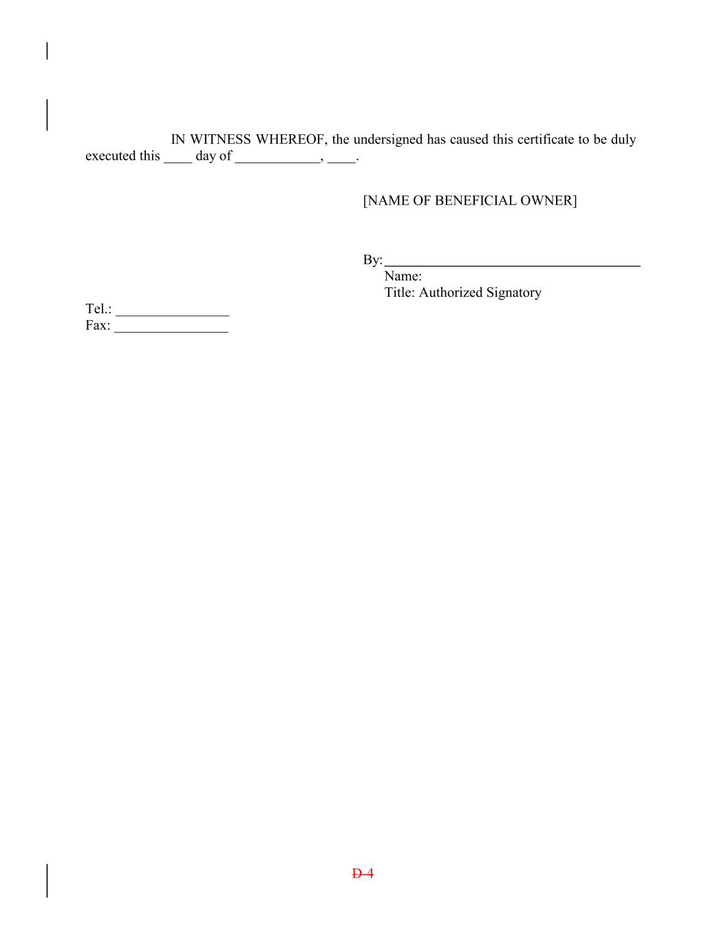IN WITNESS WHEREOF, the undersigned has caused this certificate to be duly executed this ____ day of ____________, ____. [NAME OF BENEFICIAL OWNER] By: Name: Title: Authorized Signatory Tel.: ________________ Fax: ________________ D-4