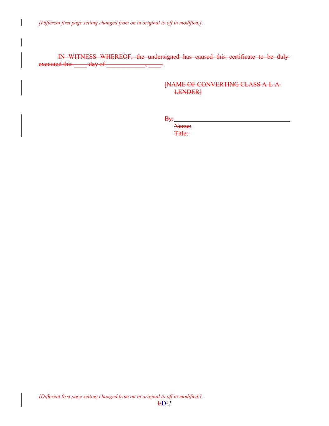 [Different first page setting changed from on in original to off in modified.]. IN WITNESS WHEREOF, the undersigned has caused this certificate to be duly executed this ____ day of ____________, ____. [NAME OF CONVERTING CLASS A-L-A LENDER] By: Name: Title: [Different first page setting changed from on in original to off in modified.]. ED-2
