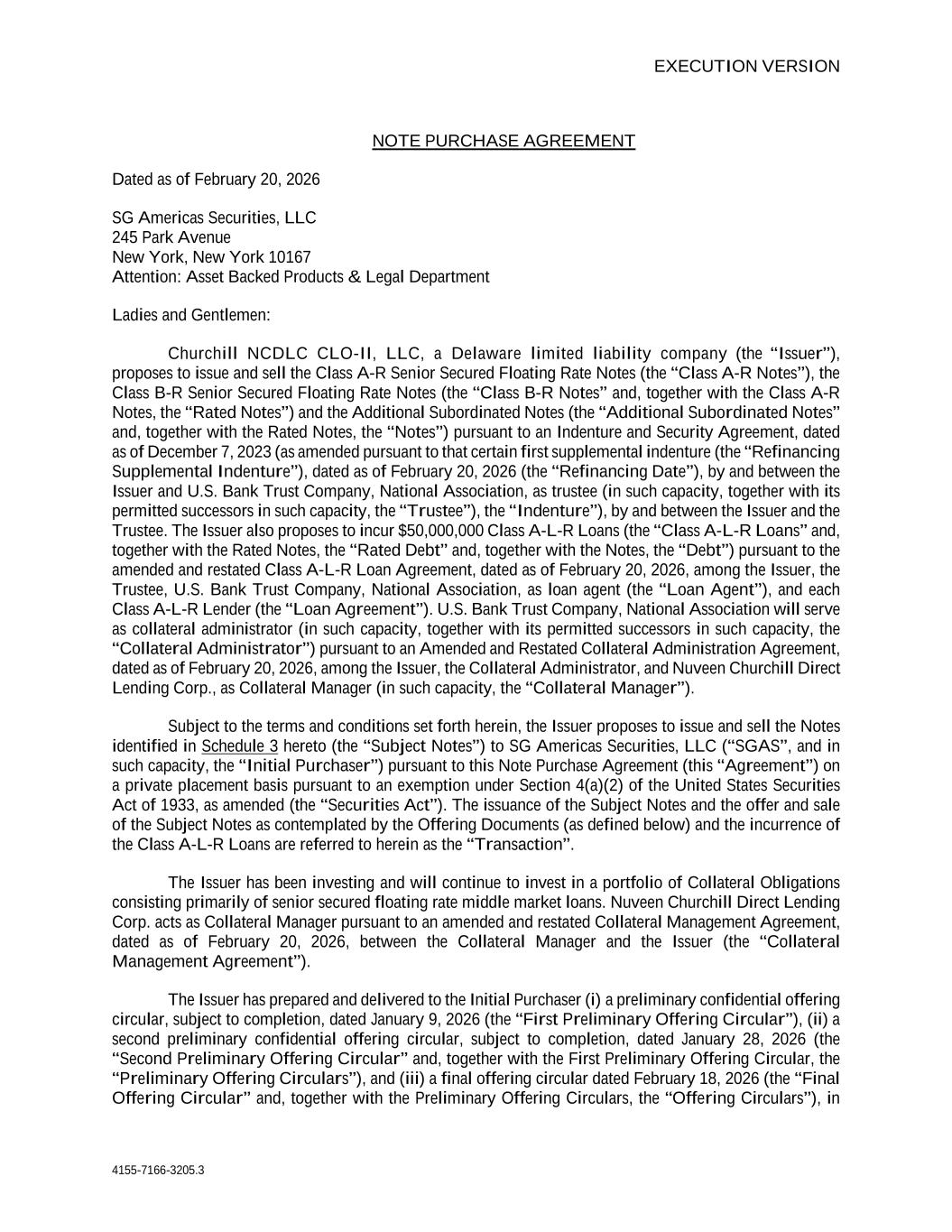 EXECUTION VERSION 4155-7166-3205.3 NOTE PURCHASE AGREEMENT Dated as of February 20, 2026 SG Americas Securities, LLC 245 Park Avenue New York, New York 10167 Attention: Asset Backed Products & Legal Department Ladies and Gentlemen: Churchill NCDLC CLO-II, LLC, a Delaware limited liability company (the “Issuer”), proposes to issue and sell the Class A-R Senior Secured Floating Rate Notes (the “Class A-R Notes”), the Class B-R Senior Secured Floating Rate Notes (the “Class B-R Notes” and, together with the Class A-R Notes, the “Rated Notes”) and the Additional Subordinated Notes (the “Additional Subordinated Notes” and, together with the Rated Notes, the “Notes”) pursuant to an Indenture and Security Agreement, dated as of December 7, 2023 (as amended pursuant to that certain first supplemental indenture (the “Refinancing Supplemental Indenture”), dated as of February 20, 2026 (the “Refinancing Date”), by and between the Issuer and U.S. Bank Trust Company, National Association, as trustee (in such capacity, together with its permitted successors in such capacity, the “Trustee”), the “Indenture”), by and between the Issuer and the Trustee. The Issuer also proposes to incur $50,000,000 Class A-L-R Loans (the “Class A-L-R Loans” and, together with the Rated Notes, the “Rated Debt” and, together with the Notes, the “Debt”) pursuant to the amended and restated Class A-L-R Loan Agreement, dated as of February 20, 2026, among the Issuer, the Trustee, U.S. Bank Trust Company, National Association, as loan agent (the “Loan Agent”), and each Class A-L-R Lender (the “Loan Agreement”). U.S. Bank Trust Company, National Association will serve as collateral administrator (in such capacity, together with its permitted successors in such capacity, the “Collateral Administrator”) pursuant to an Amended and Restated Collateral Administration Agreement, dated as of February 20, 2026, among the Issuer, the Collateral Administrator, and Nuveen Churchill Direct Lending Corp., as Collateral Manager (in such capacity, the “Collateral Manager”). Subject to the terms and conditions set forth herein, the Issuer proposes to issue and sell the Notes identified in Schedule 3 hereto (the “Subject Notes”) to SG Americas Securities, LLC (“SGAS”, and in such capacity, the “Initial Purchaser”) pursuant to this Note Purchase Agreement (this “Agreement”) on a private placement basis pursuant to an exemption under Section 4(a)(2) of the United States Securities Act of 1933, as amended (the “Securities Act”). The issuance of the Subject Notes and the offer and sale of the Subject Notes as contemplated by the Offering Documents (as defined below) and the incurrence of the Class A-L-R Loans are referred to herein as the “Transaction”. The Issuer has been investing and will continue to invest in a portfolio of Collateral Obligations consisting primarily of senior secured floating rate middle market loans. Nuveen Churchill Direct Lending Corp. acts as Collateral Manager pursuant to an amended and restated Collateral Management Agreement, dated as of February 20, 2026, between the Collateral Manager and the Issuer (the “Collateral Management Agreement”). The Issuer has prepared and delivered to the Initial Purchaser (i) a preliminary confidential offering circular, subject to completion, dated January 9, 2026 (the “First Preliminary Offering Circular”), (ii) a second preliminary confidential offering circular, subject to completion, dated January 28, 2026 (the “Second Preliminary Offering Circular” and, together with the First Preliminary Offering Circular, the “Preliminary Offering Circulars”), and (iii) a final offering circular dated February 18, 2026 (the “Final Offering Circular” and, together with the Preliminary Offering Circulars, the “Offering Circulars”), in