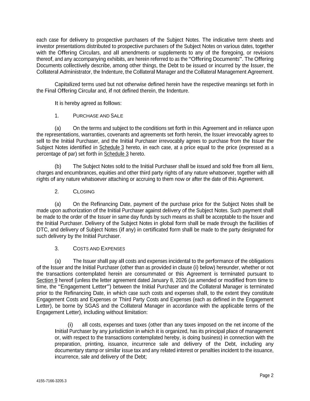 Page 2 4155-7166-3205.3 each case for delivery to prospective purchasers of the Subject Notes. The indicative term sheets and investor presentations distributed to prospective purchasers of the Subject Notes on various dates, together with the Offering Circulars, and all amendments or supplements to any of the foregoing, or revisions thereof, and any accompanying exhibits, are herein referred to as the “Offering Documents”. The Offering Documents collectively describe, among other things, the Debt to be issued or incurred by the Issuer, the Collateral Administrator, the Indenture, the Collateral Manager and the Collateral Management Agreement. Capitalized terms used but not otherwise defined herein have the respective meanings set forth in the Final Offering Circular and, if not defined therein, the Indenture. It is hereby agreed as follows: 1. PURCHASE AND SALE (a) On the terms and subject to the conditions set forth in this Agreement and in reliance upon the representations, warranties, covenants and agreements set forth herein, the Issuer irrevocably agrees to sell to the Initial Purchaser, and the Initial Purchaser irrevocably agrees to purchase from the Issuer the Subject Notes identified in Schedule 3 hereto, in each case, at a price equal to the price (expressed as a percentage of par) set forth in Schedule 3 hereto. (b) The Subject Notes sold to the Initial Purchaser shall be issued and sold free from all liens, charges and encumbrances, equities and other third party rights of any nature whatsoever, together with all rights of any nature whatsoever attaching or accruing to them now or after the date of this Agreement. 2. CLOSING (a) On the Refinancing Date, payment of the purchase price for the Subject Notes shall be made upon authorization of the Initial Purchaser against delivery of the Subject Notes. Such payment shall be made to the order of the Issuer in same day funds by such means as shall be acceptable to the Issuer and the Initial Purchaser. Delivery of the Subject Notes in global form shall be made through the facilities of DTC, and delivery of Subject Notes (if any) in certificated form shall be made to the party designated for such delivery by the Initial Purchaser. 3. COSTS AND EXPENSES (a) The Issuer shall pay all costs and expenses incidental to the performance of the obligations of the Issuer and the Initial Purchaser (other than as provided in clause (i) below) hereunder, whether or not the transactions contemplated herein are consummated or this Agreement is terminated pursuant to Section 9 hereof (unless the letter agreement dated January 8, 2026 (as amended or modified from time to time, the “Engagement Letter”) between the Initial Purchaser and the Collateral Manager is terminated prior to the Refinancing Date, in which case such costs and expenses shall, to the extent they constitute Engagement Costs and Expenses or Third Party Costs and Expenses (each as defined in the Engagement Letter), be borne by SGAS and the Collateral Manager in accordance with the applicable terms of the Engagement Letter), including without limitation: (i) all costs, expenses and taxes (other than any taxes imposed on the net income of the Initial Purchaser by any jurisdiction in which it is organized, has its principal place of management or, with respect to the transactions contemplated hereby, is doing business) in connection with the preparation, printing, issuance, incurrence sale and delivery of the Debt, including any documentary stamp or similar issue tax and any related interest or penalties incident to the issuance, incurrence, sale and delivery of the Debt;