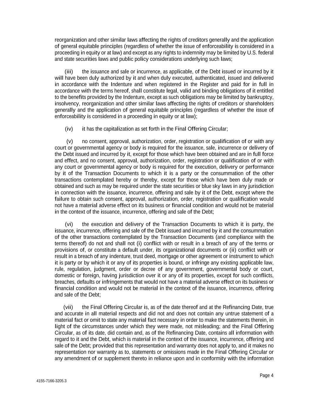 Page 4 4155-7166-3205.3 reorganization and other similar laws affecting the rights of creditors generally and the application of general equitable principles (regardless of whether the issue of enforceability is considered in a proceeding in equity or at law) and except as any rights to indemnity may be limited by U.S. federal and state securities laws and public policy considerations underlying such laws; (iii) the issuance and sale or incurrence, as applicable, of the Debt issued or incurred by it will have been duly authorized by it and when duly executed, authenticated, issued and delivered in accordance with the Indenture and when registered in the Register and paid for in full in accordance with the terms hereof, shall constitute legal, valid and binding obligations of it entitled to the benefits provided by the Indenture, except as such obligations may be limited by bankruptcy, insolvency, reorganization and other similar laws affecting the rights of creditors or shareholders generally and the application of general equitable principles (regardless of whether the issue of enforceability is considered in a proceeding in equity or at law); (iv) it has the capitalization as set forth in the Final Offering Circular; (v) no consent, approval, authorization, order, registration or qualification of or with any court or governmental agency or body is required for the issuance, sale, incurrence or delivery of the Debt issued and incurred by it, except for those which have been obtained and are in full force and effect, and no consent, approval, authorization, order, registration or qualification of or with any court or governmental agency or body is required for the execution, delivery or performance by it of the Transaction Documents to which it is a party or the consummation of the other transactions contemplated hereby or thereby, except for those which have been duly made or obtained and such as may be required under the state securities or blue sky laws in any jurisdiction in connection with the issuance, incurrence, offering and sale by it of the Debt, except where the failure to obtain such consent, approval, authorization, order, registration or qualification would not have a material adverse effect on its business or financial condition and would not be material in the context of the issuance, incurrence, offering and sale of the Debt; (vi) the execution and delivery of the Transaction Documents to which it is party, the issuance, incurrence, offering and sale of the Debt issued and incurred by it and the consummation of the other transactions contemplated by the Transaction Documents (and compliance with the terms thereof) do not and shall not (i) conflict with or result in a breach of any of the terms or provisions of, or constitute a default under, its organizational documents or (ii) conflict with or result in a breach of any indenture, trust deed, mortgage or other agreement or instrument to which it is party or by which it or any of its properties is bound, or infringe any existing applicable law, rule, regulation, judgment, order or decree of any government, governmental body or court, domestic or foreign, having jurisdiction over it or any of its properties, except for such conflicts, breaches, defaults or infringements that would not have a material adverse effect on its business or financial condition and would not be material in the context of the issuance, incurrence, offering and sale of the Debt; (vii) the Final Offering Circular is, as of the date thereof and at the Refinancing Date, true and accurate in all material respects and did not and does not contain any untrue statement of a material fact or omit to state any material fact necessary in order to make the statements therein, in light of the circumstances under which they were made, not misleading; and the Final Offering Circular, as of its date, did contain and, as of the Refinancing Date, contains all information with regard to it and the Debt, which is material in the context of the issuance, incurrence, offering and sale of the Debt; provided that this representation and warranty does not apply to, and it makes no representation nor warranty as to, statements or omissions made in the Final Offering Circular or any amendment of or supplement thereto in reliance upon and in conformity with the information