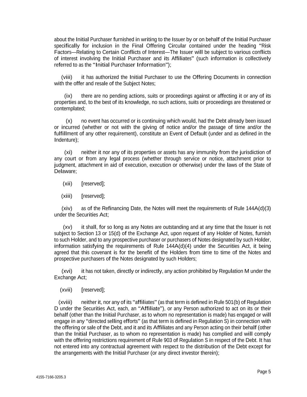 Page 5 4155-7166-3205.3 about the Initial Purchaser furnished in writing to the Issuer by or on behalf of the Initial Purchaser specifically for inclusion in the Final Offering Circular contained under the heading “Risk Factors—Relating to Certain Conflicts of Interest—The Issuer will be subject to various conflicts of interest involving the Initial Purchaser and its Affiliates” (such information is collectively referred to as the “Initial Purchaser Information”); (viii) it has authorized the Initial Purchaser to use the Offering Documents in connection with the offer and resale of the Subject Notes; (ix) there are no pending actions, suits or proceedings against or affecting it or any of its properties and, to the best of its knowledge, no such actions, suits or proceedings are threatened or contemplated; (x) no event has occurred or is continuing which would, had the Debt already been issued or incurred (whether or not with the giving of notice and/or the passage of time and/or the fulfillment of any other requirement), constitute an Event of Default (under and as defined in the Indenture); (xi) neither it nor any of its properties or assets has any immunity from the jurisdiction of any court or from any legal process (whether through service or notice, attachment prior to judgment, attachment in aid of execution, execution or otherwise) under the laws of the State of Delaware; (xii) [reserved]; (xiii) [reserved]; (xiv) as of the Refinancing Date, the Notes will meet the requirements of Rule 144A(d)(3) under the Securities Act; (xv) it shall, for so long as any Notes are outstanding and at any time that the Issuer is not subject to Section 13 or 15(d) of the Exchange Act, upon request of any Holder of Notes, furnish to such Holder, and to any prospective purchaser or purchasers of Notes designated by such Holder, information satisfying the requirements of Rule 144A(d)(4) under the Securities Act, it being agreed that this covenant is for the benefit of the Holders from time to time of the Notes and prospective purchasers of the Notes designated by such Holders; (xvi) it has not taken, directly or indirectly, any action prohibited by Regulation M under the Exchange Act; (xvii) [reserved]; (xviii) neither it, nor any of its “affiliates” (as that term is defined in Rule 501(b) of Regulation D under the Securities Act, each, an “Affiliate”), or any Person authorized to act on its or their behalf (other than the Initial Purchaser, as to whom no representation is made) has engaged or will engage in any “directed selling efforts” (as that term is defined in Regulation S) in connection with the offering or sale of the Debt, and it and its Affiliates and any Person acting on their behalf (other than the Initial Purchaser, as to whom no representation is made) has complied and will comply with the offering restrictions requirement of Rule 903 of Regulation S in respect of the Debt. It has not entered into any contractual agreement with respect to the distribution of the Debt except for the arrangements with the Initial Purchaser (or any direct investor therein);