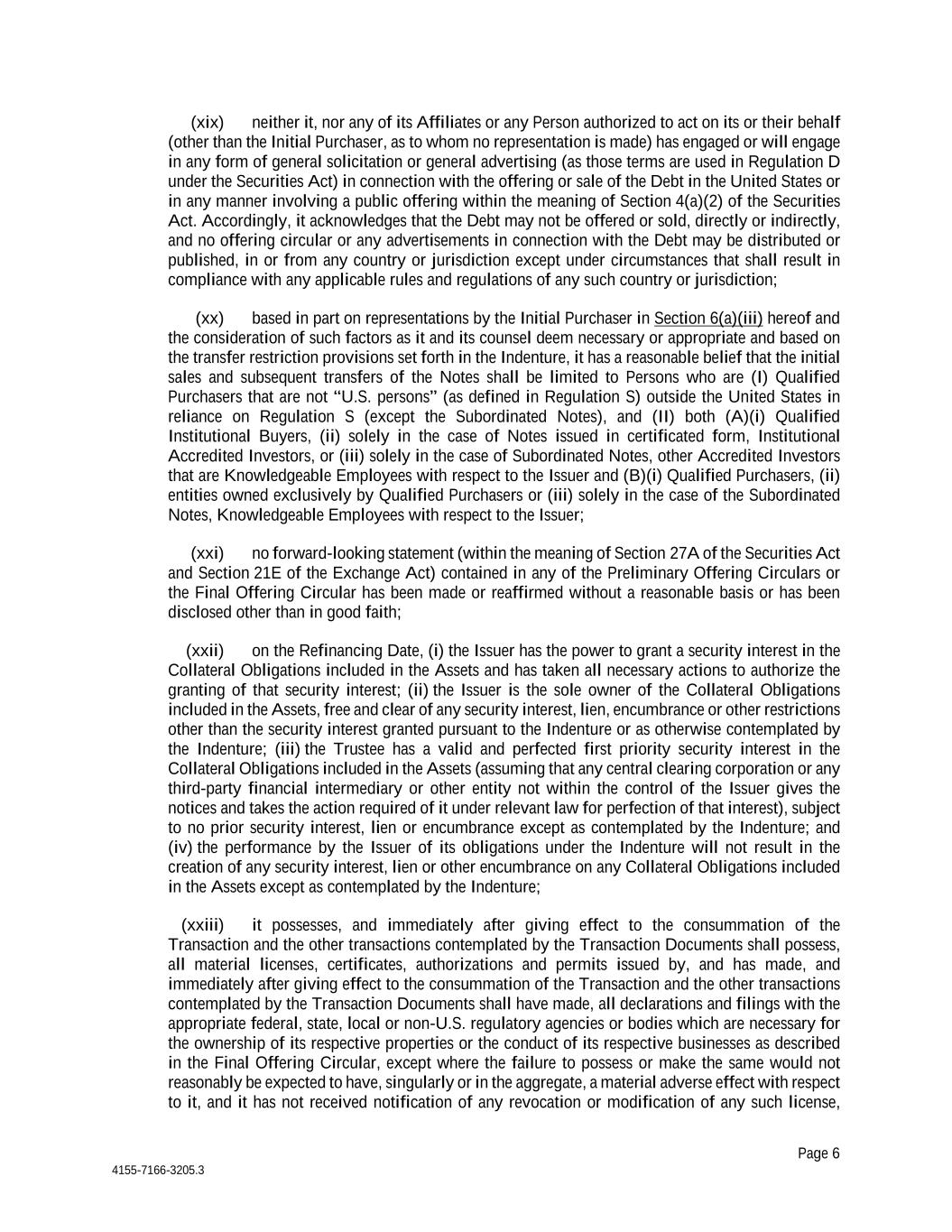 Page 6 4155-7166-3205.3 (xix) neither it, nor any of its Affiliates or any Person authorized to act on its or their behalf (other than the Initial Purchaser, as to whom no representation is made) has engaged or will engage in any form of general solicitation or general advertising (as those terms are used in Regulation D under the Securities Act) in connection with the offering or sale of the Debt in the United States or in any manner involving a public offering within the meaning of Section 4(a)(2) of the Securities Act. Accordingly, it acknowledges that the Debt may not be offered or sold, directly or indirectly, and no offering circular or any advertisements in connection with the Debt may be distributed or published, in or from any country or jurisdiction except under circumstances that shall result in compliance with any applicable rules and regulations of any such country or jurisdiction; (xx) based in part on representations by the Initial Purchaser in Section 6(a)(iii) hereof and the consideration of such factors as it and its counsel deem necessary or appropriate and based on the transfer restriction provisions set forth in the Indenture, it has a reasonable belief that the initial sales and subsequent transfers of the Notes shall be limited to Persons who are (I) Qualified Purchasers that are not “U.S. persons” (as defined in Regulation S) outside the United States in reliance on Regulation S (except the Subordinated Notes), and (II) both (A)(i) Qualified Institutional Buyers, (ii) solely in the case of Notes issued in certificated form, Institutional Accredited Investors, or (iii) solely in the case of Subordinated Notes, other Accredited Investors that are Knowledgeable Employees with respect to the Issuer and (B)(i) Qualified Purchasers, (ii) entities owned exclusively by Qualified Purchasers or (iii) solely in the case of the Subordinated Notes, Knowledgeable Employees with respect to the Issuer; (xxi) no forward-looking statement (within the meaning of Section 27A of the Securities Act and Section 21E of the Exchange Act) contained in any of the Preliminary Offering Circulars or the Final Offering Circular has been made or reaffirmed without a reasonable basis or has been disclosed other than in good faith; (xxii) on the Refinancing Date, (i) the Issuer has the power to grant a security interest in the Collateral Obligations included in the Assets and has taken all necessary actions to authorize the granting of that security interest; (ii) the Issuer is the sole owner of the Collateral Obligations included in the Assets, free and clear of any security interest, lien, encumbrance or other restrictions other than the security interest granted pursuant to the Indenture or as otherwise contemplated by the Indenture; (iii) the Trustee has a valid and perfected first priority security interest in the Collateral Obligations included in the Assets (assuming that any central clearing corporation or any third-party financial intermediary or other entity not within the control of the Issuer gives the notices and takes the action required of it under relevant law for perfection of that interest), subject to no prior security interest, lien or encumbrance except as contemplated by the Indenture; and (iv) the performance by the Issuer of its obligations under the Indenture will not result in the creation of any security interest, lien or other encumbrance on any Collateral Obligations included in the Assets except as contemplated by the Indenture; (xxiii) it possesses, and immediately after giving effect to the consummation of the Transaction and the other transactions contemplated by the Transaction Documents shall possess, all material licenses, certificates, authorizations and permits issued by, and has made, and immediately after giving effect to the consummation of the Transaction and the other transactions contemplated by the Transaction Documents shall have made, all declarations and filings with the appropriate federal, state, local or non-U.S. regulatory agencies or bodies which are necessary for the ownership of its respective properties or the conduct of its respective businesses as described in the Final Offering Circular, except where the failure to possess or make the same would not reasonably be expected to have, singularly or in the aggregate, a material adverse effect with respect to it, and it has not received notification of any revocation or modification of any such license,