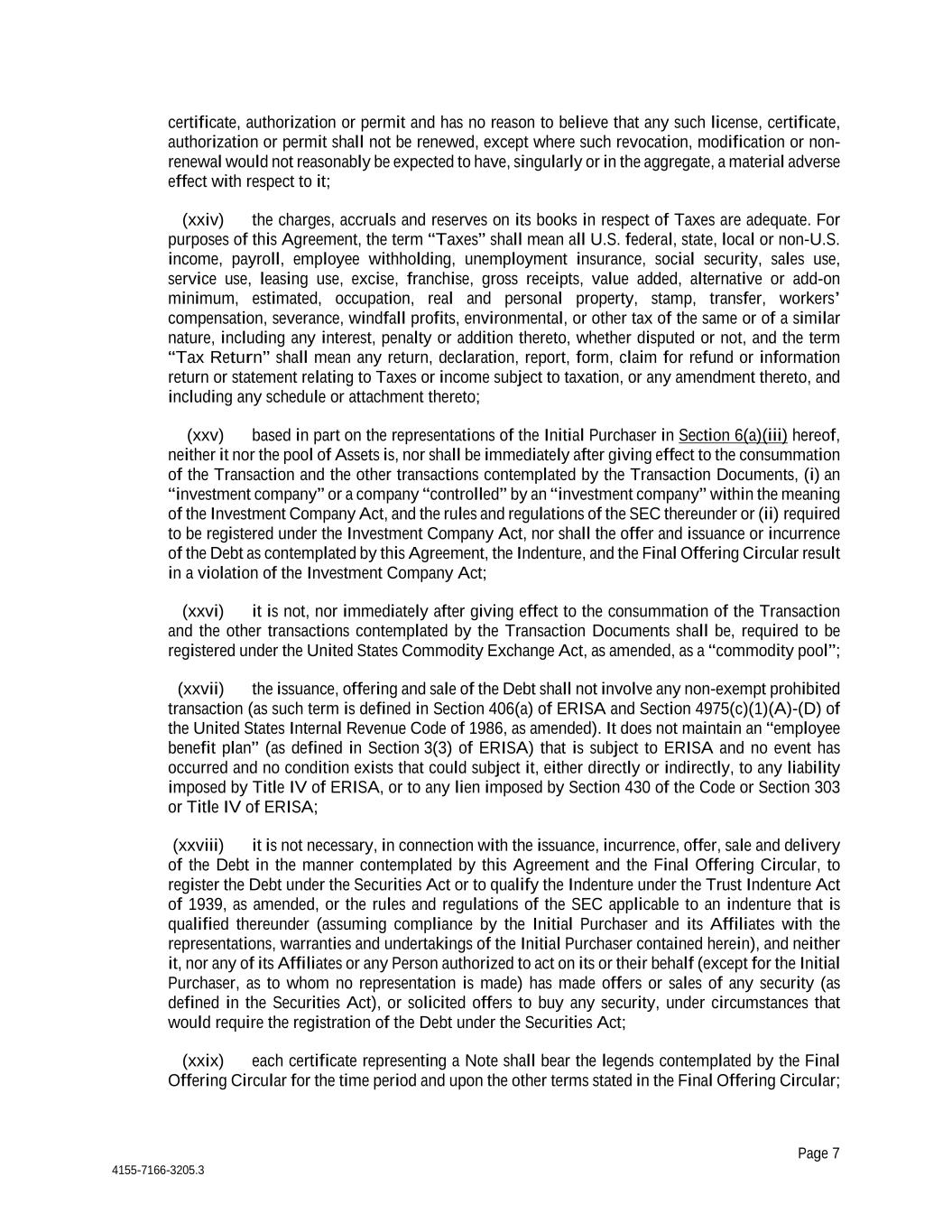 Page 7 4155-7166-3205.3 certificate, authorization or permit and has no reason to believe that any such license, certificate, authorization or permit shall not be renewed, except where such revocation, modification or non- renewal would not reasonably be expected to have, singularly or in the aggregate, a material adverse effect with respect to it; (xxiv) the charges, accruals and reserves on its books in respect of Taxes are adequate. For purposes of this Agreement, the term “Taxes” shall mean all U.S. federal, state, local or non-U.S. income, payroll, employee withholding, unemployment insurance, social security, sales use, service use, leasing use, excise, franchise, gross receipts, value added, alternative or add-on minimum, estimated, occupation, real and personal property, stamp, transfer, workers’ compensation, severance, windfall profits, environmental, or other tax of the same or of a similar nature, including any interest, penalty or addition thereto, whether disputed or not, and the term “Tax Return” shall mean any return, declaration, report, form, claim for refund or information return or statement relating to Taxes or income subject to taxation, or any amendment thereto, and including any schedule or attachment thereto; (xxv) based in part on the representations of the Initial Purchaser in Section 6(a)(iii) hereof, neither it nor the pool of Assets is, nor shall be immediately after giving effect to the consummation of the Transaction and the other transactions contemplated by the Transaction Documents, (i) an “investment company” or a company “controlled” by an “investment company” within the meaning of the Investment Company Act, and the rules and regulations of the SEC thereunder or (ii) required to be registered under the Investment Company Act, nor shall the offer and issuance or incurrence of the Debt as contemplated by this Agreement, the Indenture, and the Final Offering Circular result in a violation of the Investment Company Act; (xxvi) it is not, nor immediately after giving effect to the consummation of the Transaction and the other transactions contemplated by the Transaction Documents shall be, required to be registered under the United States Commodity Exchange Act, as amended, as a “commodity pool”; (xxvii) the issuance, offering and sale of the Debt shall not involve any non-exempt prohibited transaction (as such term is defined in Section 406(a) of ERISA and Section 4975(c)(1)(A)-(D) of the United States Internal Revenue Code of 1986, as amended). It does not maintain an “employee benefit plan” (as defined in Section 3(3) of ERISA) that is subject to ERISA and no event has occurred and no condition exists that could subject it, either directly or indirectly, to any liability imposed by Title IV of ERISA, or to any lien imposed by Section 430 of the Code or Section 303 or Title IV of ERISA; (xxviii) it is not necessary, in connection with the issuance, incurrence, offer, sale and delivery of the Debt in the manner contemplated by this Agreement and the Final Offering Circular, to register the Debt under the Securities Act or to qualify the Indenture under the Trust Indenture Act of 1939, as amended, or the rules and regulations of the SEC applicable to an indenture that is qualified thereunder (assuming compliance by the Initial Purchaser and its Affiliates with the representations, warranties and undertakings of the Initial Purchaser contained herein), and neither it, nor any of its Affiliates or any Person authorized to act on its or their behalf (except for the Initial Purchaser, as to whom no representation is made) has made offers or sales of any security (as defined in the Securities Act), or solicited offers to buy any security, under circumstances that would require the registration of the Debt under the Securities Act; (xxix) each certificate representing a Note shall bear the legends contemplated by the Final Offering Circular for the time period and upon the other terms stated in the Final Offering Circular;