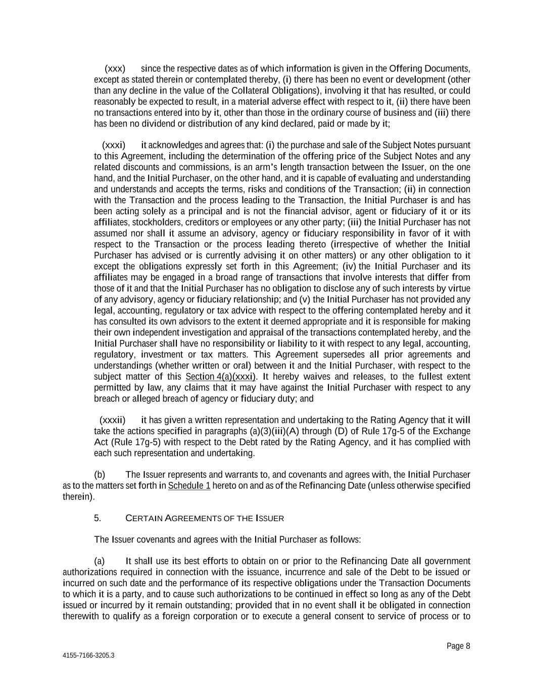Page 8 4155-7166-3205.3 (xxx) since the respective dates as of which information is given in the Offering Documents, except as stated therein or contemplated thereby, (i) there has been no event or development (other than any decline in the value of the Collateral Obligations), involving it that has resulted, or could reasonably be expected to result, in a material adverse effect with respect to it, (ii) there have been no transactions entered into by it, other than those in the ordinary course of business and (iii) there has been no dividend or distribution of any kind declared, paid or made by it; (xxxi) it acknowledges and agrees that: (i) the purchase and sale of the Subject Notes pursuant to this Agreement, including the determination of the offering price of the Subject Notes and any related discounts and commissions, is an arm’s length transaction between the Issuer, on the one hand, and the Initial Purchaser, on the other hand, and it is capable of evaluating and understanding and understands and accepts the terms, risks and conditions of the Transaction; (ii) in connection with the Transaction and the process leading to the Transaction, the Initial Purchaser is and has been acting solely as a principal and is not the financial advisor, agent or fiduciary of it or its affiliates, stockholders, creditors or employees or any other party; (iii) the Initial Purchaser has not assumed nor shall it assume an advisory, agency or fiduciary responsibility in favor of it with respect to the Transaction or the process leading thereto (irrespective of whether the Initial Purchaser has advised or is currently advising it on other matters) or any other obligation to it except the obligations expressly set forth in this Agreement; (iv) the Initial Purchaser and its affiliates may be engaged in a broad range of transactions that involve interests that differ from those of it and that the Initial Purchaser has no obligation to disclose any of such interests by virtue of any advisory, agency or fiduciary relationship; and (v) the Initial Purchaser has not provided any legal, accounting, regulatory or tax advice with respect to the offering contemplated hereby and it has consulted its own advisors to the extent it deemed appropriate and it is responsible for making their own independent investigation and appraisal of the transactions contemplated hereby, and the Initial Purchaser shall have no responsibility or liability to it with respect to any legal, accounting, regulatory, investment or tax matters. This Agreement supersedes all prior agreements and understandings (whether written or oral) between it and the Initial Purchaser, with respect to the subject matter of this Section 4(a)(xxxi). It hereby waives and releases, to the fullest extent permitted by law, any claims that it may have against the Initial Purchaser with respect to any breach or alleged breach of agency or fiduciary duty; and (xxxii) it has given a written representation and undertaking to the Rating Agency that it will take the actions specified in paragraphs (a)(3)(iii)(A) through (D) of Rule 17g-5 of the Exchange Act (Rule 17g-5) with respect to the Debt rated by the Rating Agency, and it has complied with each such representation and undertaking. (b) The Issuer represents and warrants to, and covenants and agrees with, the Initial Purchaser as to the matters set forth in Schedule 1 hereto on and as of the Refinancing Date (unless otherwise specified therein). 5. CERTAIN AGREEMENTS OF THE ISSUER The Issuer covenants and agrees with the Initial Purchaser as follows: (a) It shall use its best efforts to obtain on or prior to the Refinancing Date all government authorizations required in connection with the issuance, incurrence and sale of the Debt to be issued or incurred on such date and the performance of its respective obligations under the Transaction Documents to which it is a party, and to cause such authorizations to be continued in effect so long as any of the Debt issued or incurred by it remain outstanding; provided that in no event shall it be obligated in connection therewith to qualify as a foreign corporation or to execute a general consent to service of process or to