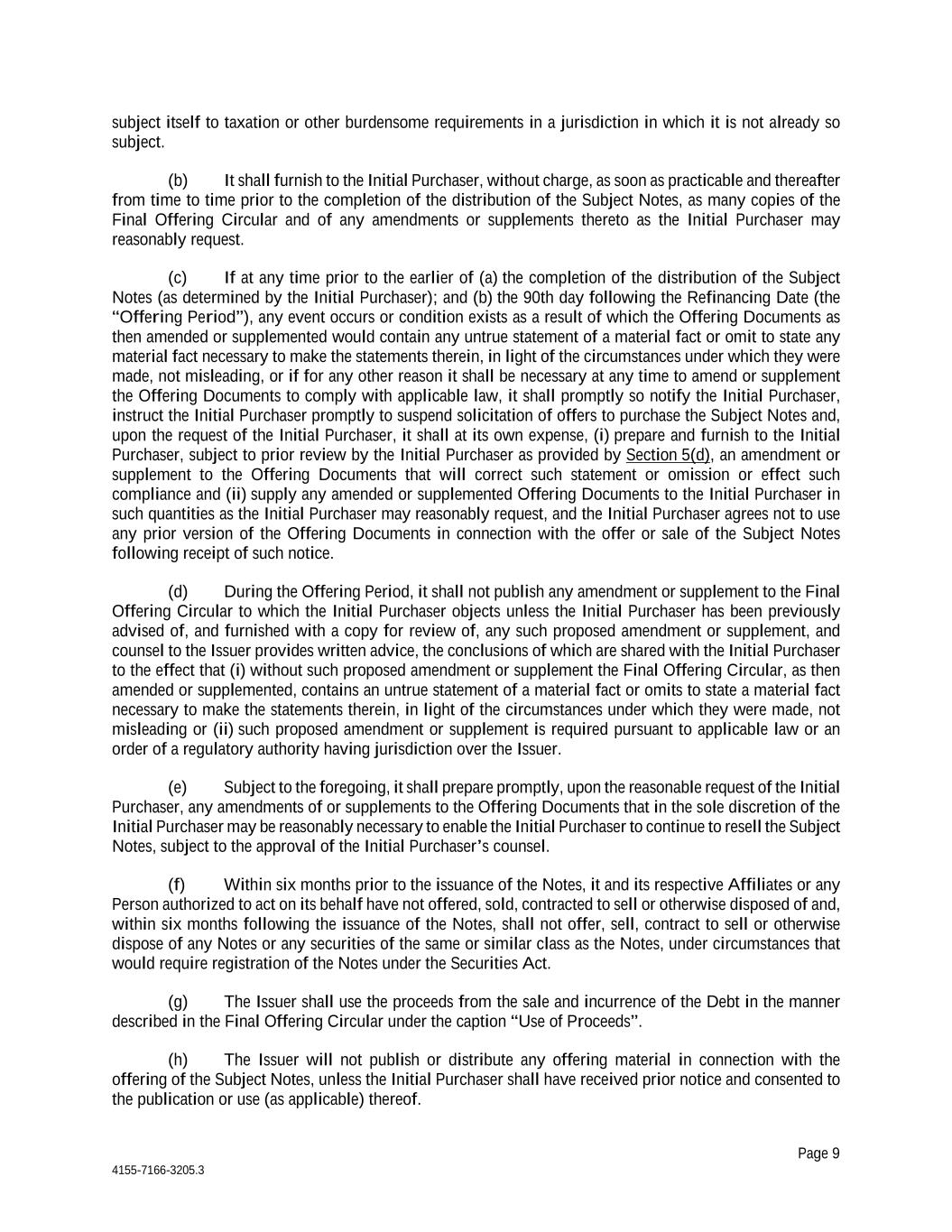 Page 9 4155-7166-3205.3 subject itself to taxation or other burdensome requirements in a jurisdiction in which it is not already so subject. (b) It shall furnish to the Initial Purchaser, without charge, as soon as practicable and thereafter from time to time prior to the completion of the distribution of the Subject Notes, as many copies of the Final Offering Circular and of any amendments or supplements thereto as the Initial Purchaser may reasonably request. (c) If at any time prior to the earlier of (a) the completion of the distribution of the Subject Notes (as determined by the Initial Purchaser); and (b) the 90th day following the Refinancing Date (the “Offering Period”), any event occurs or condition exists as a result of which the Offering Documents as then amended or supplemented would contain any untrue statement of a material fact or omit to state any material fact necessary to make the statements therein, in light of the circumstances under which they were made, not misleading, or if for any other reason it shall be necessary at any time to amend or supplement the Offering Documents to comply with applicable law, it shall promptly so notify the Initial Purchaser, instruct the Initial Purchaser promptly to suspend solicitation of offers to purchase the Subject Notes and, upon the request of the Initial Purchaser, it shall at its own expense, (i) prepare and furnish to the Initial Purchaser, subject to prior review by the Initial Purchaser as provided by Section 5(d), an amendment or supplement to the Offering Documents that will correct such statement or omission or effect such compliance and (ii) supply any amended or supplemented Offering Documents to the Initial Purchaser in such quantities as the Initial Purchaser may reasonably request, and the Initial Purchaser agrees not to use any prior version of the Offering Documents in connection with the offer or sale of the Subject Notes following receipt of such notice. (d) During the Offering Period, it shall not publish any amendment or supplement to the Final Offering Circular to which the Initial Purchaser objects unless the Initial Purchaser has been previously advised of, and furnished with a copy for review of, any such proposed amendment or supplement, and counsel to the Issuer provides written advice, the conclusions of which are shared with the Initial Purchaser to the effect that (i) without such proposed amendment or supplement the Final Offering Circular, as then amended or supplemented, contains an untrue statement of a material fact or omits to state a material fact necessary to make the statements therein, in light of the circumstances under which they were made, not misleading or (ii) such proposed amendment or supplement is required pursuant to applicable law or an order of a regulatory authority having jurisdiction over the Issuer. (e) Subject to the foregoing, it shall prepare promptly, upon the reasonable request of the Initial Purchaser, any amendments of or supplements to the Offering Documents that in the sole discretion of the Initial Purchaser may be reasonably necessary to enable the Initial Purchaser to continue to resell the Subject Notes, subject to the approval of the Initial Purchaser’s counsel. (f) Within six months prior to the issuance of the Notes, it and its respective Affiliates or any Person authorized to act on its behalf have not offered, sold, contracted to sell or otherwise disposed of and, within six months following the issuance of the Notes, shall not offer, sell, contract to sell or otherwise dispose of any Notes or any securities of the same or similar class as the Notes, under circumstances that would require registration of the Notes under the Securities Act. (g) The Issuer shall use the proceeds from the sale and incurrence of the Debt in the manner described in the Final Offering Circular under the caption “Use of Proceeds”. (h) The Issuer will not publish or distribute any offering material in connection with the offering of the Subject Notes, unless the Initial Purchaser shall have received prior notice and consented to the publication or use (as applicable) thereof.
