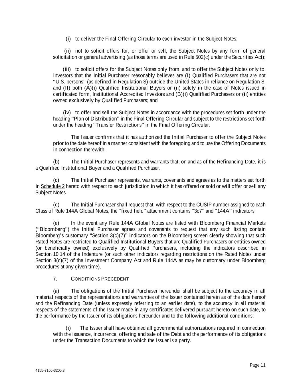 Page 11 4155-7166-3205.3 (i) to deliver the Final Offering Circular to each investor in the Subject Notes; (ii) not to solicit offers for, or offer or sell, the Subject Notes by any form of general solicitation or general advertising (as those terms are used in Rule 502(c) under the Securities Act); (iii) to solicit offers for the Subject Notes only from, and to offer the Subject Notes only to, investors that the Initial Purchaser reasonably believes are (I) Qualified Purchasers that are not “U.S. persons” (as defined in Regulation S) outside the United States in reliance on Regulation S, and (II) both (A)(i) Qualified Institutional Buyers or (ii) solely in the case of Notes issued in certificated form, Institutional Accredited Investors and (B)(i) Qualified Purchasers or (ii) entities owned exclusively by Qualified Purchasers; and (iv) to offer and sell the Subject Notes in accordance with the procedures set forth under the heading “Plan of Distribution” in the Final Offering Circular and subject to the restrictions set forth under the heading “Transfer Restrictions” in the Final Offering Circular. The Issuer confirms that it has authorized the Initial Purchaser to offer the Subject Notes prior to the date hereof in a manner consistent with the foregoing and to use the Offering Documents in connection therewith. (b) The Initial Purchaser represents and warrants that, on and as of the Refinancing Date, it is a Qualified Institutional Buyer and a Qualified Purchaser. (c) The Initial Purchaser represents, warrants, covenants and agrees as to the matters set forth in Schedule 2 hereto with respect to each jurisdiction in which it has offered or sold or will offer or sell any Subject Notes. (d) The Initial Purchaser shall request that, with respect to the CUSIP number assigned to each Class of Rule 144A Global Notes, the “fixed field” attachment contains “3c7” and “144A” indicators. (e) In the event any Rule 144A Global Notes are listed with Bloomberg Financial Markets (“Bloomberg”) the Initial Purchaser agrees and covenants to request that any such listing contain Bloomberg’s customary “Section 3(c)(7)” indicators on the Bloomberg screen clearly showing that such Rated Notes are restricted to Qualified Institutional Buyers that are Qualified Purchasers or entities owned (or beneficially owned) exclusively by Qualified Purchasers, including the indicators described in Section 10.14 of the Indenture (or such other indicators regarding restrictions on the Rated Notes under Section 3(c)(7) of the Investment Company Act and Rule 144A as may be customary under Bloomberg procedures at any given time). 7. CONDITIONS PRECEDENT (a) The obligations of the Initial Purchaser hereunder shall be subject to the accuracy in all material respects of the representations and warranties of the Issuer contained herein as of the date hereof and the Refinancing Date (unless expressly referring to an earlier date), to the accuracy in all material respects of the statements of the Issuer made in any certificates delivered pursuant hereto on such date, to the performance by the Issuer of its obligations hereunder and to the following additional conditions: (i) The Issuer shall have obtained all governmental authorizations required in connection with the issuance, incurrence, offering and sale of the Debt and the performance of its obligations under the Transaction Documents to which the Issuer is a party.