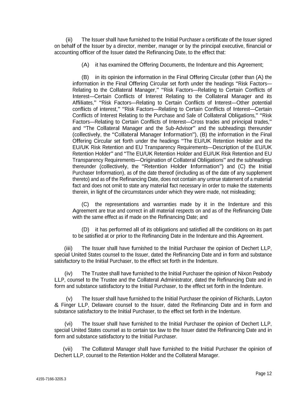Page 12 4155-7166-3205.3 (ii) The Issuer shall have furnished to the Initial Purchaser a certificate of the Issuer signed on behalf of the Issuer by a director, member, manager or by the principal executive, financial or accounting officer of the Issuer dated the Refinancing Date, to the effect that: (A) it has examined the Offering Documents, the Indenture and this Agreement; (B) in its opinion the information in the Final Offering Circular (other than (A) the information in the Final Offering Circular set forth under the headings “Risk Factors— Relating to the Collateral Manager,” “Risk Factors—Relating to Certain Conflicts of Interest—Certain Conflicts of Interest Relating to the Collateral Manager and its Affiliates,” “Risk Factors—Relating to Certain Conflicts of Interest—Other potential conflicts of interest,” “Risk Factors—Relating to Certain Conflicts of Interest—Certain Conflicts of Interest Relating to the Purchase and Sale of Collateral Obligations,” “Risk Factors—Relating to Certain Conflicts of Interest—Cross trades and principal trades,” and “The Collateral Manager and the Sub-Advisor” and the subheadings thereunder (collectively, the “Collateral Manager Information”), (B) the information in the Final Offering Circular set forth under the headings “The EU/UK Retention Holder and the EU/UK Risk Retention and EU Transparency Requirements—Description of the EU/UK Retention Holder” and “The EU/UK Retention Holder and EU/UK Risk Retention and EU Transparency Requirements—Origination of Collateral Obligations” and the subheadings thereunder (collectively, the “Retention Holder Information”) and (C) the Initial Purchaser Information), as of the date thereof (including as of the date of any supplement thereto) and as of the Refinancing Date, does not contain any untrue statement of a material fact and does not omit to state any material fact necessary in order to make the statements therein, in light of the circumstances under which they were made, not misleading; (C) the representations and warranties made by it in the Indenture and this Agreement are true and correct in all material respects on and as of the Refinancing Date with the same effect as if made on the Refinancing Date; and (D) it has performed all of its obligations and satisfied all the conditions on its part to be satisfied at or prior to the Refinancing Date in the Indenture and this Agreement. (iii) The Issuer shall have furnished to the Initial Purchaser the opinion of Dechert LLP, special United States counsel to the Issuer, dated the Refinancing Date and in form and substance satisfactory to the Initial Purchaser, to the effect set forth in the Indenture. (iv) The Trustee shall have furnished to the Initial Purchaser the opinion of Nixon Peabody LLP, counsel to the Trustee and the Collateral Administrator, dated the Refinancing Date and in form and substance satisfactory to the Initial Purchaser, to the effect set forth in the Indenture. (v) The Issuer shall have furnished to the Initial Purchaser the opinion of Richards, Layton & Finger LLP, Delaware counsel to the Issuer, dated the Refinancing Date and in form and substance satisfactory to the Initial Purchaser, to the effect set forth in the Indenture. (vi) The Issuer shall have furnished to the Initial Purchaser the opinion of Dechert LLP, special United States counsel as to certain tax law to the Issuer dated the Refinancing Date and in form and substance satisfactory to the Initial Purchaser. (vii) The Collateral Manager shall have furnished to the Initial Purchaser the opinion of Dechert LLP, counsel to the Retention Holder and the Collateral Manager.