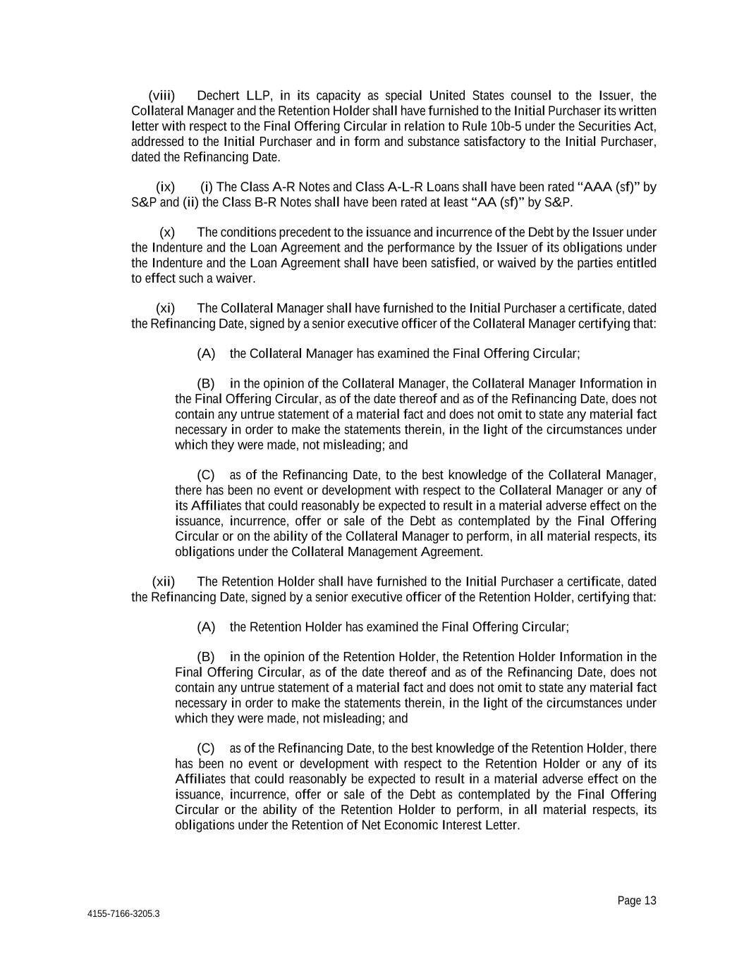 Page 13 4155-7166-3205.3 (viii) Dechert LLP, in its capacity as special United States counsel to the Issuer, the Collateral Manager and the Retention Holder shall have furnished to the Initial Purchaser its written letter with respect to the Final Offering Circular in relation to Rule 10b-5 under the Securities Act, addressed to the Initial Purchaser and in form and substance satisfactory to the Initial Purchaser, dated the Refinancing Date. (ix) (i) The Class A-R Notes and Class A-L-R Loans shall have been rated “AAA (sf)” by S&P and (ii) the Class B-R Notes shall have been rated at least “AA (sf)” by S&P. (x) The conditions precedent to the issuance and incurrence of the Debt by the Issuer under the Indenture and the Loan Agreement and the performance by the Issuer of its obligations under the Indenture and the Loan Agreement shall have been satisfied, or waived by the parties entitled to effect such a waiver. (xi) The Collateral Manager shall have furnished to the Initial Purchaser a certificate, dated the Refinancing Date, signed by a senior executive officer of the Collateral Manager certifying that: (A) the Collateral Manager has examined the Final Offering Circular; (B) in the opinion of the Collateral Manager, the Collateral Manager Information in the Final Offering Circular, as of the date thereof and as of the Refinancing Date, does not contain any untrue statement of a material fact and does not omit to state any material fact necessary in order to make the statements therein, in the light of the circumstances under which they were made, not misleading; and (C) as of the Refinancing Date, to the best knowledge of the Collateral Manager, there has been no event or development with respect to the Collateral Manager or any of its Affiliates that could reasonably be expected to result in a material adverse effect on the issuance, incurrence, offer or sale of the Debt as contemplated by the Final Offering Circular or on the ability of the Collateral Manager to perform, in all material respects, its obligations under the Collateral Management Agreement. (xii) The Retention Holder shall have furnished to the Initial Purchaser a certificate, dated the Refinancing Date, signed by a senior executive officer of the Retention Holder, certifying that: (A) the Retention Holder has examined the Final Offering Circular; (B) in the opinion of the Retention Holder, the Retention Holder Information in the Final Offering Circular, as of the date thereof and as of the Refinancing Date, does not contain any untrue statement of a material fact and does not omit to state any material fact necessary in order to make the statements therein, in the light of the circumstances under which they were made, not misleading; and (C) as of the Refinancing Date, to the best knowledge of the Retention Holder, there has been no event or development with respect to the Retention Holder or any of its Affiliates that could reasonably be expected to result in a material adverse effect on the issuance, incurrence, offer or sale of the Debt as contemplated by the Final Offering Circular or the ability of the Retention Holder to perform, in all material respects, its obligations under the Retention of Net Economic Interest Letter.