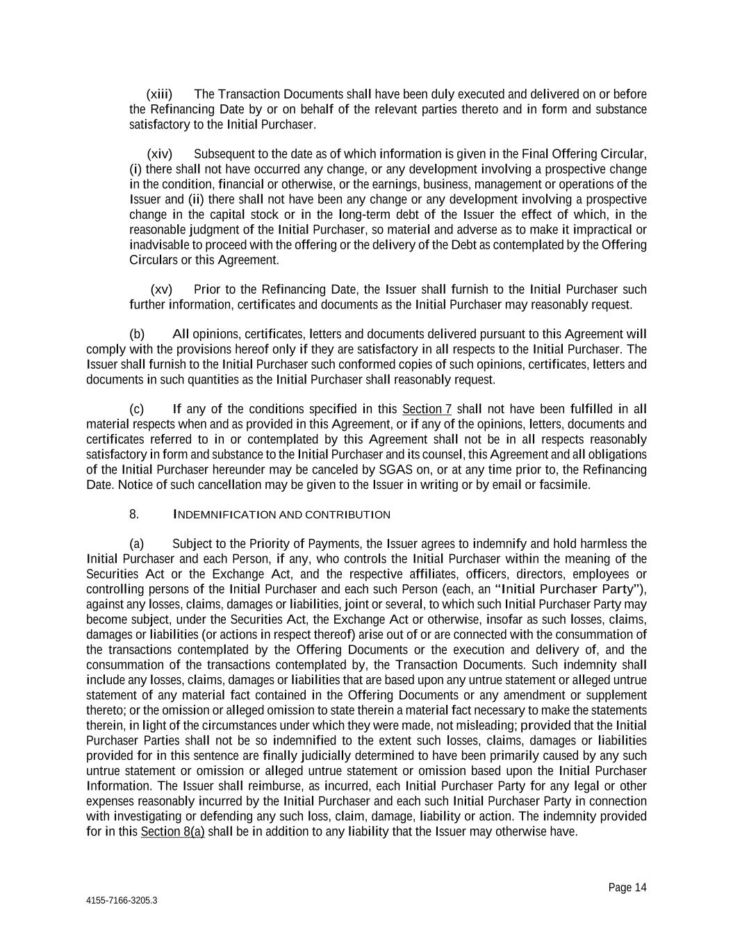 Page 14 4155-7166-3205.3 (xiii) The Transaction Documents shall have been duly executed and delivered on or before the Refinancing Date by or on behalf of the relevant parties thereto and in form and substance satisfactory to the Initial Purchaser. (xiv) Subsequent to the date as of which information is given in the Final Offering Circular, (i) there shall not have occurred any change, or any development involving a prospective change in the condition, financial or otherwise, or the earnings, business, management or operations of the Issuer and (ii) there shall not have been any change or any development involving a prospective change in the capital stock or in the long-term debt of the Issuer the effect of which, in the reasonable judgment of the Initial Purchaser, so material and adverse as to make it impractical or inadvisable to proceed with the offering or the delivery of the Debt as contemplated by the Offering Circulars or this Agreement. (xv) Prior to the Refinancing Date, the Issuer shall furnish to the Initial Purchaser such further information, certificates and documents as the Initial Purchaser may reasonably request. (b) All opinions, certificates, letters and documents delivered pursuant to this Agreement will comply with the provisions hereof only if they are satisfactory in all respects to the Initial Purchaser. The Issuer shall furnish to the Initial Purchaser such conformed copies of such opinions, certificates, letters and documents in such quantities as the Initial Purchaser shall reasonably request. (c) If any of the conditions specified in this Section 7 shall not have been fulfilled in all material respects when and as provided in this Agreement, or if any of the opinions, letters, documents and certificates referred to in or contemplated by this Agreement shall not be in all respects reasonably satisfactory in form and substance to the Initial Purchaser and its counsel, this Agreement and all obligations of the Initial Purchaser hereunder may be canceled by SGAS on, or at any time prior to, the Refinancing Date. Notice of such cancellation may be given to the Issuer in writing or by email or facsimile. 8. INDEMNIFICATION AND CONTRIBUTION (a) Subject to the Priority of Payments, the Issuer agrees to indemnify and hold harmless the Initial Purchaser and each Person, if any, who controls the Initial Purchaser within the meaning of the Securities Act or the Exchange Act, and the respective affiliates, officers, directors, employees or controlling persons of the Initial Purchaser and each such Person (each, an “Initial Purchaser Party”), against any losses, claims, damages or liabilities, joint or several, to which such Initial Purchaser Party may become subject, under the Securities Act, the Exchange Act or otherwise, insofar as such losses, claims, damages or liabilities (or actions in respect thereof) arise out of or are connected with the consummation of the transactions contemplated by the Offering Documents or the execution and delivery of, and the consummation of the transactions contemplated by, the Transaction Documents. Such indemnity shall include any losses, claims, damages or liabilities that are based upon any untrue statement or alleged untrue statement of any material fact contained in the Offering Documents or any amendment or supplement thereto; or the omission or alleged omission to state therein a material fact necessary to make the statements therein, in light of the circumstances under which they were made, not misleading; provided that the Initial Purchaser Parties shall not be so indemnified to the extent such losses, claims, damages or liabilities provided for in this sentence are finally judicially determined to have been primarily caused by any such untrue statement or omission or alleged untrue statement or omission based upon the Initial Purchaser Information. The Issuer shall reimburse, as incurred, each Initial Purchaser Party for any legal or other expenses reasonably incurred by the Initial Purchaser and each such Initial Purchaser Party in connection with investigating or defending any such loss, claim, damage, liability or action. The indemnity provided for in this Section 8(a) shall be in addition to any liability that the Issuer may otherwise have.