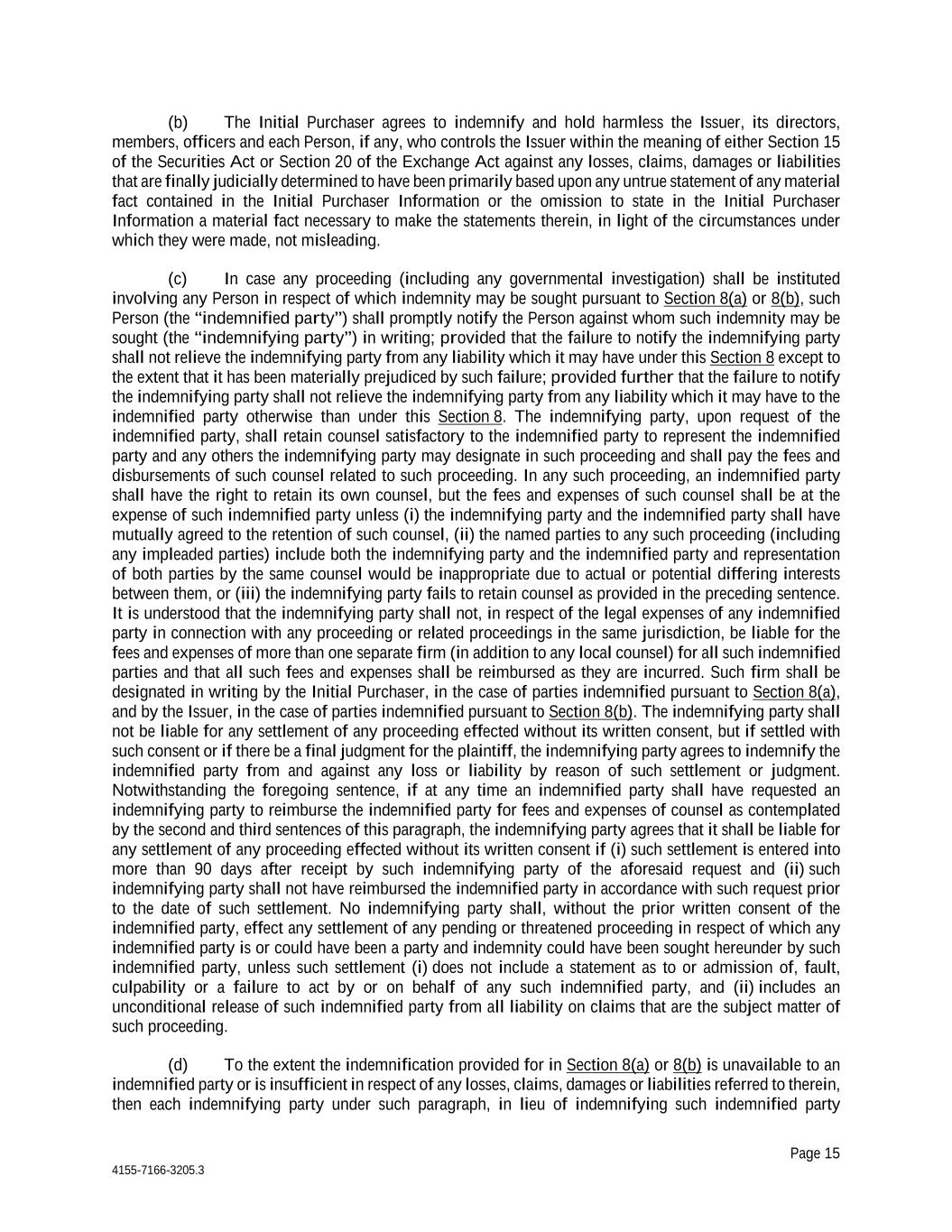 Page 15 4155-7166-3205.3 (b) The Initial Purchaser agrees to indemnify and hold harmless the Issuer, its directors, members, officers and each Person, if any, who controls the Issuer within the meaning of either Section 15 of the Securities Act or Section 20 of the Exchange Act against any losses, claims, damages or liabilities that are finally judicially determined to have been primarily based upon any untrue statement of any material fact contained in the Initial Purchaser Information or the omission to state in the Initial Purchaser Information a material fact necessary to make the statements therein, in light of the circumstances under which they were made, not misleading. (c) In case any proceeding (including any governmental investigation) shall be instituted involving any Person in respect of which indemnity may be sought pursuant to Section 8(a) or 8(b), such Person (the “indemnified party”) shall promptly notify the Person against whom such indemnity may be sought (the “indemnifying party”) in writing; provided that the failure to notify the indemnifying party shall not relieve the indemnifying party from any liability which it may have under this Section 8 except to the extent that it has been materially prejudiced by such failure; provided further that the failure to notify the indemnifying party shall not relieve the indemnifying party from any liability which it may have to the indemnified party otherwise than under this Section 8. The indemnifying party, upon request of the indemnified party, shall retain counsel satisfactory to the indemnified party to represent the indemnified party and any others the indemnifying party may designate in such proceeding and shall pay the fees and disbursements of such counsel related to such proceeding. In any such proceeding, an indemnified party shall have the right to retain its own counsel, but the fees and expenses of such counsel shall be at the expense of such indemnified party unless (i) the indemnifying party and the indemnified party shall have mutually agreed to the retention of such counsel, (ii) the named parties to any such proceeding (including any impleaded parties) include both the indemnifying party and the indemnified party and representation of both parties by the same counsel would be inappropriate due to actual or potential differing interests between them, or (iii) the indemnifying party fails to retain counsel as provided in the preceding sentence. It is understood that the indemnifying party shall not, in respect of the legal expenses of any indemnified party in connection with any proceeding or related proceedings in the same jurisdiction, be liable for the fees and expenses of more than one separate firm (in addition to any local counsel) for all such indemnified parties and that all such fees and expenses shall be reimbursed as they are incurred. Such firm shall be designated in writing by the Initial Purchaser, in the case of parties indemnified pursuant to Section 8(a), and by the Issuer, in the case of parties indemnified pursuant to Section 8(b). The indemnifying party shall not be liable for any settlement of any proceeding effected without its written consent, but if settled with such consent or if there be a final judgment for the plaintiff, the indemnifying party agrees to indemnify the indemnified party from and against any loss or liability by reason of such settlement or judgment. Notwithstanding the foregoing sentence, if at any time an indemnified party shall have requested an indemnifying party to reimburse the indemnified party for fees and expenses of counsel as contemplated by the second and third sentences of this paragraph, the indemnifying party agrees that it shall be liable for any settlement of any proceeding effected without its written consent if (i) such settlement is entered into more than 90 days after receipt by such indemnifying party of the aforesaid request and (ii) such indemnifying party shall not have reimbursed the indemnified party in accordance with such request prior to the date of such settlement. No indemnifying party shall, without the prior written consent of the indemnified party, effect any settlement of any pending or threatened proceeding in respect of which any indemnified party is or could have been a party and indemnity could have been sought hereunder by such indemnified party, unless such settlement (i) does not include a statement as to or admission of, fault, culpability or a failure to act by or on behalf of any such indemnified party, and (ii) includes an unconditional release of such indemnified party from all liability on claims that are the subject matter of such proceeding. (d) To the extent the indemnification provided for in Section 8(a) or 8(b) is unavailable to an indemnified party or is insufficient in respect of any losses, claims, damages or liabilities referred to therein, then each indemnifying party under such paragraph, in lieu of indemnifying such indemnified party