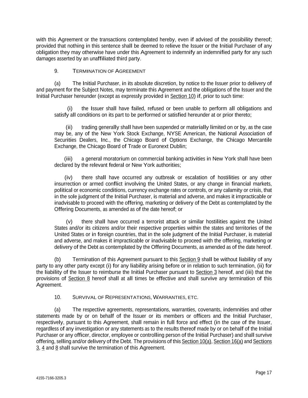 Page 17 4155-7166-3205.3 with this Agreement or the transactions contemplated hereby, even if advised of the possibility thereof; provided that nothing in this sentence shall be deemed to relieve the Issuer or the Initial Purchaser of any obligation they may otherwise have under this Agreement to indemnify an indemnified party for any such damages asserted by an unaffiliated third party. 9. TERMINATION OF AGREEMENT (a) The Initial Purchaser, in its absolute discretion, by notice to the Issuer prior to delivery of and payment for the Subject Notes, may terminate this Agreement and the obligations of the Issuer and the Initial Purchaser hereunder (except as expressly provided in Section 10) if, prior to such time: (i) the Issuer shall have failed, refused or been unable to perform all obligations and satisfy all conditions on its part to be performed or satisfied hereunder at or prior thereto; (ii) trading generally shall have been suspended or materially limited on or by, as the case may be, any of the New York Stock Exchange, NYSE American, the National Association of Securities Dealers, Inc., the Chicago Board of Options Exchange, the Chicago Mercantile Exchange, the Chicago Board of Trade or Euronext Dublin; (iii) a general moratorium on commercial banking activities in New York shall have been declared by the relevant federal or New York authorities; (iv) there shall have occurred any outbreak or escalation of hostilities or any other insurrection or armed conflict involving the United States, or any change in financial markets, political or economic conditions, currency exchange rates or controls, or any calamity or crisis, that in the sole judgment of the Initial Purchaser, is material and adverse, and makes it impracticable or inadvisable to proceed with the offering, marketing or delivery of the Debt as contemplated by the Offering Documents, as amended as of the date hereof; or (v) there shall have occurred a terrorist attack or similar hostilities against the United States and/or its citizens and/or their respective properties within the states and territories of the United States or in foreign countries, that in the sole judgment of the Initial Purchaser, is material and adverse, and makes it impracticable or inadvisable to proceed with the offering, marketing or delivery of the Debt as contemplated by the Offering Documents, as amended as of the date hereof. (b) Termination of this Agreement pursuant to this Section 9 shall be without liability of any party to any other party except (i) for any liability arising before or in relation to such termination, (ii) for the liability of the Issuer to reimburse the Initial Purchaser pursuant to Section 3 hereof, and (iii) that the provisions of Section 8 hereof shall at all times be effective and shall survive any termination of this Agreement. 10. SURVIVAL OF REPRESENTATIONS, WARRANTIES, ETC. (a) The respective agreements, representations, warranties, covenants, indemnities and other statements made by or on behalf of the Issuer or its members or officers and the Initial Purchaser, respectively, pursuant to this Agreement, shall remain in full force and effect (in the case of the Issuer, regardless of any investigation or any statements as to the results thereof made by or on behalf of the Initial Purchaser or any officer, director, employee or controlling person of the Initial Purchaser) and shall survive offering, selling and/or delivery of the Debt. The provisions of this Section 10(a), Section 16(a) and Sections 3, 4 and 8 shall survive the termination of this Agreement.