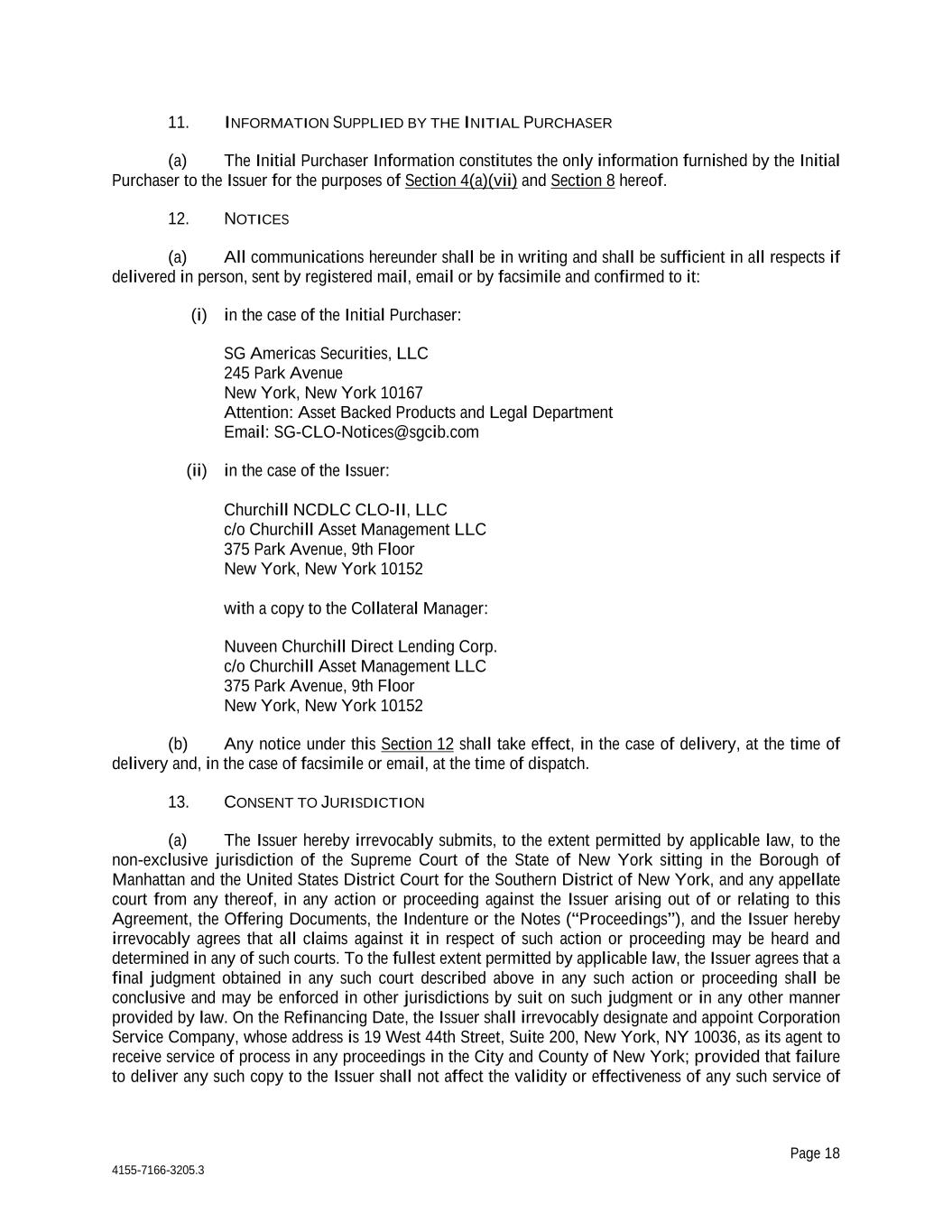 Page 18 4155-7166-3205.3 11. INFORMATION SUPPLIED BY THE INITIAL PURCHASER (a) The Initial Purchaser Information constitutes the only information furnished by the Initial Purchaser to the Issuer for the purposes of Section 4(a)(vii) and Section 8 hereof. 12. NOTICES (a) All communications hereunder shall be in writing and shall be sufficient in all respects if delivered in person, sent by registered mail, email or by facsimile and confirmed to it: (i) in the case of the Initial Purchaser: SG Americas Securities, LLC 245 Park Avenue New York, New York 10167 Attention: Asset Backed Products and Legal Department Email: SG-CLO-Notices@sgcib.com (ii) in the case of the Issuer: Churchill NCDLC CLO-II, LLC c/o Churchill Asset Management LLC 375 Park Avenue, 9th Floor New York, New York 10152 with a copy to the Collateral Manager: Nuveen Churchill Direct Lending Corp. c/o Churchill Asset Management LLC 375 Park Avenue, 9th Floor New York, New York 10152 (b) Any notice under this Section 12 shall take effect, in the case of delivery, at the time of delivery and, in the case of facsimile or email, at the time of dispatch. 13. CONSENT TO JURISDICTION (a) The Issuer hereby irrevocably submits, to the extent permitted by applicable law, to the non-exclusive jurisdiction of the Supreme Court of the State of New York sitting in the Borough of Manhattan and the United States District Court for the Southern District of New York, and any appellate court from any thereof, in any action or proceeding against the Issuer arising out of or relating to this Agreement, the Offering Documents, the Indenture or the Notes (“Proceedings”), and the Issuer hereby irrevocably agrees that all claims against it in respect of such action or proceeding may be heard and determined in any of such courts. To the fullest extent permitted by applicable law, the Issuer agrees that a final judgment obtained in any such court described above in any such action or proceeding shall be conclusive and may be enforced in other jurisdictions by suit on such judgment or in any other manner provided by law. On the Refinancing Date, the Issuer shall irrevocably designate and appoint Corporation Service Company, whose address is 19 West 44th Street, Suite 200, New York, NY 10036, as its agent to receive service of process in any proceedings in the City and County of New York; provided that failure to deliver any such copy to the Issuer shall not affect the validity or effectiveness of any such service of