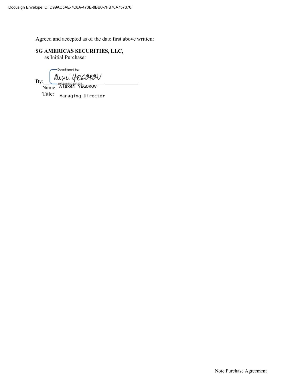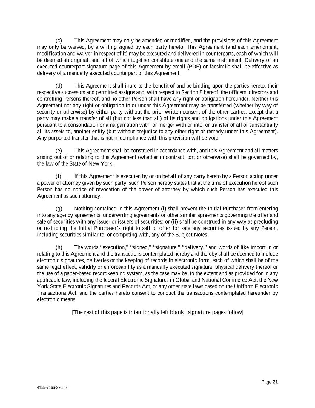 Page 21 4155-7166-3205.3 (c) This Agreement may only be amended or modified, and the provisions of this Agreement may only be waived, by a writing signed by each party hereto. This Agreement (and each amendment, modification and waiver in respect of it) may be executed and delivered in counterparts, each of which will be deemed an original, and all of which together constitute one and the same instrument. Delivery of an executed counterpart signature page of this Agreement by email (PDF) or facsimile shall be effective as delivery of a manually executed counterpart of this Agreement. (d) This Agreement shall inure to the benefit of and be binding upon the parties hereto, their respective successors and permitted assigns and, with respect to Section 8 hereof, the officers, directors and controlling Persons thereof, and no other Person shall have any right or obligation hereunder. Neither this Agreement nor any right or obligation in or under this Agreement may be transferred (whether by way of security or otherwise) by either party without the prior written consent of the other parties, except that a party may make a transfer of all (but not less than all) of its rights and obligations under this Agreement pursuant to a consolidation or amalgamation with, or merger with or into, or transfer of all or substantially all its assets to, another entity (but without prejudice to any other right or remedy under this Agreement). Any purported transfer that is not in compliance with this provision will be void. (e) This Agreement shall be construed in accordance with, and this Agreement and all matters arising out of or relating to this Agreement (whether in contract, tort or otherwise) shall be governed by, the law of the State of New York. (f) If this Agreement is executed by or on behalf of any party hereto by a Person acting under a power of attorney given by such party, such Person hereby states that at the time of execution hereof such Person has no notice of revocation of the power of attorney by which such Person has executed this Agreement as such attorney. (g) Nothing contained in this Agreement (i) shall prevent the Initial Purchaser from entering into any agency agreements, underwriting agreements or other similar agreements governing the offer and sale of securities with any issuer or issuers of securities; or (ii) shall be construed in any way as precluding or restricting the Initial Purchaser’s right to sell or offer for sale any securities issued by any Person, including securities similar to, or competing with, any of the Subject Notes. (h) The words “execution,” “signed,” “signature,” “delivery,” and words of like import in or relating to this Agreement and the transactions contemplated hereby and thereby shall be deemed to include electronic signatures, deliveries or the keeping of records in electronic form, each of which shall be of the same legal effect, validity or enforceability as a manually executed signature, physical delivery thereof or the use of a paper-based recordkeeping system, as the case may be, to the extent and as provided for in any applicable law, including the federal Electronic Signatures in Global and National Commerce Act, the New York State Electronic Signatures and Records Act, or any other state laws based on the Uniform Electronic Transactions Act, and the parties hereto consent to conduct the transactions contemplated hereunder by electronic means. [The rest of this page is intentionally left blank | signature pages follow]