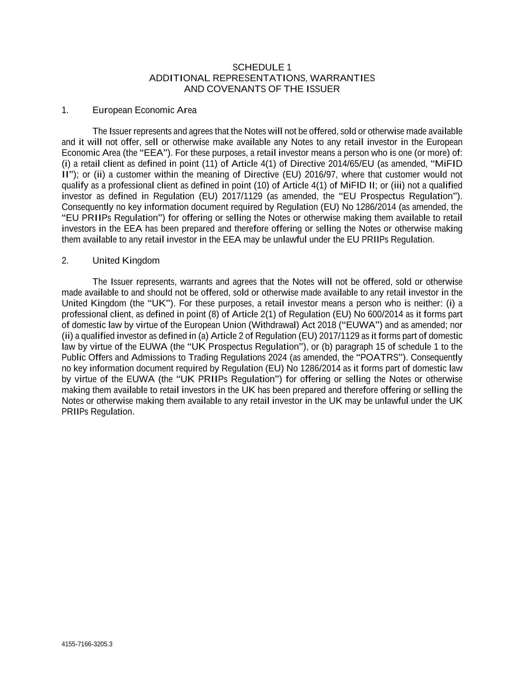 4155-7166-3205.3 SCHEDULE 1 ADDITIONAL REPRESENTATIONS, WARRANTIES AND COVENANTS OF THE ISSUER 1. European Economic Area The Issuer represents and agrees that the Notes will not be offered, sold or otherwise made available and it will not offer, sell or otherwise make available any Notes to any retail investor in the European Economic Area (the “EEA”). For these purposes, a retail investor means a person who is one (or more) of: (i) a retail client as defined in point (11) of Article 4(1) of Directive 2014/65/EU (as amended, “MiFID II”); or (ii) a customer within the meaning of Directive (EU) 2016/97, where that customer would not qualify as a professional client as defined in point (10) of Article 4(1) of MiFID II; or (iii) not a qualified investor as defined in Regulation (EU) 2017/1129 (as amended, the “EU Prospectus Regulation”). Consequently no key information document required by Regulation (EU) No 1286/2014 (as amended, the “EU PRIIPs Regulation”) for offering or selling the Notes or otherwise making them available to retail investors in the EEA has been prepared and therefore offering or selling the Notes or otherwise making them available to any retail investor in the EEA may be unlawful under the EU PRIIPs Regulation. 2. United Kingdom The Issuer represents, warrants and agrees that the Notes will not be offered, sold or otherwise made available to and should not be offered, sold or otherwise made available to any retail investor in the United Kingdom (the “UK”). For these purposes, a retail investor means a person who is neither: (i) a professional client, as defined in point (8) of Article 2(1) of Regulation (EU) No 600/2014 as it forms part of domestic law by virtue of the European Union (Withdrawal) Act 2018 (“EUWA”) and as amended; nor (ii) a qualified investor as defined in (a) Article 2 of Regulation (EU) 2017/1129 as it forms part of domestic law by virtue of the EUWA (the “UK Prospectus Regulation”), or (b) paragraph 15 of schedule 1 to the Public Offers and Admissions to Trading Regulations 2024 (as amended, the “POATRS”). Consequently no key information document required by Regulation (EU) No 1286/2014 as it forms part of domestic law by virtue of the EUWA (the “UK PRIIPs Regulation”) for offering or selling the Notes or otherwise making them available to retail investors in the UK has been prepared and therefore offering or selling the Notes or otherwise making them available to any retail investor in the UK may be unlawful under the UK PRIIPs Regulation.