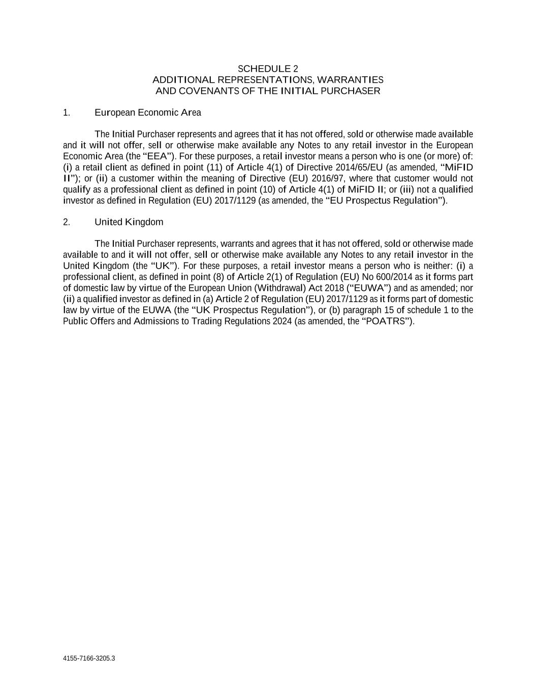 4155-7166-3205.3 SCHEDULE 2 ADDITIONAL REPRESENTATIONS, WARRANTIES AND COVENANTS OF THE INITIAL PURCHASER 1. European Economic Area The Initial Purchaser represents and agrees that it has not offered, sold or otherwise made available and it will not offer, sell or otherwise make available any Notes to any retail investor in the European Economic Area (the “EEA”). For these purposes, a retail investor means a person who is one (or more) of: (i) a retail client as defined in point (11) of Article 4(1) of Directive 2014/65/EU (as amended, “MiFID II”); or (ii) a customer within the meaning of Directive (EU) 2016/97, where that customer would not qualify as a professional client as defined in point (10) of Article 4(1) of MiFID II; or (iii) not a qualified investor as defined in Regulation (EU) 2017/1129 (as amended, the “EU Prospectus Regulation”). 2. United Kingdom The Initial Purchaser represents, warrants and agrees that it has not offered, sold or otherwise made available to and it will not offer, sell or otherwise make available any Notes to any retail investor in the United Kingdom (the “UK”). For these purposes, a retail investor means a person who is neither: (i) a professional client, as defined in point (8) of Article 2(1) of Regulation (EU) No 600/2014 as it forms part of domestic law by virtue of the European Union (Withdrawal) Act 2018 (“EUWA”) and as amended; nor (ii) a qualified investor as defined in (a) Article 2 of Regulation (EU) 2017/1129 as it forms part of domestic law by virtue of the EUWA (the “UK Prospectus Regulation”), or (b) paragraph 15 of schedule 1 to the Public Offers and Admissions to Trading Regulations 2024 (as amended, the “POATRS”).
