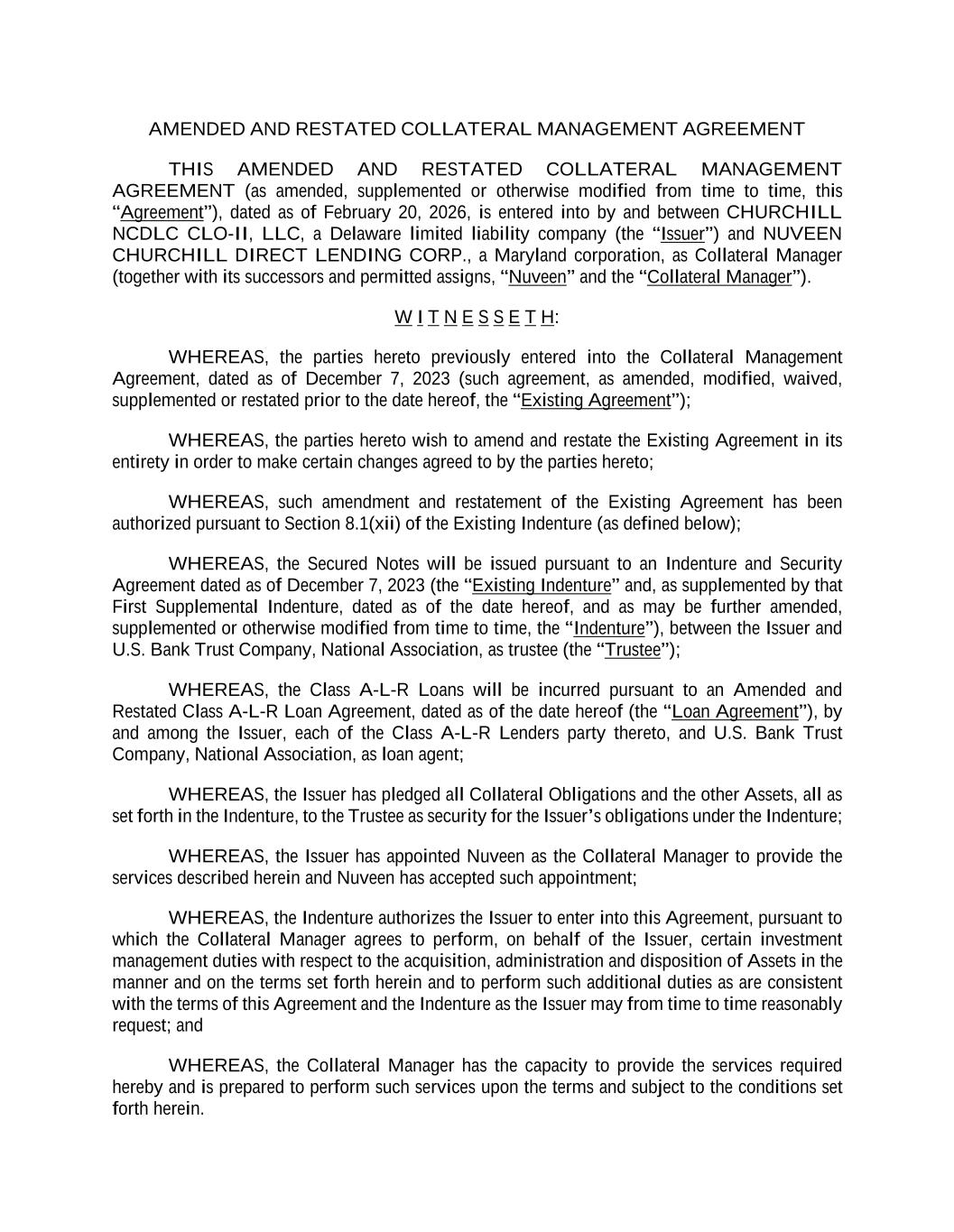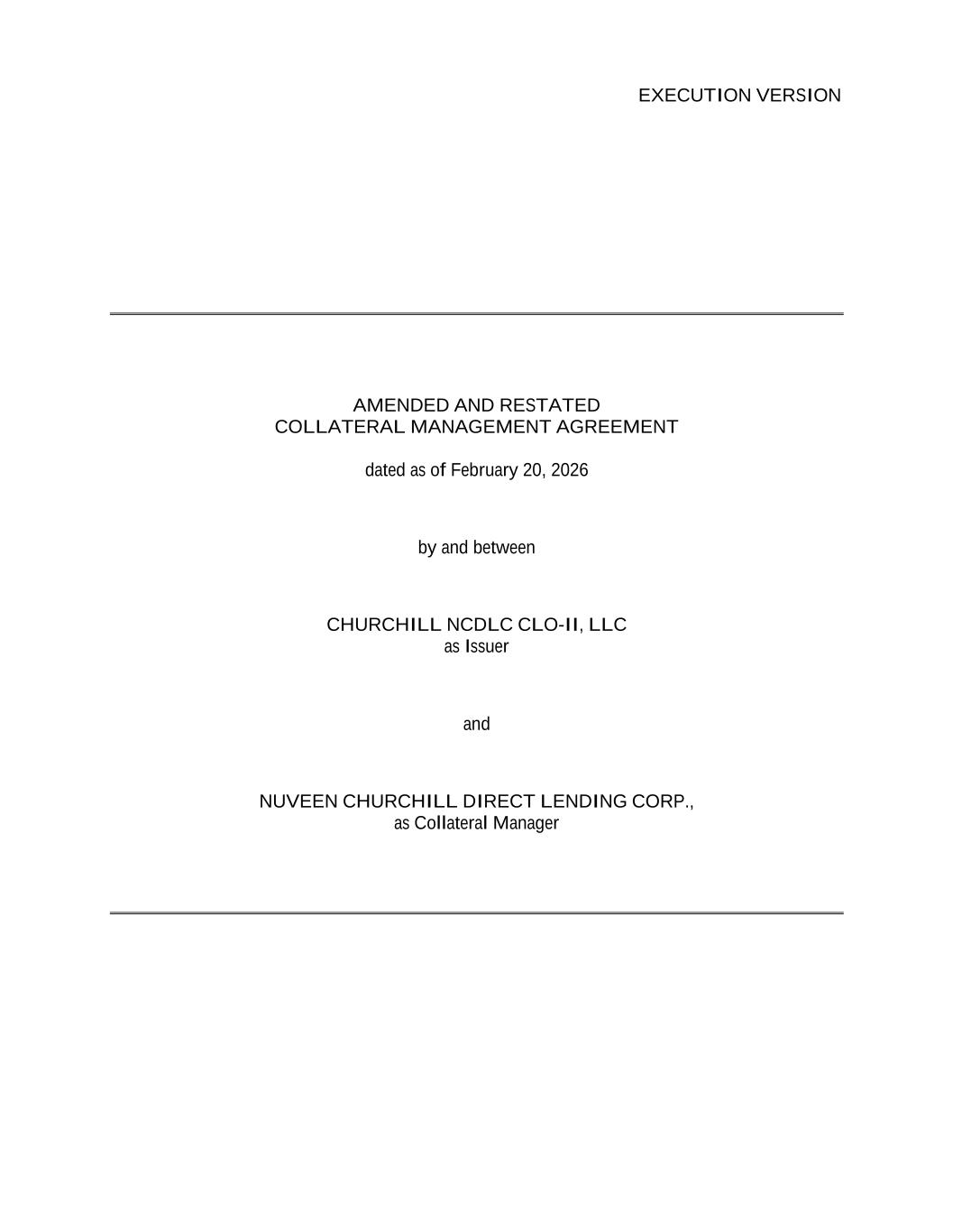 AMENDED AND RESTATED COLLATERAL MANAGEMENT AGREEMENT THIS AMENDED AND RESTATED COLLATERAL MANAGEMENT AGREEMENT (as amended, supplemented or otherwise modified from time to time, this “Agreement”), dated as of February 20, 2026, is entered into by and between CHURCHILL NCDLC CLO-II, LLC, a Delaware limited liability company (the “Issuer”) and NUVEEN CHURCHILL DIRECT LENDING CORP., a Maryland corporation, as Collateral Manager (together with its successors and permitted assigns, “Nuveen” and the “Collateral Manager”). W I T N E S S E T H: WHEREAS, the parties hereto previously entered into the Collateral Management Agreement, dated as of December 7, 2023 (such agreement, as amended, modified, waived, supplemented or restated prior to the date hereof, the “Existing Agreement”); WHEREAS, the parties hereto wish to amend and restate the Existing Agreement in its entirety in order to make certain changes agreed to by the parties hereto; WHEREAS, such amendment and restatement of the Existing Agreement has been authorized pursuant to Section 8.1(xii) of the Existing Indenture (as defined below); WHEREAS, the Secured Notes will be issued pursuant to an Indenture and Security Agreement dated as of December 7, 2023 (the “Existing Indenture” and, as supplemented by that First Supplemental Indenture, dated as of the date hereof, and as may be further amended, supplemented or otherwise modified from time to time, the “Indenture”), between the Issuer and U.S. Bank Trust Company, National Association, as trustee (the “Trustee”); WHEREAS, the Class A-L-R Loans will be incurred pursuant to an Amended and Restated Class A-L-R Loan Agreement, dated as of the date hereof (the “Loan Agreement”), by and among the Issuer, each of the Class A-L-R Lenders party thereto, and U.S. Bank Trust Company, National Association, as loan agent; WHEREAS, the Issuer has pledged all Collateral Obligations and the other Assets, all as set forth in the Indenture, to the Trustee as security for the Issuer’s obligations under the Indenture; WHEREAS, the Issuer has appointed Nuveen as the Collateral Manager to provide the services described herein and Nuveen has accepted such appointment; WHEREAS, the Indenture authorizes the Issuer to enter into this Agreement, pursuant to which the Collateral Manager agrees to perform, on behalf of the Issuer, certain investment management duties with respect to the acquisition, administration and disposition of Assets in the manner and on the terms set forth herein and to perform such additional duties as are consistent with the terms of this Agreement and the Indenture as the Issuer may from time to time reasonably request; and WHEREAS, the Collateral Manager has the capacity to provide the services required hereby and is prepared to perform such services upon the terms and subject to the conditions set forth herein.