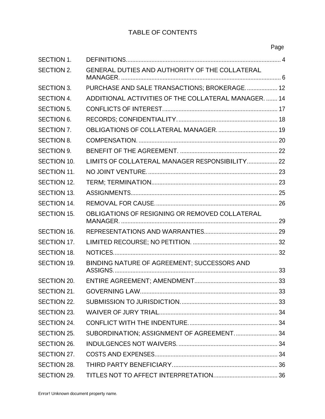 TABLE OF CONTENTS Page Error! Unknown document property name. SECTION 1. DEFINITIONS. ................................................................................................ 4 SECTION 2. GENERAL DUTIES AND AUTHORITY OF THE COLLATERAL MANAGER. .................................................................................................... 6 SECTION 3. PURCHASE AND SALE TRANSACTIONS; BROKERAGE. ................... 12 SECTION 4. ADDITIONAL ACTIVITIES OF THE COLLATERAL MANAGER. ....... 14 SECTION 5. CONFLICTS OF INTEREST. ....................................................................... 17 SECTION 6. RECORDS; CONFIDENTIALITY. .............................................................. 18 SECTION 7. OBLIGATIONS OF COLLATERAL MANAGER. ..................................... 19 SECTION 8. COMPENSATION. ....................................................................................... 20 SECTION 9. BENEFIT OF THE AGREEMENT. ............................................................. 22 SECTION 10. LIMITS OF COLLATERAL MANAGER RESPONSIBILITY. .................. 22 SECTION 11. NO JOINT VENTURE. ................................................................................. 23 SECTION 12. TERM; TERMINATION............................................................................... 23 SECTION 13. ASSIGNMENTS............................................................................................ 25 SECTION 14. REMOVAL FOR CAUSE. ............................................................................ 26 SECTION 15. OBLIGATIONS OF RESIGNING OR REMOVED COLLATERAL MANAGER. .................................................................................................. 29 SECTION 16. REPRESENTATIONS AND WARRANTIES.............................................. 29 SECTION 17. LIMITED RECOURSE; NO PETITION. ..................................................... 32 SECTION 18. NOTICES. ...................................................................................................... 32 SECTION 19. BINDING NATURE OF AGREEMENT; SUCCESSORS AND ASSIGNS. ...................................................................................................... 33 SECTION 20. ENTIRE AGREEMENT; AMENDMENT.................................................... 33 SECTION 21. GOVERNING LAW. ..................................................................................... 33 SECTION 22. SUBMISSION TO JURISDICTION. ............................................................ 33 SECTION 23. WAIVER OF JURY TRIAL. ......................................................................... 34 SECTION 24. CONFLICT WITH THE INDENTURE. ....................................................... 34 SECTION 25. SUBORDINATION; ASSIGNMENT OF AGREEMENT. .......................... 34 SECTION 26. INDULGENCES NOT WAIVERS. .............................................................. 34 SECTION 27. COSTS AND EXPENSES. ............................................................................ 34 SECTION 28. THIRD PARTY BENEFICIARY. ................................................................. 36 SECTION 29. TITLES NOT TO AFFECT INTERPRETATION. ....................................... 36