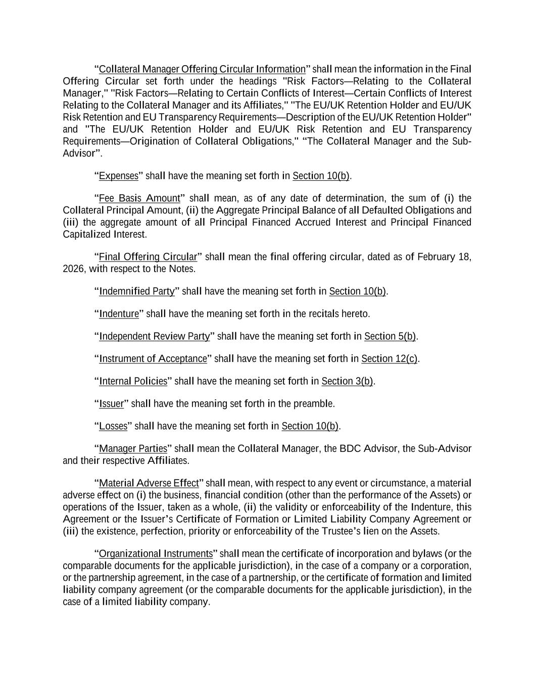 “Collateral Manager Offering Circular Information” shall mean the information in the Final Offering Circular set forth under the headings "Risk Factors—Relating to the Collateral Manager," "Risk Factors—Relating to Certain Conflicts of Interest—Certain Conflicts of Interest Relating to the Collateral Manager and its Affiliates," "The EU/UK Retention Holder and EU/UK Risk Retention and EU Transparency Requirements—Description of the EU/UK Retention Holder" and "The EU/UK Retention Holder and EU/UK Risk Retention and EU Transparency Requirements—Origination of Collateral Obligations," “The Collateral Manager and the Sub- Advisor”. “Expenses” shall have the meaning set forth in Section 10(b). “Fee Basis Amount” shall mean, as of any date of determination, the sum of (i) the Collateral Principal Amount, (ii) the Aggregate Principal Balance of all Defaulted Obligations and (iii) the aggregate amount of all Principal Financed Accrued Interest and Principal Financed Capitalized Interest. “Final Offering Circular” shall mean the final offering circular, dated as of February 18, 2026, with respect to the Notes. “Indemnified Party” shall have the meaning set forth in Section 10(b). “Indenture” shall have the meaning set forth in the recitals hereto. “Independent Review Party” shall have the meaning set forth in Section 5(b). “Instrument of Acceptance” shall have the meaning set forth in Section 12(c). “Internal Policies” shall have the meaning set forth in Section 3(b). “Issuer” shall have the meaning set forth in the preamble. “Losses” shall have the meaning set forth in Section 10(b). “Manager Parties” shall mean the Collateral Manager, the BDC Advisor, the Sub-Advisor and their respective Affiliates. “Material Adverse Effect” shall mean, with respect to any event or circumstance, a material adverse effect on (i) the business, financial condition (other than the performance of the Assets) or operations of the Issuer, taken as a whole, (ii) the validity or enforceability of the Indenture, this Agreement or the Issuer’s Certificate of Formation or Limited Liability Company Agreement or (iii) the existence, perfection, priority or enforceability of the Trustee’s lien on the Assets. “Organizational Instruments” shall mean the certificate of incorporation and bylaws (or the comparable documents for the applicable jurisdiction), in the case of a company or a corporation, or the partnership agreement, in the case of a partnership, or the certificate of formation and limited liability company agreement (or the comparable documents for the applicable jurisdiction), in the case of a limited liability company.