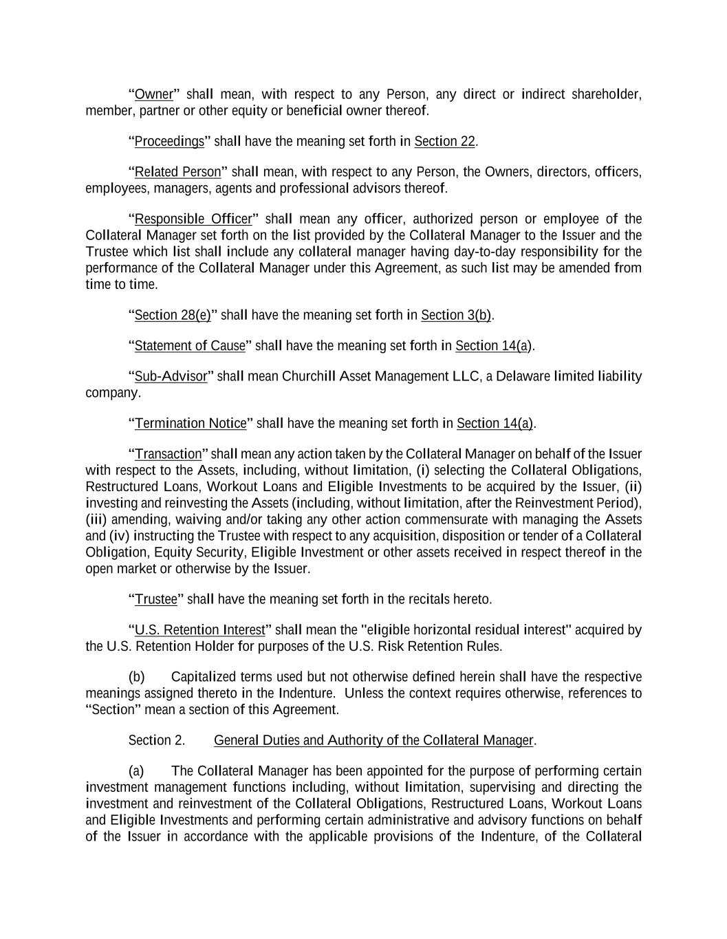 “Owner” shall mean, with respect to any Person, any direct or indirect shareholder, member, partner or other equity or beneficial owner thereof. “Proceedings” shall have the meaning set forth in Section 22. “Related Person” shall mean, with respect to any Person, the Owners, directors, officers, employees, managers, agents and professional advisors thereof. “Responsible Officer” shall mean any officer, authorized person or employee of the Collateral Manager set forth on the list provided by the Collateral Manager to the Issuer and the Trustee which list shall include any collateral manager having day-to-day responsibility for the performance of the Collateral Manager under this Agreement, as such list may be amended from time to time. “Section 28(e)” shall have the meaning set forth in Section 3(b). “Statement of Cause” shall have the meaning set forth in Section 14(a). “Sub-Advisor” shall mean Churchill Asset Management LLC, a Delaware limited liability company. “Termination Notice” shall have the meaning set forth in Section 14(a). “Transaction” shall mean any action taken by the Collateral Manager on behalf of the Issuer with respect to the Assets, including, without limitation, (i) selecting the Collateral Obligations, Restructured Loans, Workout Loans and Eligible Investments to be acquired by the Issuer, (ii) investing and reinvesting the Assets (including, without limitation, after the Reinvestment Period), (iii) amending, waiving and/or taking any other action commensurate with managing the Assets and (iv) instructing the Trustee with respect to any acquisition, disposition or tender of a Collateral Obligation, Equity Security, Eligible Investment or other assets received in respect thereof in the open market or otherwise by the Issuer. “Trustee” shall have the meaning set forth in the recitals hereto. “U.S. Retention Interest” shall mean the "eligible horizontal residual interest" acquired by the U.S. Retention Holder for purposes of the U.S. Risk Retention Rules. (b) Capitalized terms used but not otherwise defined herein shall have the respective meanings assigned thereto in the Indenture. Unless the context requires otherwise, references to “Section” mean a section of this Agreement. Section 2. General Duties and Authority of the Collateral Manager. (a) The Collateral Manager has been appointed for the purpose of performing certain investment management functions including, without limitation, supervising and directing the investment and reinvestment of the Collateral Obligations, Restructured Loans, Workout Loans and Eligible Investments and performing certain administrative and advisory functions on behalf of the Issuer in accordance with the applicable provisions of the Indenture, of the Collateral