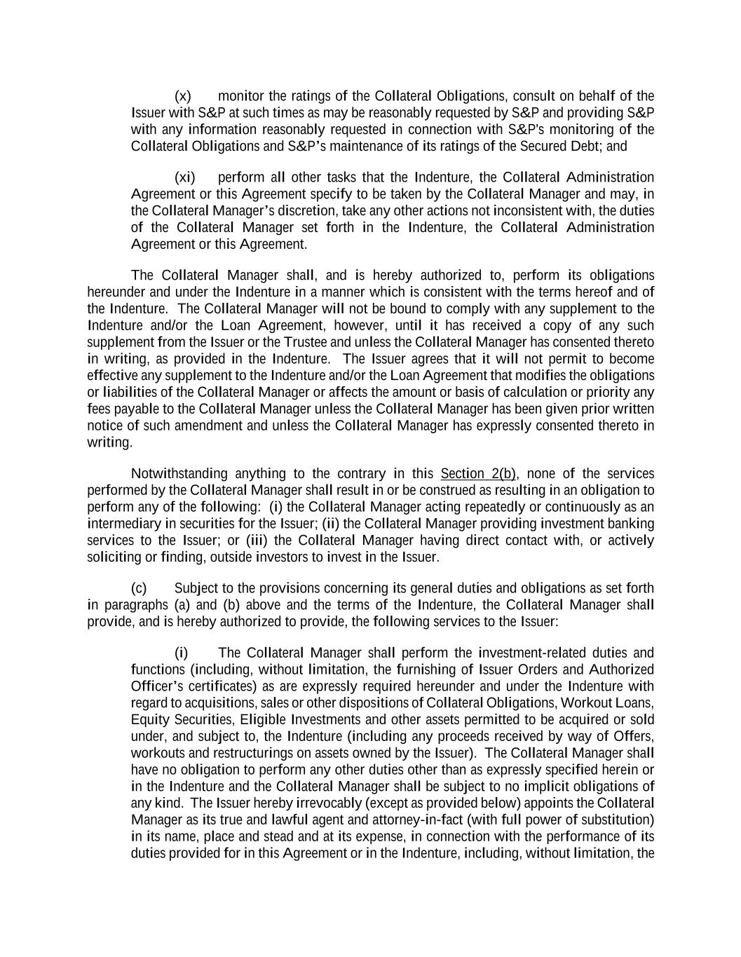 (x) monitor the ratings of the Collateral Obligations, consult on behalf of the Issuer with S&P at such times as may be reasonably requested by S&P and providing S&P with any information reasonably requested in connection with S&P's monitoring of the Collateral Obligations and S&P’s maintenance of its ratings of the Secured Debt; and (xi) perform all other tasks that the Indenture, the Collateral Administration Agreement or this Agreement specify to be taken by the Collateral Manager and may, in the Collateral Manager’s discretion, take any other actions not inconsistent with, the duties of the Collateral Manager set forth in the Indenture, the Collateral Administration Agreement or this Agreement. The Collateral Manager shall, and is hereby authorized to, perform its obligations hereunder and under the Indenture in a manner which is consistent with the terms hereof and of the Indenture. The Collateral Manager will not be bound to comply with any supplement to the Indenture and/or the Loan Agreement, however, until it has received a copy of any such supplement from the Issuer or the Trustee and unless the Collateral Manager has consented thereto in writing, as provided in the Indenture. The Issuer agrees that it will not permit to become effective any supplement to the Indenture and/or the Loan Agreement that modifies the obligations or liabilities of the Collateral Manager or affects the amount or basis of calculation or priority any fees payable to the Collateral Manager unless the Collateral Manager has been given prior written notice of such amendment and unless the Collateral Manager has expressly consented thereto in writing. Notwithstanding anything to the contrary in this Section 2(b), none of the services performed by the Collateral Manager shall result in or be construed as resulting in an obligation to perform any of the following: (i) the Collateral Manager acting repeatedly or continuously as an intermediary in securities for the Issuer; (ii) the Collateral Manager providing investment banking services to the Issuer; or (iii) the Collateral Manager having direct contact with, or actively soliciting or finding, outside investors to invest in the Issuer. (c) Subject to the provisions concerning its general duties and obligations as set forth in paragraphs (a) and (b) above and the terms of the Indenture, the Collateral Manager shall provide, and is hereby authorized to provide, the following services to the Issuer: (i) The Collateral Manager shall perform the investment-related duties and functions (including, without limitation, the furnishing of Issuer Orders and Authorized Officer’s certificates) as are expressly required hereunder and under the Indenture with regard to acquisitions, sales or other dispositions of Collateral Obligations, Workout Loans, Equity Securities, Eligible Investments and other assets permitted to be acquired or sold under, and subject to, the Indenture (including any proceeds received by way of Offers, workouts and restructurings on assets owned by the Issuer). The Collateral Manager shall have no obligation to perform any other duties other than as expressly specified herein or in the Indenture and the Collateral Manager shall be subject to no implicit obligations of any kind. The Issuer hereby irrevocably (except as provided below) appoints the Collateral Manager as its true and lawful agent and attorney-in-fact (with full power of substitution) in its name, place and stead and at its expense, in connection with the performance of its duties provided for in this Agreement or in the Indenture, including, without limitation, the