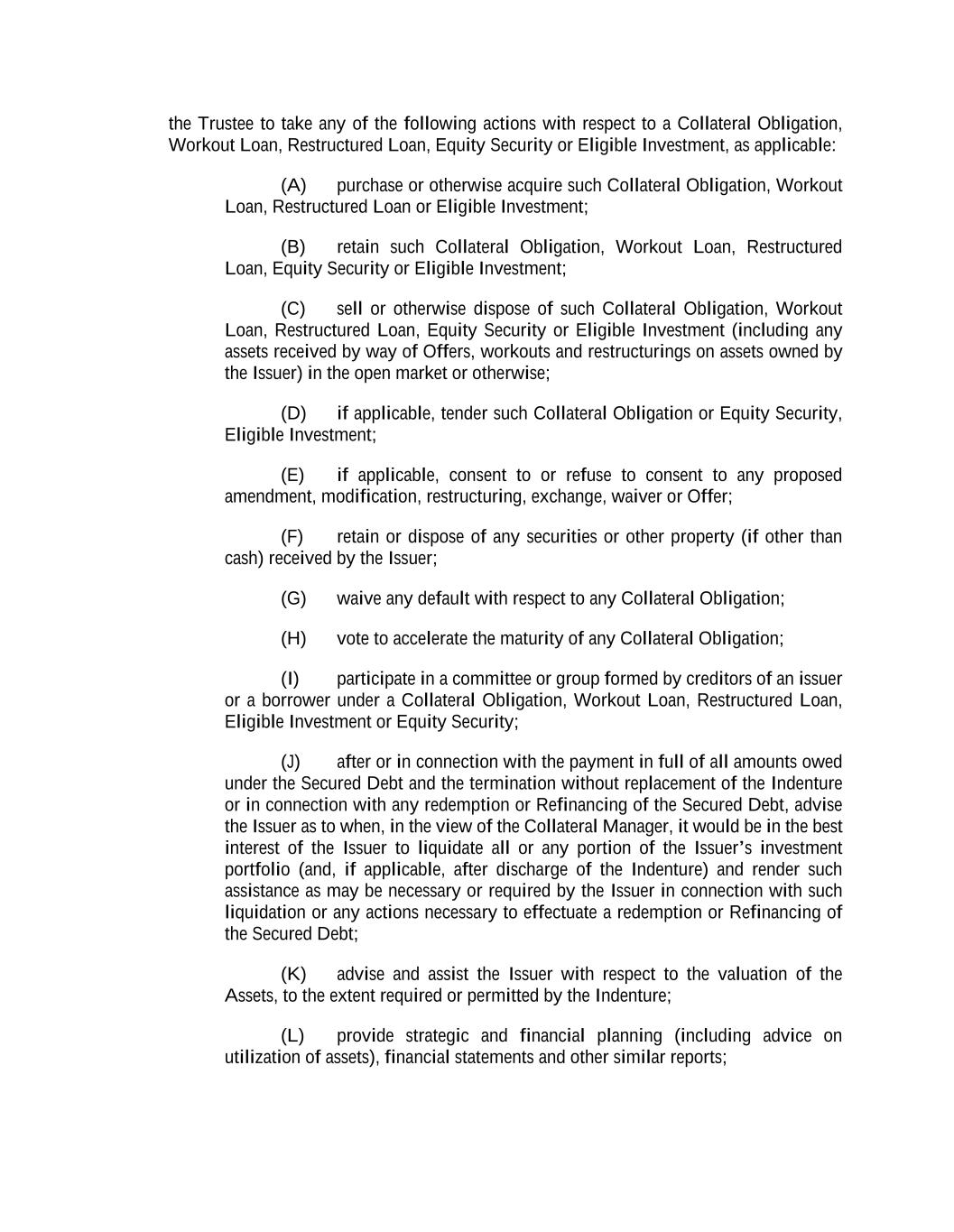the Trustee to take any of the following actions with respect to a Collateral Obligation, Workout Loan, Restructured Loan, Equity Security or Eligible Investment, as applicable: (A) purchase or otherwise acquire such Collateral Obligation, Workout Loan, Restructured Loan or Eligible Investment; (B) retain such Collateral Obligation, Workout Loan, Restructured Loan, Equity Security or Eligible Investment; (C) sell or otherwise dispose of such Collateral Obligation, Workout Loan, Restructured Loan, Equity Security or Eligible Investment (including any assets received by way of Offers, workouts and restructurings on assets owned by the Issuer) in the open market or otherwise; (D) if applicable, tender such Collateral Obligation or Equity Security, Eligible Investment; (E) if applicable, consent to or refuse to consent to any proposed amendment, modification, restructuring, exchange, waiver or Offer; (F) retain or dispose of any securities or other property (if other than cash) received by the Issuer; (G) waive any default with respect to any Collateral Obligation; (H) vote to accelerate the maturity of any Collateral Obligation; (I) participate in a committee or group formed by creditors of an issuer or a borrower under a Collateral Obligation, Workout Loan, Restructured Loan, Eligible Investment or Equity Security; (J) after or in connection with the payment in full of all amounts owed under the Secured Debt and the termination without replacement of the Indenture or in connection with any redemption or Refinancing of the Secured Debt, advise the Issuer as to when, in the view of the Collateral Manager, it would be in the best interest of the Issuer to liquidate all or any portion of the Issuer’s investment portfolio (and, if applicable, after discharge of the Indenture) and render such assistance as may be necessary or required by the Issuer in connection with such liquidation or any actions necessary to effectuate a redemption or Refinancing of the Secured Debt; (K) advise and assist the Issuer with respect to the valuation of the Assets, to the extent required or permitted by the Indenture; (L) provide strategic and financial planning (including advice on utilization of assets), financial statements and other similar reports;