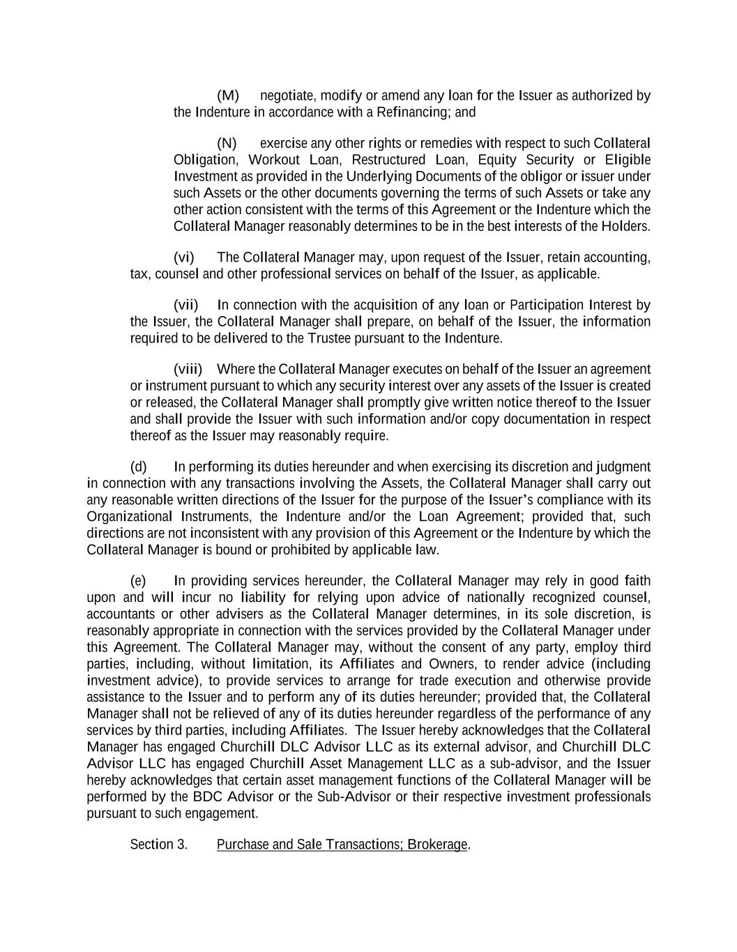 (M) negotiate, modify or amend any loan for the Issuer as authorized by the Indenture in accordance with a Refinancing; and (N) exercise any other rights or remedies with respect to such Collateral Obligation, Workout Loan, Restructured Loan, Equity Security or Eligible Investment as provided in the Underlying Documents of the obligor or issuer under such Assets or the other documents governing the terms of such Assets or take any other action consistent with the terms of this Agreement or the Indenture which the Collateral Manager reasonably determines to be in the best interests of the Holders. (vi) The Collateral Manager may, upon request of the Issuer, retain accounting, tax, counsel and other professional services on behalf of the Issuer, as applicable. (vii) In connection with the acquisition of any loan or Participation Interest by the Issuer, the Collateral Manager shall prepare, on behalf of the Issuer, the information required to be delivered to the Trustee pursuant to the Indenture. (viii) Where the Collateral Manager executes on behalf of the Issuer an agreement or instrument pursuant to which any security interest over any assets of the Issuer is created or released, the Collateral Manager shall promptly give written notice thereof to the Issuer and shall provide the Issuer with such information and/or copy documentation in respect thereof as the Issuer may reasonably require. (d) In performing its duties hereunder and when exercising its discretion and judgment in connection with any transactions involving the Assets, the Collateral Manager shall carry out any reasonable written directions of the Issuer for the purpose of the Issuer’s compliance with its Organizational Instruments, the Indenture and/or the Loan Agreement; provided that, such directions are not inconsistent with any provision of this Agreement or the Indenture by which the Collateral Manager is bound or prohibited by applicable law. (e) In providing services hereunder, the Collateral Manager may rely in good faith upon and will incur no liability for relying upon advice of nationally recognized counsel, accountants or other advisers as the Collateral Manager determines, in its sole discretion, is reasonably appropriate in connection with the services provided by the Collateral Manager under this Agreement. The Collateral Manager may, without the consent of any party, employ third parties, including, without limitation, its Affiliates and Owners, to render advice (including investment advice), to provide services to arrange for trade execution and otherwise provide assistance to the Issuer and to perform any of its duties hereunder; provided that, the Collateral Manager shall not be relieved of any of its duties hereunder regardless of the performance of any services by third parties, including Affiliates. The Issuer hereby acknowledges that the Collateral Manager has engaged Churchill DLC Advisor LLC as its external advisor, and Churchill DLC Advisor LLC has engaged Churchill Asset Management LLC as a sub-advisor, and the Issuer hereby acknowledges that certain asset management functions of the Collateral Manager will be performed by the BDC Advisor or the Sub-Advisor or their respective investment professionals pursuant to such engagement. Section 3. Purchase and Sale Transactions; Brokerage.