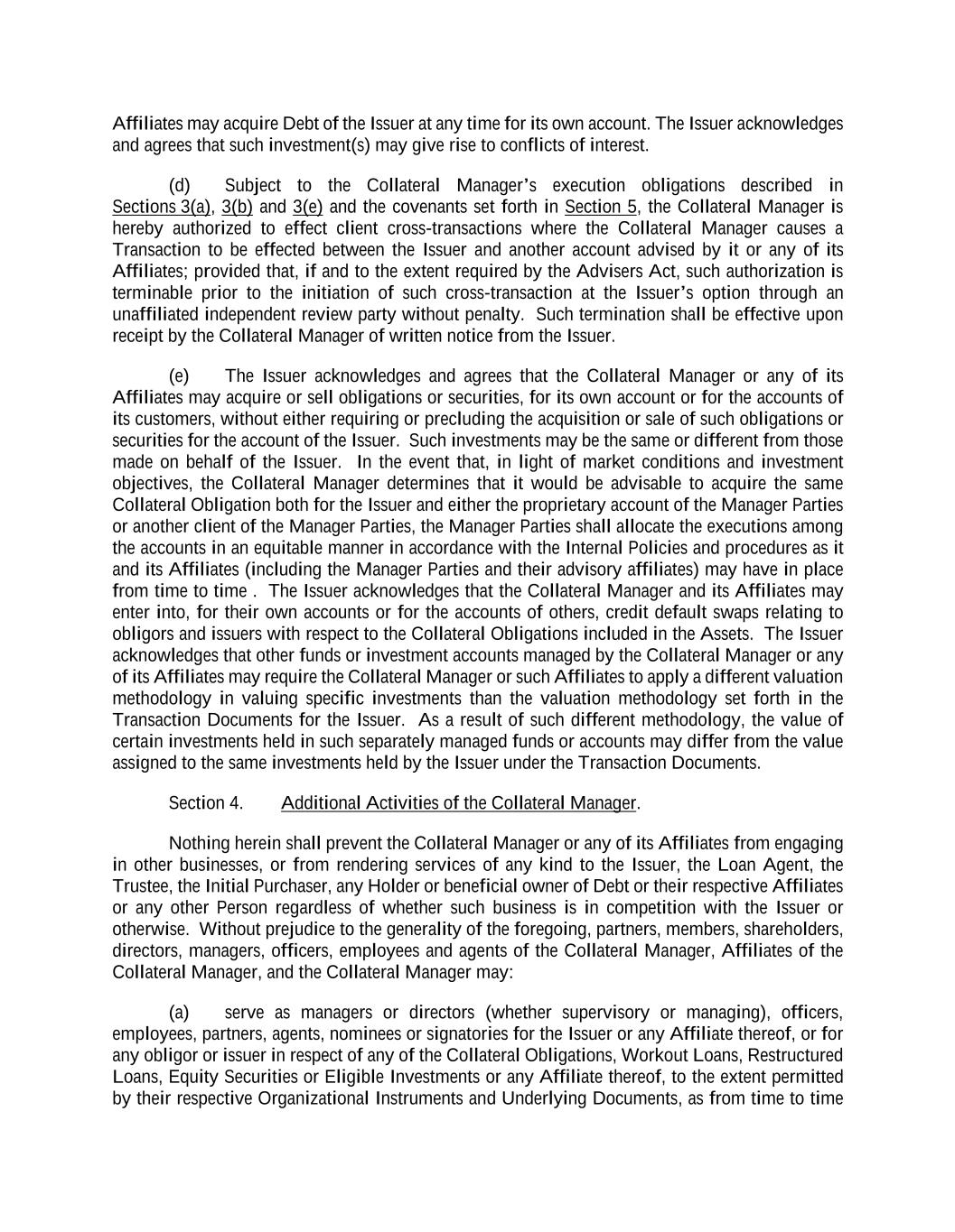 Affiliates may acquire Debt of the Issuer at any time for its own account. The Issuer acknowledges and agrees that such investment(s) may give rise to conflicts of interest. (d) Subject to the Collateral Manager’s execution obligations described in Sections 3(a), 3(b) and 3(e) and the covenants set forth in Section 5, the Collateral Manager is hereby authorized to effect client cross-transactions where the Collateral Manager causes a Transaction to be effected between the Issuer and another account advised by it or any of its Affiliates; provided that, if and to the extent required by the Advisers Act, such authorization is terminable prior to the initiation of such cross-transaction at the Issuer’s option through an unaffiliated independent review party without penalty. Such termination shall be effective upon receipt by the Collateral Manager of written notice from the Issuer. (e) The Issuer acknowledges and agrees that the Collateral Manager or any of its Affiliates may acquire or sell obligations or securities, for its own account or for the accounts of its customers, without either requiring or precluding the acquisition or sale of such obligations or securities for the account of the Issuer. Such investments may be the same or different from those made on behalf of the Issuer. In the event that, in light of market conditions and investment objectives, the Collateral Manager determines that it would be advisable to acquire the same Collateral Obligation both for the Issuer and either the proprietary account of the Manager Parties or another client of the Manager Parties, the Manager Parties shall allocate the executions among the accounts in an equitable manner in accordance with the Internal Policies and procedures as it and its Affiliates (including the Manager Parties and their advisory affiliates) may have in place from time to time . The Issuer acknowledges that the Collateral Manager and its Affiliates may enter into, for their own accounts or for the accounts of others, credit default swaps relating to obligors and issuers with respect to the Collateral Obligations included in the Assets. The Issuer acknowledges that other funds or investment accounts managed by the Collateral Manager or any of its Affiliates may require the Collateral Manager or such Affiliates to apply a different valuation methodology in valuing specific investments than the valuation methodology set forth in the Transaction Documents for the Issuer. As a result of such different methodology, the value of certain investments held in such separately managed funds or accounts may differ from the value assigned to the same investments held by the Issuer under the Transaction Documents. Section 4. Additional Activities of the Collateral Manager. Nothing herein shall prevent the Collateral Manager or any of its Affiliates from engaging in other businesses, or from rendering services of any kind to the Issuer, the Loan Agent, the Trustee, the Initial Purchaser, any Holder or beneficial owner of Debt or their respective Affiliates or any other Person regardless of whether such business is in competition with the Issuer or otherwise. Without prejudice to the generality of the foregoing, partners, members, shareholders, directors, managers, officers, employees and agents of the Collateral Manager, Affiliates of the Collateral Manager, and the Collateral Manager may: (a) serve as managers or directors (whether supervisory or managing), officers, employees, partners, agents, nominees or signatories for the Issuer or any Affiliate thereof, or for any obligor or issuer in respect of any of the Collateral Obligations, Workout Loans, Restructured Loans, Equity Securities or Eligible Investments or any Affiliate thereof, to the extent permitted by their respective Organizational Instruments and Underlying Documents, as from time to time
