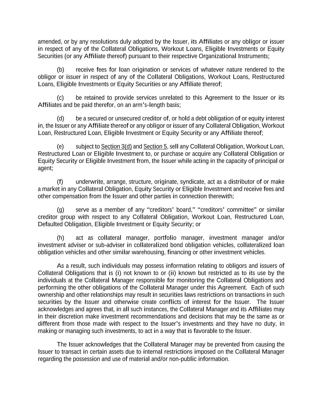 amended, or by any resolutions duly adopted by the Issuer, its Affiliates or any obligor or issuer in respect of any of the Collateral Obligations, Workout Loans, Eligible Investments or Equity Securities (or any Affiliate thereof) pursuant to their respective Organizational Instruments; (b) receive fees for loan origination or services of whatever nature rendered to the obligor or issuer in respect of any of the Collateral Obligations, Workout Loans, Restructured Loans, Eligible Investments or Equity Securities or any Affiliate thereof; (c) be retained to provide services unrelated to this Agreement to the Issuer or its Affiliates and be paid therefor, on an arm’s-length basis; (d) be a secured or unsecured creditor of, or hold a debt obligation of or equity interest in, the Issuer or any Affiliate thereof or any obligor or issuer of any Collateral Obligation, Workout Loan, Restructured Loan, Eligible Investment or Equity Security or any Affiliate thereof; (e) subject to Section 3(d) and Section 5, sell any Collateral Obligation, Workout Loan, Restructured Loan or Eligible Investment to, or purchase or acquire any Collateral Obligation or Equity Security or Eligible Investment from, the Issuer while acting in the capacity of principal or agent; (f) underwrite, arrange, structure, originate, syndicate, act as a distributor of or make a market in any Collateral Obligation, Equity Security or Eligible Investment and receive fees and other compensation from the Issuer and other parties in connection therewith; (g) serve as a member of any “creditors’ board,” “creditors’ committee” or similar creditor group with respect to any Collateral Obligation, Workout Loan, Restructured Loan, Defaulted Obligation, Eligible Investment or Equity Security; or (h) act as collateral manager, portfolio manager, investment manager and/or investment adviser or sub-adviser in collateralized bond obligation vehicles, collateralized loan obligation vehicles and other similar warehousing, financing or other investment vehicles. As a result, such individuals may possess information relating to obligors and issuers of Collateral Obligations that is (i) not known to or (ii) known but restricted as to its use by the individuals at the Collateral Manager responsible for monitoring the Collateral Obligations and performing the other obligations of the Collateral Manager under this Agreement. Each of such ownership and other relationships may result in securities laws restrictions on transactions in such securities by the Issuer and otherwise create conflicts of interest for the Issuer. The Issuer acknowledges and agrees that, in all such instances, the Collateral Manager and its Affiliates may in their discretion make investment recommendations and decisions that may be the same as or different from those made with respect to the Issuer’s investments and they have no duty, in making or managing such investments, to act in a way that is favorable to the Issuer. The Issuer acknowledges that the Collateral Manager may be prevented from causing the Issuer to transact in certain assets due to internal restrictions imposed on the Collateral Manager regarding the possession and use of material and/or non-public information.