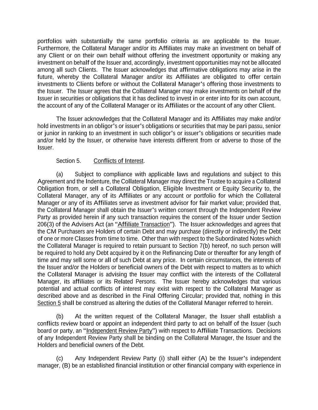 portfolios with substantially the same portfolio criteria as are applicable to the Issuer. Furthermore, the Collateral Manager and/or its Affiliates may make an investment on behalf of any Client or on their own behalf without offering the investment opportunity or making any investment on behalf of the Issuer and, accordingly, investment opportunities may not be allocated among all such Clients. The Issuer acknowledges that affirmative obligations may arise in the future, whereby the Collateral Manager and/or its Affiliates are obligated to offer certain investments to Clients before or without the Collateral Manager’s offering those investments to the Issuer. The Issuer agrees that the Collateral Manager may make investments on behalf of the Issuer in securities or obligations that it has declined to invest in or enter into for its own account, the account of any of the Collateral Manager or its Affiliates or the account of any other Client. The Issuer acknowledges that the Collateral Manager and its Affiliates may make and/or hold investments in an obligor’s or issuer’s obligations or securities that may be pari passu, senior or junior in ranking to an investment in such obligor’s or issuer’s obligations or securities made and/or held by the Issuer, or otherwise have interests different from or adverse to those of the Issuer. Section 5. Conflicts of Interest. (a) Subject to compliance with applicable laws and regulations and subject to this Agreement and the Indenture, the Collateral Manager may direct the Trustee to acquire a Collateral Obligation from, or sell a Collateral Obligation, Eligible Investment or Equity Security to, the Collateral Manager, any of its Affiliates or any account or portfolio for which the Collateral Manager or any of its Affiliates serve as investment advisor for fair market value; provided that, the Collateral Manager shall obtain the Issuer’s written consent through the Independent Review Party as provided herein if any such transaction requires the consent of the Issuer under Section 206(3) of the Advisers Act (an “Affiliate Transaction”). The Issuer acknowledges and agrees that the CM Purchasers are Holders of certain Debt and may purchase (directly or indirectly) the Debt of one or more Classes from time to time. Other than with respect to the Subordinated Notes which the Collateral Manager is required to retain pursuant to Section 7(b) hereof, no such person will be required to hold any Debt acquired by it on the Refinancing Date or thereafter for any length of time and may sell some or all of such Debt at any price. In certain circumstances, the interests of the Issuer and/or the Holders or beneficial owners of the Debt with respect to matters as to which the Collateral Manager is advising the Issuer may conflict with the interests of the Collateral Manager, its affiliates or its Related Persons. The Issuer hereby acknowledges that various potential and actual conflicts of interest may exist with respect to the Collateral Manager as described above and as described in the Final Offering Circular; provided that, nothing in this Section 5 shall be construed as altering the duties of the Collateral Manager referred to herein. (b) At the written request of the Collateral Manager, the Issuer shall establish a conflicts review board or appoint an independent third party to act on behalf of the Issuer (such board or party, an “Independent Review Party”) with respect to Affiliate Transactions. Decisions of any Independent Review Party shall be binding on the Collateral Manager, the Issuer and the Holders and beneficial owners of the Debt. (c) Any Independent Review Party (i) shall either (A) be the Issuer’s independent manager, (B) be an established financial institution or other financial company with experience in