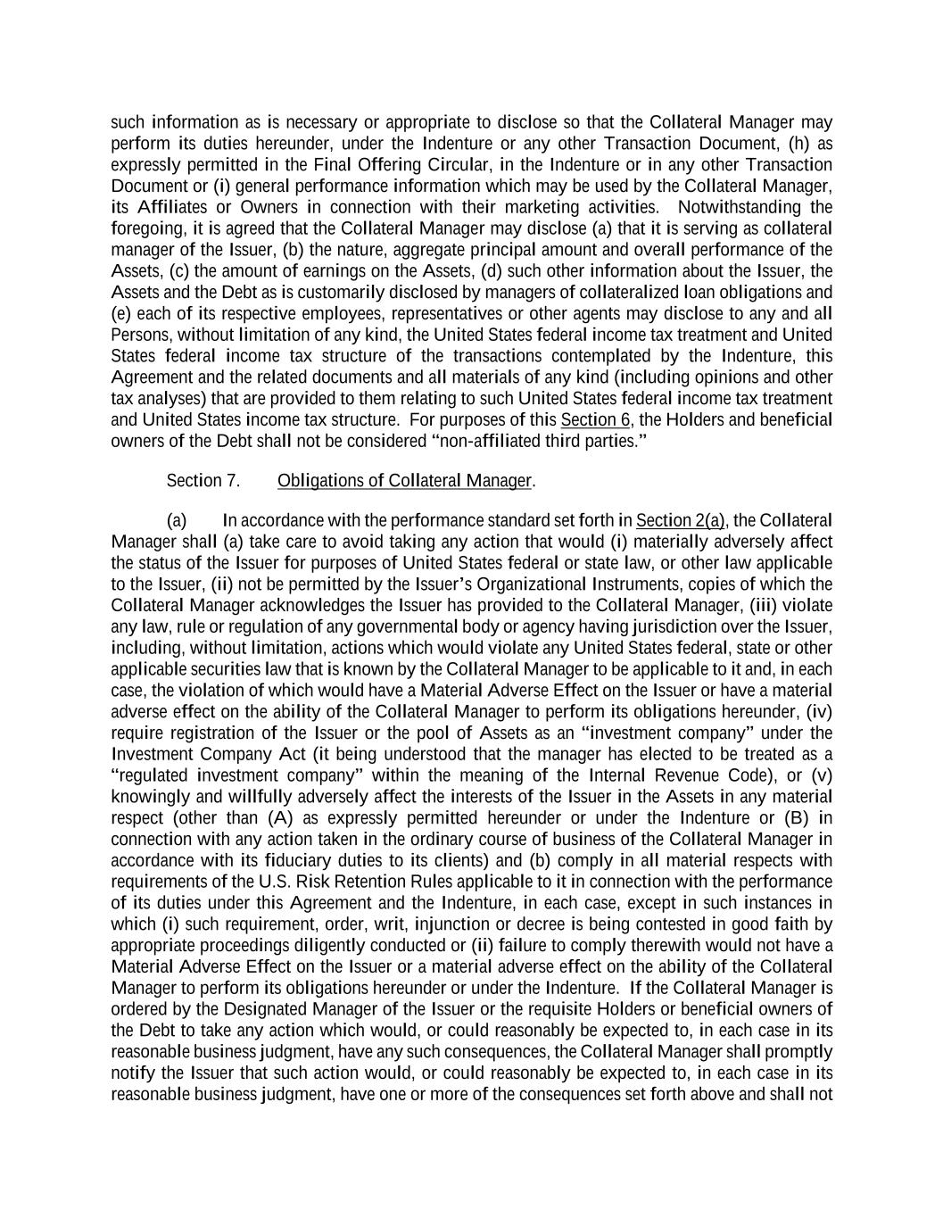 such information as is necessary or appropriate to disclose so that the Collateral Manager may perform its duties hereunder, under the Indenture or any other Transaction Document, (h) as expressly permitted in the Final Offering Circular, in the Indenture or in any other Transaction Document or (i) general performance information which may be used by the Collateral Manager, its Affiliates or Owners in connection with their marketing activities. Notwithstanding the foregoing, it is agreed that the Collateral Manager may disclose (a) that it is serving as collateral manager of the Issuer, (b) the nature, aggregate principal amount and overall performance of the Assets, (c) the amount of earnings on the Assets, (d) such other information about the Issuer, the Assets and the Debt as is customarily disclosed by managers of collateralized loan obligations and (e) each of its respective employees, representatives or other agents may disclose to any and all Persons, without limitation of any kind, the United States federal income tax treatment and United States federal income tax structure of the transactions contemplated by the Indenture, this Agreement and the related documents and all materials of any kind (including opinions and other tax analyses) that are provided to them relating to such United States federal income tax treatment and United States income tax structure. For purposes of this Section 6, the Holders and beneficial owners of the Debt shall not be considered “non-affiliated third parties.” Section 7. Obligations of Collateral Manager. (a) In accordance with the performance standard set forth in Section 2(a), the Collateral Manager shall (a) take care to avoid taking any action that would (i) materially adversely affect the status of the Issuer for purposes of United States federal or state law, or other law applicable to the Issuer, (ii) not be permitted by the Issuer’s Organizational Instruments, copies of which the Collateral Manager acknowledges the Issuer has provided to the Collateral Manager, (iii) violate any law, rule or regulation of any governmental body or agency having jurisdiction over the Issuer, including, without limitation, actions which would violate any United States federal, state or other applicable securities law that is known by the Collateral Manager to be applicable to it and, in each case, the violation of which would have a Material Adverse Effect on the Issuer or have a material adverse effect on the ability of the Collateral Manager to perform its obligations hereunder, (iv) require registration of the Issuer or the pool of Assets as an “investment company” under the Investment Company Act (it being understood that the manager has elected to be treated as a “regulated investment company” within the meaning of the Internal Revenue Code), or (v) knowingly and willfully adversely affect the interests of the Issuer in the Assets in any material respect (other than (A) as expressly permitted hereunder or under the Indenture or (B) in connection with any action taken in the ordinary course of business of the Collateral Manager in accordance with its fiduciary duties to its clients) and (b) comply in all material respects with requirements of the U.S. Risk Retention Rules applicable to it in connection with the performance of its duties under this Agreement and the Indenture, in each case, except in such instances in which (i) such requirement, order, writ, injunction or decree is being contested in good faith by appropriate proceedings diligently conducted or (ii) failure to comply therewith would not have a Material Adverse Effect on the Issuer or a material adverse effect on the ability of the Collateral Manager to perform its obligations hereunder or under the Indenture. If the Collateral Manager is ordered by the Designated Manager of the Issuer or the requisite Holders or beneficial owners of the Debt to take any action which would, or could reasonably be expected to, in each case in its reasonable business judgment, have any such consequences, the Collateral Manager shall promptly notify the Issuer that such action would, or could reasonably be expected to, in each case in its reasonable business judgment, have one or more of the consequences set forth above and shall not