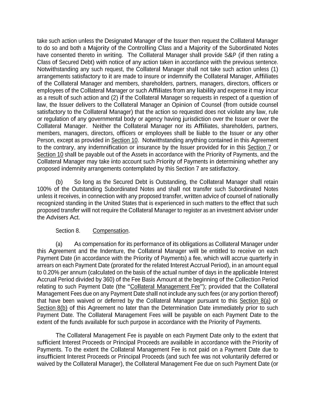 take such action unless the Designated Manager of the Issuer then request the Collateral Manager to do so and both a Majority of the Controlling Class and a Majority of the Subordinated Notes have consented thereto in writing. The Collateral Manager shall provide S&P (if then rating a Class of Secured Debt) with notice of any action taken in accordance with the previous sentence. Notwithstanding any such request, the Collateral Manager shall not take such action unless (1) arrangements satisfactory to it are made to insure or indemnify the Collateral Manager, Affiliates of the Collateral Manager and members, shareholders, partners, managers, directors, officers or employees of the Collateral Manager or such Affiliates from any liability and expense it may incur as a result of such action and (2) if the Collateral Manager so requests in respect of a question of law, the Issuer delivers to the Collateral Manager an Opinion of Counsel (from outside counsel satisfactory to the Collateral Manager) that the action so requested does not violate any law, rule or regulation of any governmental body or agency having jurisdiction over the Issuer or over the Collateral Manager. Neither the Collateral Manager nor its Affiliates, shareholders, partners, members, managers, directors, officers or employees shall be liable to the Issuer or any other Person, except as provided in Section 10. Notwithstanding anything contained in this Agreement to the contrary, any indemnification or insurance by the Issuer provided for in this Section 7 or Section 10 shall be payable out of the Assets in accordance with the Priority of Payments, and the Collateral Manager may take into account such Priority of Payments in determining whether any proposed indemnity arrangements contemplated by this Section 7 are satisfactory. (b) So long as the Secured Debt is Outstanding, the Collateral Manager shall retain 100% of the Outstanding Subordinated Notes and shall not transfer such Subordinated Notes unless it receives, in connection with any proposed transfer, written advice of counsel of nationally recognized standing in the United States that is experienced in such matters to the effect that such proposed transfer will not require the Collateral Manager to register as an investment adviser under the Advisers Act. Section 8. Compensation. (a) As compensation for its performance of its obligations as Collateral Manager under this Agreement and the Indenture, the Collateral Manager will be entitled to receive on each Payment Date (in accordance with the Priority of Payments) a fee, which will accrue quarterly in arrears on each Payment Date (prorated for the related Interest Accrual Period), in an amount equal to 0.20% per annum (calculated on the basis of the actual number of days in the applicable Interest Accrual Period divided by 360) of the Fee Basis Amount at the beginning of the Collection Period relating to such Payment Date (the “Collateral Management Fee”); provided that the Collateral Management Fees due on any Payment Date shall not include any such fees (or any portion thereof) that have been waived or deferred by the Collateral Manager pursuant to this Section 8(a) or Section 8(b) of this Agreement no later than the Determination Date immediately prior to such Payment Date. The Collateral Management Fees will be payable on each Payment Date to the extent of the funds available for such purpose in accordance with the Priority of Payments. The Collateral Management Fee is payable on each Payment Date only to the extent that sufficient Interest Proceeds or Principal Proceeds are available in accordance with the Priority of Payments. To the extent the Collateral Management Fee is not paid on a Payment Date due to insufficient Interest Proceeds or Principal Proceeds (and such fee was not voluntarily deferred or waived by the Collateral Manager), the Collateral Management Fee due on such Payment Date (or
