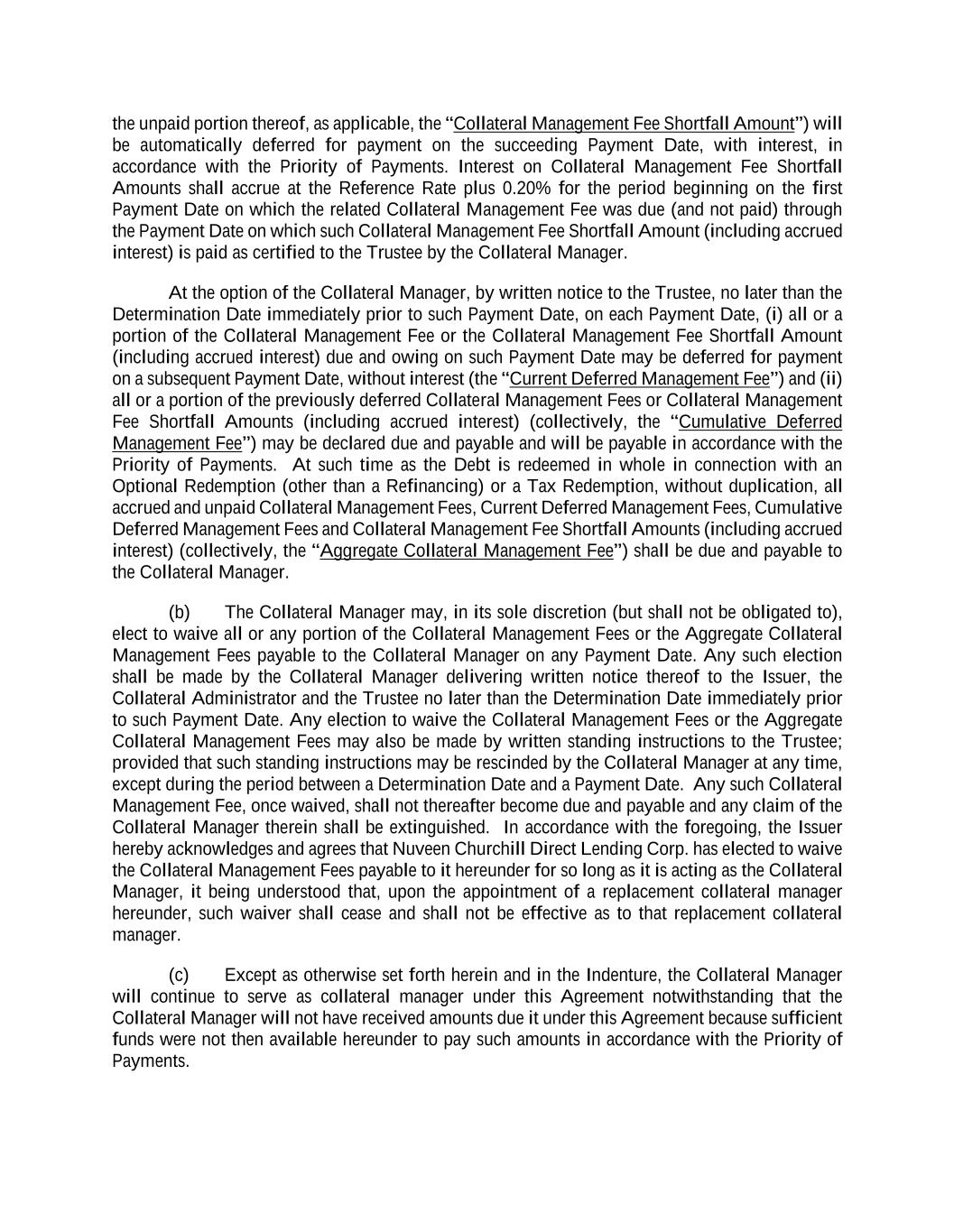 the unpaid portion thereof, as applicable, the “Collateral Management Fee Shortfall Amount”) will be automatically deferred for payment on the succeeding Payment Date, with interest, in accordance with the Priority of Payments. Interest on Collateral Management Fee Shortfall Amounts shall accrue at the Reference Rate plus 0.20% for the period beginning on the first Payment Date on which the related Collateral Management Fee was due (and not paid) through the Payment Date on which such Collateral Management Fee Shortfall Amount (including accrued interest) is paid as certified to the Trustee by the Collateral Manager. At the option of the Collateral Manager, by written notice to the Trustee, no later than the Determination Date immediately prior to such Payment Date, on each Payment Date, (i) all or a portion of the Collateral Management Fee or the Collateral Management Fee Shortfall Amount (including accrued interest) due and owing on such Payment Date may be deferred for payment on a subsequent Payment Date, without interest (the “Current Deferred Management Fee”) and (ii) all or a portion of the previously deferred Collateral Management Fees or Collateral Management Fee Shortfall Amounts (including accrued interest) (collectively, the “Cumulative Deferred Management Fee”) may be declared due and payable and will be payable in accordance with the Priority of Payments. At such time as the Debt is redeemed in whole in connection with an Optional Redemption (other than a Refinancing) or a Tax Redemption, without duplication, all accrued and unpaid Collateral Management Fees, Current Deferred Management Fees, Cumulative Deferred Management Fees and Collateral Management Fee Shortfall Amounts (including accrued interest) (collectively, the “Aggregate Collateral Management Fee”) shall be due and payable to the Collateral Manager. (b) The Collateral Manager may, in its sole discretion (but shall not be obligated to), elect to waive all or any portion of the Collateral Management Fees or the Aggregate Collateral Management Fees payable to the Collateral Manager on any Payment Date. Any such election shall be made by the Collateral Manager delivering written notice thereof to the Issuer, the Collateral Administrator and the Trustee no later than the Determination Date immediately prior to such Payment Date. Any election to waive the Collateral Management Fees or the Aggregate Collateral Management Fees may also be made by written standing instructions to the Trustee; provided that such standing instructions may be rescinded by the Collateral Manager at any time, except during the period between a Determination Date and a Payment Date. Any such Collateral Management Fee, once waived, shall not thereafter become due and payable and any claim of the Collateral Manager therein shall be extinguished. In accordance with the foregoing, the Issuer hereby acknowledges and agrees that Nuveen Churchill Direct Lending Corp. has elected to waive the Collateral Management Fees payable to it hereunder for so long as it is acting as the Collateral Manager, it being understood that, upon the appointment of a replacement collateral manager hereunder, such waiver shall cease and shall not be effective as to that replacement collateral manager. (c) Except as otherwise set forth herein and in the Indenture, the Collateral Manager will continue to serve as collateral manager under this Agreement notwithstanding that the Collateral Manager will not have received amounts due it under this Agreement because sufficient funds were not then available hereunder to pay such amounts in accordance with the Priority of Payments.