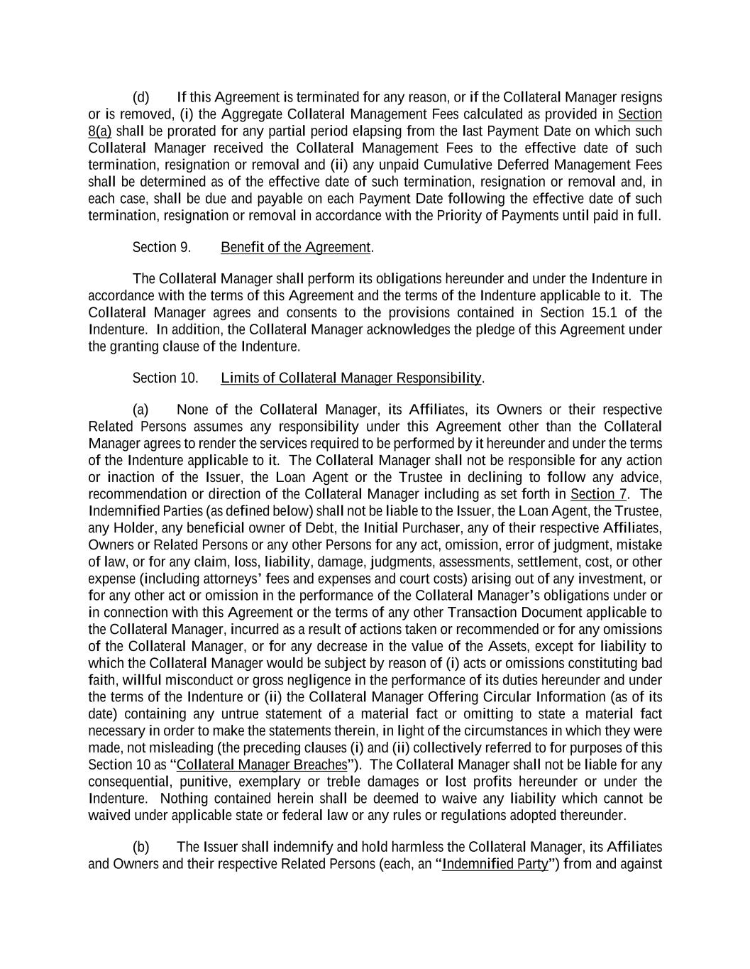 (d) If this Agreement is terminated for any reason, or if the Collateral Manager resigns or is removed, (i) the Aggregate Collateral Management Fees calculated as provided in Section 8(a) shall be prorated for any partial period elapsing from the last Payment Date on which such Collateral Manager received the Collateral Management Fees to the effective date of such termination, resignation or removal and (ii) any unpaid Cumulative Deferred Management Fees shall be determined as of the effective date of such termination, resignation or removal and, in each case, shall be due and payable on each Payment Date following the effective date of such termination, resignation or removal in accordance with the Priority of Payments until paid in full. Section 9. Benefit of the Agreement. The Collateral Manager shall perform its obligations hereunder and under the Indenture in accordance with the terms of this Agreement and the terms of the Indenture applicable to it. The Collateral Manager agrees and consents to the provisions contained in Section 15.1 of the Indenture. In addition, the Collateral Manager acknowledges the pledge of this Agreement under the granting clause of the Indenture. Section 10. Limits of Collateral Manager Responsibility. (a) None of the Collateral Manager, its Affiliates, its Owners or their respective Related Persons assumes any responsibility under this Agreement other than the Collateral Manager agrees to render the services required to be performed by it hereunder and under the terms of the Indenture applicable to it. The Collateral Manager shall not be responsible for any action or inaction of the Issuer, the Loan Agent or the Trustee in declining to follow any advice, recommendation or direction of the Collateral Manager including as set forth in Section 7. The Indemnified Parties (as defined below) shall not be liable to the Issuer, the Loan Agent, the Trustee, any Holder, any beneficial owner of Debt, the Initial Purchaser, any of their respective Affiliates, Owners or Related Persons or any other Persons for any act, omission, error of judgment, mistake of law, or for any claim, loss, liability, damage, judgments, assessments, settlement, cost, or other expense (including attorneys’ fees and expenses and court costs) arising out of any investment, or for any other act or omission in the performance of the Collateral Manager’s obligations under or in connection with this Agreement or the terms of any other Transaction Document applicable to the Collateral Manager, incurred as a result of actions taken or recommended or for any omissions of the Collateral Manager, or for any decrease in the value of the Assets, except for liability to which the Collateral Manager would be subject by reason of (i) acts or omissions constituting bad faith, willful misconduct or gross negligence in the performance of its duties hereunder and under the terms of the Indenture or (ii) the Collateral Manager Offering Circular Information (as of its date) containing any untrue statement of a material fact or omitting to state a material fact necessary in order to make the statements therein, in light of the circumstances in which they were made, not misleading (the preceding clauses (i) and (ii) collectively referred to for purposes of this Section 10 as “Collateral Manager Breaches”). The Collateral Manager shall not be liable for any consequential, punitive, exemplary or treble damages or lost profits hereunder or under the Indenture. Nothing contained herein shall be deemed to waive any liability which cannot be waived under applicable state or federal law or any rules or regulations adopted thereunder. (b) The Issuer shall indemnify and hold harmless the Collateral Manager, its Affiliates and Owners and their respective Related Persons (each, an “Indemnified Party”) from and against