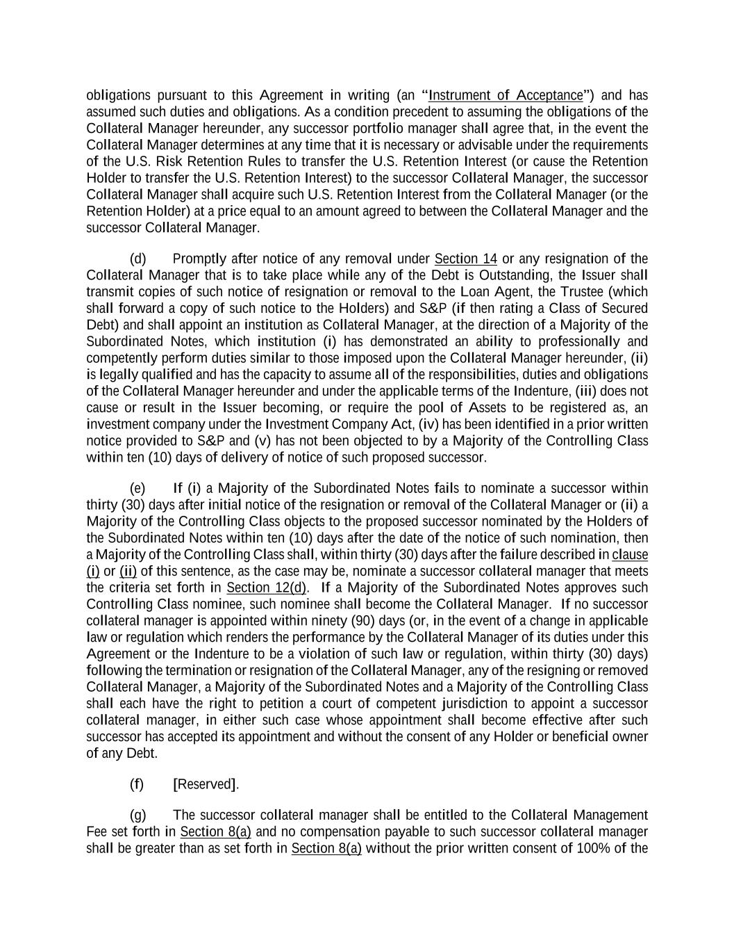 obligations pursuant to this Agreement in writing (an “Instrument of Acceptance”) and has assumed such duties and obligations. As a condition precedent to assuming the obligations of the Collateral Manager hereunder, any successor portfolio manager shall agree that, in the event the Collateral Manager determines at any time that it is necessary or advisable under the requirements of the U.S. Risk Retention Rules to transfer the U.S. Retention Interest (or cause the Retention Holder to transfer the U.S. Retention Interest) to the successor Collateral Manager, the successor Collateral Manager shall acquire such U.S. Retention Interest from the Collateral Manager (or the Retention Holder) at a price equal to an amount agreed to between the Collateral Manager and the successor Collateral Manager. (d) Promptly after notice of any removal under Section 14 or any resignation of the Collateral Manager that is to take place while any of the Debt is Outstanding, the Issuer shall transmit copies of such notice of resignation or removal to the Loan Agent, the Trustee (which shall forward a copy of such notice to the Holders) and S&P (if then rating a Class of Secured Debt) and shall appoint an institution as Collateral Manager, at the direction of a Majority of the Subordinated Notes, which institution (i) has demonstrated an ability to professionally and competently perform duties similar to those imposed upon the Collateral Manager hereunder, (ii) is legally qualified and has the capacity to assume all of the responsibilities, duties and obligations of the Collateral Manager hereunder and under the applicable terms of the Indenture, (iii) does not cause or result in the Issuer becoming, or require the pool of Assets to be registered as, an investment company under the Investment Company Act, (iv) has been identified in a prior written notice provided to S&P and (v) has not been objected to by a Majority of the Controlling Class within ten (10) days of delivery of notice of such proposed successor. (e) If (i) a Majority of the Subordinated Notes fails to nominate a successor within thirty (30) days after initial notice of the resignation or removal of the Collateral Manager or (ii) a Majority of the Controlling Class objects to the proposed successor nominated by the Holders of the Subordinated Notes within ten (10) days after the date of the notice of such nomination, then a Majority of the Controlling Class shall, within thirty (30) days after the failure described in clause (i) or (ii) of this sentence, as the case may be, nominate a successor collateral manager that meets the criteria set forth in Section 12(d). If a Majority of the Subordinated Notes approves such Controlling Class nominee, such nominee shall become the Collateral Manager. If no successor collateral manager is appointed within ninety (90) days (or, in the event of a change in applicable law or regulation which renders the performance by the Collateral Manager of its duties under this Agreement or the Indenture to be a violation of such law or regulation, within thirty (30) days) following the termination or resignation of the Collateral Manager, any of the resigning or removed Collateral Manager, a Majority of the Subordinated Notes and a Majority of the Controlling Class shall each have the right to petition a court of competent jurisdiction to appoint a successor collateral manager, in either such case whose appointment shall become effective after such successor has accepted its appointment and without the consent of any Holder or beneficial owner of any Debt. (f) [Reserved]. (g) The successor collateral manager shall be entitled to the Collateral Management Fee set forth in Section 8(a) and no compensation payable to such successor collateral manager shall be greater than as set forth in Section 8(a) without the prior written consent of 100% of the