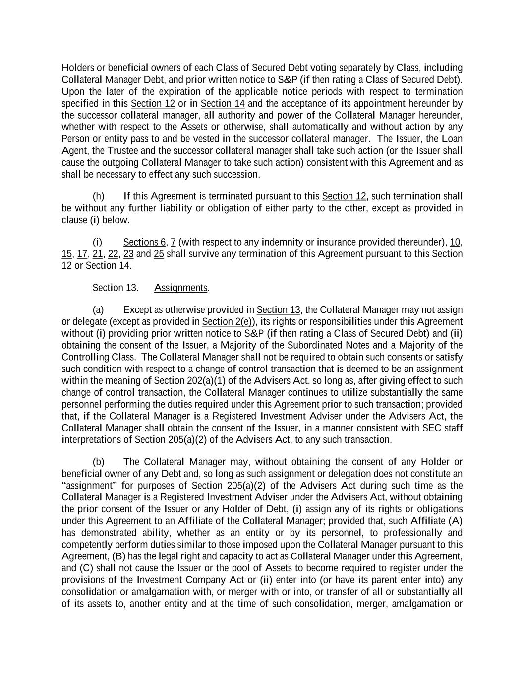 Holders or beneficial owners of each Class of Secured Debt voting separately by Class, including Collateral Manager Debt, and prior written notice to S&P (if then rating a Class of Secured Debt). Upon the later of the expiration of the applicable notice periods with respect to termination specified in this Section 12 or in Section 14 and the acceptance of its appointment hereunder by the successor collateral manager, all authority and power of the Collateral Manager hereunder, whether with respect to the Assets or otherwise, shall automatically and without action by any Person or entity pass to and be vested in the successor collateral manager. The Issuer, the Loan Agent, the Trustee and the successor collateral manager shall take such action (or the Issuer shall cause the outgoing Collateral Manager to take such action) consistent with this Agreement and as shall be necessary to effect any such succession. (h) If this Agreement is terminated pursuant to this Section 12, such termination shall be without any further liability or obligation of either party to the other, except as provided in clause (i) below. (i) Sections 6, 7 (with respect to any indemnity or insurance provided thereunder), 10, 15, 17, 21, 22, 23 and 25 shall survive any termination of this Agreement pursuant to this Section 12 or Section 14. Section 13. Assignments. (a) Except as otherwise provided in Section 13, the Collateral Manager may not assign or delegate (except as provided in Section 2(e)), its rights or responsibilities under this Agreement without (i) providing prior written notice to S&P (if then rating a Class of Secured Debt) and (ii) obtaining the consent of the Issuer, a Majority of the Subordinated Notes and a Majority of the Controlling Class. The Collateral Manager shall not be required to obtain such consents or satisfy such condition with respect to a change of control transaction that is deemed to be an assignment within the meaning of Section 202(a)(1) of the Advisers Act, so long as, after giving effect to such change of control transaction, the Collateral Manager continues to utilize substantially the same personnel performing the duties required under this Agreement prior to such transaction; provided that, if the Collateral Manager is a Registered Investment Adviser under the Advisers Act, the Collateral Manager shall obtain the consent of the Issuer, in a manner consistent with SEC staff interpretations of Section 205(a)(2) of the Advisers Act, to any such transaction. (b) The Collateral Manager may, without obtaining the consent of any Holder or beneficial owner of any Debt and, so long as such assignment or delegation does not constitute an “assignment” for purposes of Section 205(a)(2) of the Advisers Act during such time as the Collateral Manager is a Registered Investment Adviser under the Advisers Act, without obtaining the prior consent of the Issuer or any Holder of Debt, (i) assign any of its rights or obligations under this Agreement to an Affiliate of the Collateral Manager; provided that, such Affiliate (A) has demonstrated ability, whether as an entity or by its personnel, to professionally and competently perform duties similar to those imposed upon the Collateral Manager pursuant to this Agreement, (B) has the legal right and capacity to act as Collateral Manager under this Agreement, and (C) shall not cause the Issuer or the pool of Assets to become required to register under the provisions of the Investment Company Act or (ii) enter into (or have its parent enter into) any consolidation or amalgamation with, or merger with or into, or transfer of all or substantially all of its assets to, another entity and at the time of such consolidation, merger, amalgamation or