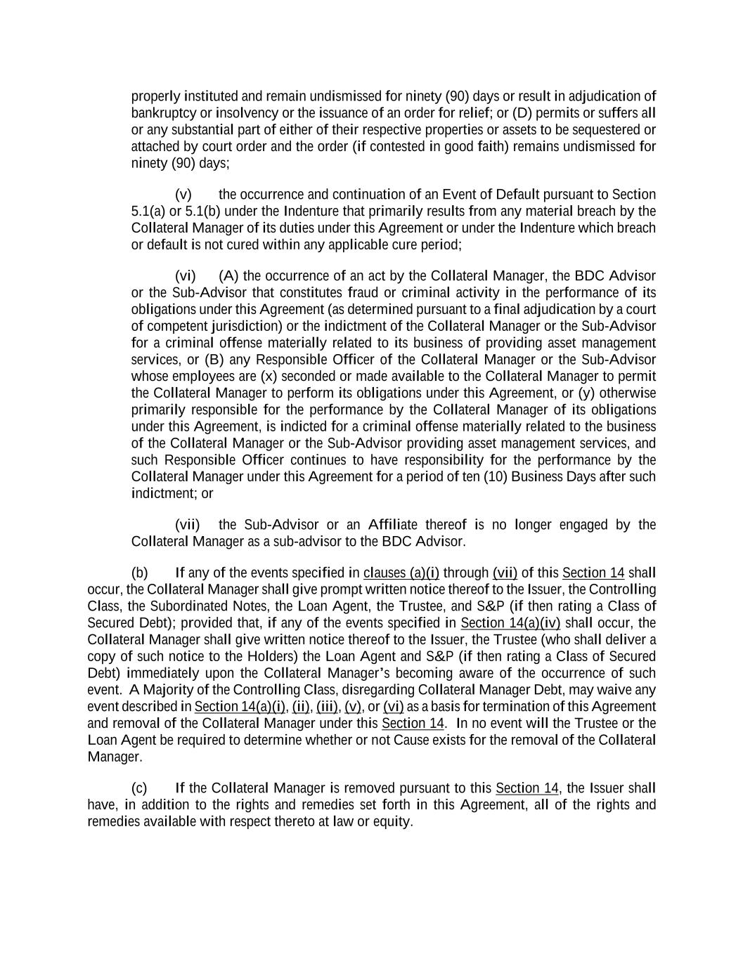properly instituted and remain undismissed for ninety (90) days or result in adjudication of bankruptcy or insolvency or the issuance of an order for relief; or (D) permits or suffers all or any substantial part of either of their respective properties or assets to be sequestered or attached by court order and the order (if contested in good faith) remains undismissed for ninety (90) days; (v) the occurrence and continuation of an Event of Default pursuant to Section 5.1(a) or 5.1(b) under the Indenture that primarily results from any material breach by the Collateral Manager of its duties under this Agreement or under the Indenture which breach or default is not cured within any applicable cure period; (vi) (A) the occurrence of an act by the Collateral Manager, the BDC Advisor or the Sub-Advisor that constitutes fraud or criminal activity in the performance of its obligations under this Agreement (as determined pursuant to a final adjudication by a court of competent jurisdiction) or the indictment of the Collateral Manager or the Sub-Advisor for a criminal offense materially related to its business of providing asset management services, or (B) any Responsible Officer of the Collateral Manager or the Sub-Advisor whose employees are (x) seconded or made available to the Collateral Manager to permit the Collateral Manager to perform its obligations under this Agreement, or (y) otherwise primarily responsible for the performance by the Collateral Manager of its obligations under this Agreement, is indicted for a criminal offense materially related to the business of the Collateral Manager or the Sub-Advisor providing asset management services, and such Responsible Officer continues to have responsibility for the performance by the Collateral Manager under this Agreement for a period of ten (10) Business Days after such indictment; or (vii) the Sub-Advisor or an Affiliate thereof is no longer engaged by the Collateral Manager as a sub-advisor to the BDC Advisor. (b) If any of the events specified in clauses (a)(i) through (vii) of this Section 14 shall occur, the Collateral Manager shall give prompt written notice thereof to the Issuer, the Controlling Class, the Subordinated Notes, the Loan Agent, the Trustee, and S&P (if then rating a Class of Secured Debt); provided that, if any of the events specified in Section 14(a)(iv) shall occur, the Collateral Manager shall give written notice thereof to the Issuer, the Trustee (who shall deliver a copy of such notice to the Holders) the Loan Agent and S&P (if then rating a Class of Secured Debt) immediately upon the Collateral Manager’s becoming aware of the occurrence of such event. A Majority of the Controlling Class, disregarding Collateral Manager Debt, may waive any event described in Section 14(a)(i), (ii), (iii), (v), or (vi) as a basis for termination of this Agreement and removal of the Collateral Manager under this Section 14. In no event will the Trustee or the Loan Agent be required to determine whether or not Cause exists for the removal of the Collateral Manager. (c) If the Collateral Manager is removed pursuant to this Section 14, the Issuer shall have, in addition to the rights and remedies set forth in this Agreement, all of the rights and remedies available with respect thereto at law or equity.